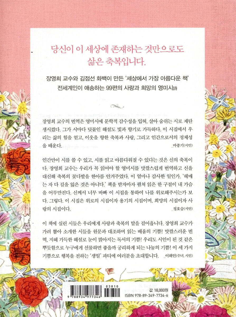세상에서 가장 큰 축복은 희망이라는 깨달음을 주는 『축복』 2004년 9월, 암이 발병하면서 장영희 교수는 기고 중이던 4개의 칼럼 중 3개의 칼럼을 중단했다. 그러나 한 칼럼만은 연재를 이어나갔다. 바로 2004년부터 2005년까지 [조선일보]에 연재한 ‘장영희의 영미시 산책’이다. “영미시 산책은 흰 벽으로 둘러싸인 좁은 공간에서 바깥 세상으로 나가는 단 하나의 통로이자 새로운 생명의 힘을 북돋아주듯, 영혼의 ‘생일’을 새로 맞이할 수 있는 용기를 주었다”라고 장영희 교수는 고백하기도 했다. 연재가 끝난 이듬해인 2006년 3월, 사랑에 대한 영미시를 골라 엮은 『생일』이 출간되었다. 투병 중에도 혼신의 힘을 다해 써내려간 『생일』은 지난 11년 동안 50쇄를 돌파하며 오랫동안 꾸준히 사랑받았다. 출판사와 저자에게는 독자들의 편지가 쏟아졌다. 발신지는 주로 암 병동과 교도소였다. 이 중 한 통의 편지는 후속작 『축복』 출간에 영감을 선사했다. 『생일』이 출간되고 4개월 뒤인 2006년 7월, 희망을 주제로 한 시를 골라 엮은 『축복』이 출간되었다. 애초에 시집의 제목은 ‘축복’이 아닌 ‘희망’이 될 예정이었다. 그러나 교도소에서 온 편지 한 통이 장영희 교수의 마음을 사로잡았다. ‘선생님, 절대 희망을 버리지 마세요. 이곳에서 제가 드릴 수 있는 선물은 이것밖에 없습니다. 희망을 가질 수 있다는 것, 그것처럼 큰 축복이 어디 있겠어요.’ 축복, 머리 위로 향기로운 폭죽이 터지듯 마음을 기쁘고 설레게 만드는 말이었다고 장영희 교수는 서문에서 말했다. 이렇게 출간된 『생일』과 『축복』은 출판계의 대표적인 베스트셀러이자 스테디셀러였다. 2013년에는 한국출판문화산업진흥원 선정 대학신입생 추천도서로도 선정된 바 있다. ‘진정한 사랑을 깨닫게 해준 책’ ‘희망의 언어로 가득한 책’ ‘어려운 글이 아닌 진심이 느껴지는 책’ ‘영미시와 해설이 함께 있어 쉽게 이해할 수 있는 책’ ‘선물 같은 책’…… 오늘도 인터넷 서점에는 독자들의 서평이 업데이트된다. 원어 시와 번역문을 필사하며 문학의 아름다움을 음미하는 독자도 생겨났다. 출간된 지 11년이 지났지만 두 사람이 전한 사랑과 축복의 메시지는 여전히 현재진행형이다. 본문 1, 2, 3부 생일 : 사랑이 내게 온 날 나는 다시 태어났습니다. 사랑과 축복의 기쁨을 전하는 49편의 보석 같은 시 모음 ‘생일’이라는 제목은 크리스티나 로제티(Christina Rosetti)의 [생일(A Birthday)]이라는 시의 제목과 주제에서 가져왔다. 육체적으로 태어난 생일도 중요하지만, 사랑에 눈떠 영혼이 다시 태어나는 날이야말로 진정한 생명을 부여받는 생일이라는 의미를 담고 있다. A. E. 하우스먼(A. E. Housman)의 이제 막 사랑에 빠진 스물한 살 조카에게 들려주는 시 [내 나이 스물하고 하나였을 때(When I Was One-And-Twenty)]에서는 ‘마음으로 주는 사랑이 늘 대가를 치르’고 그 사랑의 보답이 ‘하많은 한숨과 끝없는 슬픔’ 뿐일지라도 포기하지 말고 끝까지 사랑하라고 말한다. 존 던(John Donne)의 [새 아침(The Good-Morrow)]에서는 진정한 사랑은 ‘서로를 소유하는’ 것이 아니며 ‘각자가 하나의 세계를 가지고 둘이 하나가 되는’ 사랑이라고 한다. 각자 하나이고 함께 하나 되는 사랑을 하고, 사랑한다는 말을 아끼지 않는 ‘두 가지 바보’가 되어보자고 유쾌하게 제안한다. 도로시 파커(Dorothy Parker)의 [더없이 아름다운 장미 한 송이(One Perfect Rose)]라는 시 소개에서는 사랑 담긴 장미 한 송이가 나을까 사랑 없는 리무진 한 대가 나을까 하는 물음에 대해서, 살아보니까 삶은 이거냐 저거냐의 선택이지 결코 ‘둘 다’가 아니라는 현답을 내린다. 사랑하는 사람의 죽음으로 이별하고 힘들어하는 사람들에게는 육신의 죽음이 끝이 아니라는 매리 프라이(Mary Frye)의 시 [내 무덤가에 서서 울지 마세요(Do Not Stand at My Grave and Weep)]를 통해 따뜻하고 속 깊은 위로를 건네기도 한다. 저자가 시를 통해 보여주는 ‘사랑’의 울타리는 남자와 여자의 사랑을 훌쩍 넘어 부모와 자녀, 스승과 제자, 이웃과 친척 그리고 타인에 대한 사랑으로까지 확대된다. 칼릴 지브란(Kahlil Gibran)의 [당신의 아이들은(Children)]을 소개하면서 아이들의 세계를 침범해서는 안 된다는 시인의 말에 저자는 부모들이 ‘죽도록 고생해도 그래도 기쁘게 사는 건 오직 아이들을 위해서인데 내 사랑뿐만 아니라 내 생각도 좀 주면 안 될까요’라고 의뭉스럽게 대꾸하며, ‘어떤 이론도 통하지 않는 게 자식 키우는 일’이라는 소신을 밝히기도 한다. 케빈 윌리엄 허프(Kevin William Huff) [선생님은(Teachers)]이라는 시에서는 선생이라는 직업에 대해 생각해보며 겁이 날 때도 있다고 고백한다. 하지만 지식뿐만 아니라 지혜를, 현실뿐만 아니라 이상을, 생각뿐만 아니라 사랑을 가르치는 그런 선생이고 싶다는 소망을 피력한다. 에밀리 디킨슨(Emily Dickinson)의 [이 세상에는 사랑뿐(That Love Is All There Is)]에는 우리 모두가 함께 타고 가는 인생기차에 사랑의 무게를 골고루 안배해야 기차가 잘 달릴 수 있다고 말한다. 내가 최선을 다했는데도 세상이 받아들이지 않을 때는 꿋꿋이 내 갈 길을 가며 최상의 것을 내