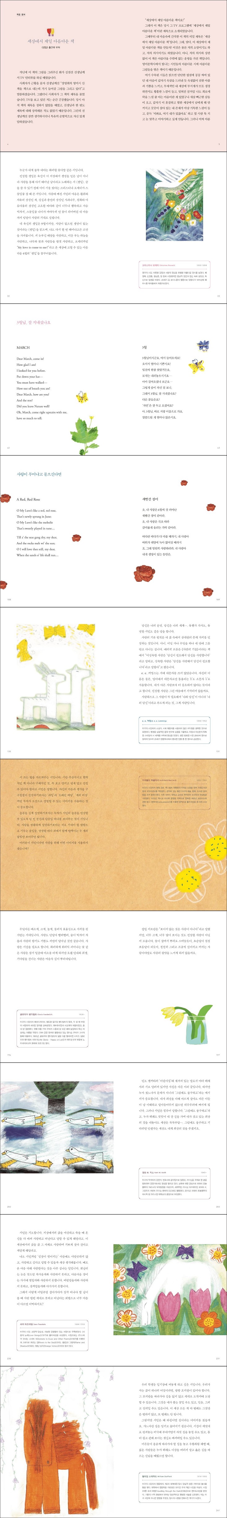 1 생일 / 크리스티나 로제티 내 나이 스물하고 하나였을 때 / A. E. 하우스먼 어른과 아이 / 앤 머로 린드버그 3월 / 에밀리 디킨슨 물물교환 / 새러 티즈데일 무명인 / 에밀리 디킨슨 새 아침 / 존 던 가여워 마세요 / 에드너 St. 빈센트 밀레이 당신이 날 사랑해야 한다면 / 엘리자베스 배릿 브라우닝 J. 앨프리드 프러프록의 연가 / T. S. 엘리엇 음주가 / 윌리엄 버틀러 예이츠 소네트 29 / 윌리엄 셰익스피어 다름 아니라 / 윌리엄 칼로스 윌리엄스 이 세상에는 사랑뿐 / 에밀리 디킨슨 당신은 어느 쪽인가요 / 엘러 휠러 윌콕스 제니가 내게 키스했다 / 리 헌트 그는 하늘의 천을 소망한다 / 윌리엄 버틀러 예이츠 2 슬픈 장례식 / W. H. 오든 밤엔 천 개의 눈이 있다 / 프랜시스 W. 부르디옹 새빨간 장미 / 로버트 번스 눈물이, 덧없는 눈물이 / 앨프리드 테니슨 경 그대와 나 / 헨리 앨포드 활짝 편 손으로 사랑을 / 에드너 St. 빈센트 밀레이 더없이 아름다운 장미 한 송이 / 도로시 파커 나는 당신의 마음을 지니고 다닙니다 / e. e. 커밍스 여유 / W. H. 데이비스 찻집 / 에즈라 파운드 과학에게 / 에드거 앨런 포 나무 / 조이스 킬머 내가 좋아하는 요리법 / 헬렌 스타이너 라이스 재산 / 윌리엄 블레이크 그 누구에게 / 조지 고든 바이런 경 사랑은 생명 이전이고 / 에밀리 디킨슨 3 사랑에 살다 / 로버트 브라우닝 그대 떠나야 한다면 / 카운티 컬린 선물 / 새러 티즈데일 내 무덤가에 서서 울지 마세요 / 매리 프라이 열기 / 힐다 두리틀 눈 오는 저녁 숲가에 서서 / 로버트 프로스트 시법詩法 / 아치볼드 매클리시 사랑은 조용히 오는 것 / 글로리아 밴더빌트 그럼에도 불구하고 / 켄트 M. 키스 사랑의 철학 / 퍼시 B. 셀리 나무 중 제일 예쁜 나무, 벚나무 / A. E. 하우스먼 담장 수선 / 로버트 프로스트 사랑의 증세 / 로버트 그레이브스 당신의 아이들은 / 칼릴 지브란 선생님은 / 케빈 윌리엄 허프 기도 / 새러 티즈데일 4 희망은 한 마리 새 / 에밀리 디킨슨 삶이란 어떤 거냐 하면 / 윌리엄 E. 스태퍼드 금이라 해서 다 반짝이는 것은 아니다 / J. R. R. 톨킨 인생 찬가 / 헨리 왜즈워스 롱펠로 자녀를 위한 기도 / 더글라스 맥아더 순순히 저 휴식의 밤으로 들지 마십시오 / 딜런 M. 토머스 순수를 꿈꾸며 / 윌리엄 블레이크 깃발을 꺼내라 / 에드거 A. 게스트 나의 노래 / 월트 휘트먼 창가에서 / 칼 샌드버그 쿠이 보노 / 토머스 칼라일 연금술 / 새러 티즈데일 어느 뉴펀들랜드 개의 묘비명 / 조지 고든 바이런 경 암벽 사이에 핀 꽃 / 앨프레리드 테니슨 경 젊음 / 새뮤얼 얼먼 동화 / 글로리아 밴더빌트 5 하늘에 온통 햇빛만 가득하다면 / 헨리 밴 다이크 인생 / 샬럿 브론테 고귀한 자연 / 벤 존슨 체로키 인디언의 축원 기도 / 체로키 인디언 가지 못한 길 / 로버트 프로스트 끝까지 해보라 / 에드거 A. 게스트 참나무 / 앨프리드 테니슨 경 인생 거울 / 매들린 브리지스 무엇이 되든 최고가 되어라 / 더글러스 맬럭 굴하지 않는다 / 윌리엄 어니스트 헨리 다시 시작하라 / 도로시 파커 아버지의 조건 / 작자 미상 부귀영화를 가볍게 여기네 / 에밀리 브론테 인생은 걸어다니는 그림자일 뿐 / 윌리엄 셰익스피어 초원의 빛 / 윌리엄 워즈워스 아름답게 나이 들게 하소서 / 칼 윌슨 베이커 우렁찬 종소리여 울려 퍼져라 / 앨프리드 테니슨 6 무엇이 무거울까? / 크리스티나 로제티 죽음을 앞둔 어느 노철학자의 말 / 월터 새비지 랜더 황무지 / T. S. 엘리엇 잃은 것과 얻은 것 / 헨리 왜즈워스 롱펠로 자연이 들려주는 말 / 척 로퍼 모든 걸 알면 모든 걸 용서할 수 있을 것을 / 닉슨 워터먼 어머니가 아들에게 / 랭스턴 휴스 도망 / 새러 티즈데일 얼마 후면 / 베로니카 A. 쇼프스톨 템스 강 둑길 / T. E. 흄 지식 / 엘리너 파전 본보기 / W. H. 데이비스 만약에… / J. 러디어드 키플링 눈사람 / 월러스 스티븐스 위대한 사람들 / 랠프 월도 에머슨 죽음이여 뽐내지 마라 / 존 던 이별을 고하며 / 월트 휘트먼 |