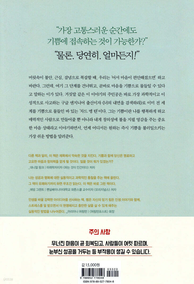 알파고가 이세돌을 이길 수 있었던 까닭은? 알파고와 이세돌 간에 벌어진 세기의 바둑 대결. 모두의 예상을 깨고 알파고가 승리를 거두었다는 소식이 들려왔을 때 사람들은 충격과 공포에 휩싸였다. ‘바둑’이라는 것이 단지 다양한 경우의 수를 가지고 최고의 선택을 내리는 게임일 뿐 아니라, 판을 읽고 흐름을 꿰뚫는 통찰력이 필요한 게임이라는 데서 그 충격은 더했다. 그러면서 알파고처럼 예상을 뛰어넘는 프로그램을 개발해내는 비상한 기업 구글과 그곳의 창의적인 인재들의 비밀에 대해 다시 한 번 커다란 관심이 쏟아졌다. 『기쁨에 접속하라』의 저자 차드 멩 탄은 바로 이 비밀의 단초를 보여주는 인물이다. 구글의 창립 초기 멤버로 모바일 검색엔진 개발을 주도했던 그는 이제 ‘천재 엔지니어’라는 호칭보다 ‘구글의 교육자’ ‘실리콘밸리의 명상가’라는 호칭이 더 어울리는 인물이다. 그가 전 세계적인 석학들과 선승들, CEO들의 도움을 받아 개발한 명상 프로그램 ‘내면검색’은 현재 구글에서 긴 대기자 명단을 갖고 있는 최고의 인기 교육으로 떠올랐다. 흔히 구글 직원들의 행복도와 창의력이 높은 이유를 설명할 때 ‘내면검색’은 첫손에 꼽히곤 한다. 실제로 21세기는 IQ나 EQ가 아닌 MQ(멘탈 지능)의 시대라며, 구글의 승승장구 요인으로 내면검색과 같은 멘탈 교육을 꼽는 전문가가 있을 정도다. Google을 가장 행복한 회사로 만든 사나이 그가 이번엔 전 세계를 기쁨으로 물들인다! 『기쁨에 접속하라』의 저자 차드 멩 탄. 구글의 초기 멤버로 많은 업적을 쌓은 그는 엄청난 성공을 거둔 인물이 분명했지만 자신의 성공이 대체로 운에 의지한 것이라 생각했고, 스스로의 능력을 완전히 신뢰하지 못했다. 담대하기보다는 소심했고, 즐겁기보다는 우울했다. 평상시에도 늘 비참한 기분에 시달렸던 그는 그 스스로 표현했듯 ‘지푸라기라도 잡는 심정’으로 명상을 시작했다. 이후 그의 인생은 송두리째 달라졌다. 절망에서 벗어나 자신감을 얻게 됐고, 감정에 휘둘리는 일 없이 평정심을 갖게 된 것이다. 그는 자신에게 진정한 평화를 안겨준 마음챙김 명상을 더 널리 전파하기로 결심하고, 스탠퍼드 뇌과학자들과 심리학자, 선승, CEO, 구글의 천재 동료 들을 불러모아 현대인들이 쉽게 해볼 수 있는 명상법을 개발하게 된다. 이것이 이른바 ‘내면검색Search inside Yourself’이다. 이 프로그램은 구글의 직원 교육 과정으로 채택되었고, 이 수업에 참여한 이들 대부분이 짧은 시간 안에 놀라운 변화를 경험했다는 증언이 속속 이어졌다. 이에 고무된 그는 더 많은 이들이 내면검색의 효과를 누리도록 하겠다는 일념으로 첫 책 『너의 내면을 검색하라』를 집필했다. 이 책은 출간과 동시에 [뉴욕타임스] 베스트셀러에 올랐고, 우리나라를 포함한 많은 국가에서 장기간 베스트셀러에 오르는 등 뜨거운 지지를 받았다. 명상책도 Google 천재가 쓰면 다르다 명상이 감정 조절이나 심신의 회복에 도움이 된다는 것은 이미 여러 과학적 실험을 통해 널리 입증된 사실이다. 그럼에도 사람들은 명상이라고 하면 흔히 스님이 산속에서 정좌를 한 채 눈을 감고 몇 시간씩 수행을 하는 장면 등을 떠올린다. 명상의 효과라는 게 약간 뜬구름 잡는 이야기라고 여기는 이들도 많다. 그런 이들에게는 이 책이 명상에 대한 편견을 없애주는 데 큰 도움이 될 것이다. 무엇보다 이 책의 저자 차드 멩 탄은 ‘규칙’에 입각해 모든 것을 바라보는, 그러니까 가장 과학적이고 이성적으로 사고하는 엔지니어의 뇌를 갖고 있는 사람이다. 그만큼 그는 이 책을 추상적인 내용보다는 인과관계를 기본으로 명쾌하고 구체적으로 풀어나간다. 그는 앞부분에서 기쁨 명상의 원리와 효능을 설명한 후, 2장부터 본격적으로 명상법을 소개한다. 그것도 의관을 갖추고 시간을 내고 장소를 가려가며 명상을 할 수 없는 바쁜 현대인의 처지를 고려해, 아주 간단하게 언제 어디에서나 할 수 있는 방법들을 알려준다. 이를테면, 화장실에 가는 동안, 밥을 먹는 동안, 버스와 지하철을 기다리는 동안 한 가지에 집중해 아주 편안하게 할 수 있는 명상법 같은 것이다. 그야말로 ‘숨만 쉴 줄 알면 누구나 할 수 있는 것이 명상’이라는 점을 거듭 주장하는 듯하다. ※ 주의 사항: 무너진 마음이 회복되고, 사람들이 여럿 따르며, 눈부신 성공을 거두는 등 부작용이 생길 수 있음 이번 책은 전작을 읽은 후에도 여전히 명상이 어렵게만 여겨진다는 사람들, 구체적으로 무엇보다 해야 할지 모르겠다는 사람들을 위해 쓰였다. 이번 책에서 그는 가장 고통스러운 순간에도 기쁨을 느낄 수 있는 최고의 방법인 ‘기쁨 명상’에 대해 자세히 소개한다. 기쁨 명상을 제대로 해낸 사람은 괴로움을 느낀다 해도 곧 감정을 추스르고 회복할 수 있게 된 것은 물론, 고통이라는 감정과 기쁨이라는 감정을 동시에 느끼는 경지에 도달하게 된다. 그에 따르면, “고통과 기쁨은 공존할 수 있다.” 놀라운 사실은 기쁨 명상이 바꿔놓는 게 단지 마음 상태만이 아니라는 점이다. 저자를 포함한 대부분의 명상 수행자들은 명상으로 인한 마음의 평화가 긍정적인 부작용(?)을 불러