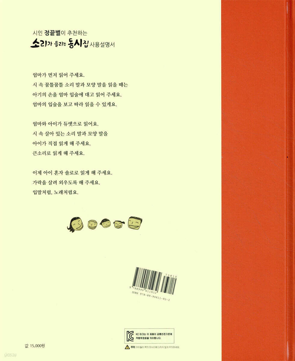 좋은 동시를 소리 내어 읽으면 다양한 우리말 표현을 고루 익힐 수 있어요. 어휘력이 쑥쑥 자라 글쓰기와 말하기에도 도움이 됩니다. 이제 막 한글을 배우기 시작했거나 깨우친 아이들 모두에게 좋아요. ‘좋은 동시’의 대표, 이상교 선생님의 시는 짧고 간단해서 똑 떨어지면서도 동시 특유의 순수함과 재기발랄함이 그대로 살아 있습니다. 특히 소리와 모양을 흉내 낸 말들이 적절하게 녹아 있어서 동시 읽는 재미를 더해 주지요. 흉내말은 표현력과 창의력을 키우는 데에 도움이 됩니다 이 책은 이상교 선생님의 작품 가운데 흉내말이 돋보이는 동시들을 모은 것입니다. 우리말에는 의성어, 의태어라고도 불리는 흉내말이 참 많습니다. 흉내말은 우리말 표현을 풍성하게 하고 감각적으로 만들어 주는 고마운 존재입니다. 많은 흉내말은 우리말의 고유한 특징이기도 하지요. 초등학교 1학년 국어 교과서에서도 흉내말 학습에 많은 부분을 할애하고 있습니다. 말하기, 듣기, 읽기, 쓰기 전반에 걸쳐 흉내말을 익히는 일이 중요하게 여겨집니다. 흉내말이 언어 구사력이나 표현력은 물론 창의력을 키우는 데에도 도움이 되기 때문이에요. 다양한 표현을 접해 본 아이가 자신만의 고유한 표현을 만들어 낼 수 있어요. 자기 생각을 고유한 방식으로 표현할 줄 아는 아이가 창의력이 뛰어난 아이가 아닐까요? “어떤 말은 말랑말랑 부드럽고 또 어떤 말은 딱딱하고 또 노란 빛, 파란 빛, 분홍빛 등 여러 가지 빛깔의 말이 있으며, 비눗방울처럼 동동 떠오르는 말, 돌멩이처럼 가라앉는 말도 있지요. 여러분이 세상 모든 말과 고루 잘 사귀어 도란도란 오랜 친구로 잘 지냈으면 좋겠습니다.” - 작가의 말 가운데 이 책에서는 따로 흉내말에 대해 배울 수 있는 페이지를 중간 중간에 넣어 흉내말 학습을 도울 수 있게 했습니다. 또 책장을 넘기다 보면 나무의 모습이 계속해서 등장하는 것도 볼 수 있을 텐데요, 처음엔 앙상했지만 흉내말이 적힌 잎사귀가 나뭇가지에 하나씩 매달리면서 책장을 모두 넘길 때쯤에는 마침내 잎이 무성한 나무로 자라납니다. 나무와 아이의 말이 모두 자란 거예요. 가족이 함께하는 풍경이 담겨 있는 동시집 동시만 읽어도 재미있지만 거기에 하나 더! 이 책에는 따뜻한 가족의 일상이 담겨 있습니다. 겸이네 가족 이야기가 여러 동시들을 연결해 주는 고리 역할을 합니다. 아침에 일어나 반갑게 해님을 맞이하는 겸이, 음악 시간에 옆 반 여자 아이를 몰래 보는 겸이, 혼자 집 보는 게 외로워 눈물이 맺혔다가 엄마의 쪽지 편지를 발견하곤 기뻐하는 겸이, 동생이랑 엄마 손잡고 가는 시장 나들이, 단란한 저녁 시간, 할머니 댁으로의 휴가 등 곳곳에서 발견할 수 있는 겸이의 모습은 바로 우리 아이들의 일상 속 모습과도 같습니다. 아이들은 책을 읽으며 자신과 닮은 아이의 일상을 발견하고 즐거워 할 거예요. 겸이와 같은 마음이 되어 더욱 정겹게 시를 대하겠지요. 매 페이지마다 펼쳐지는 아기자기하면서도 세련된 그림들은 아이들의 감성을 자극해 줄, 또 하나의 선물이랍니다. |
