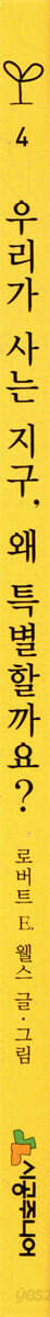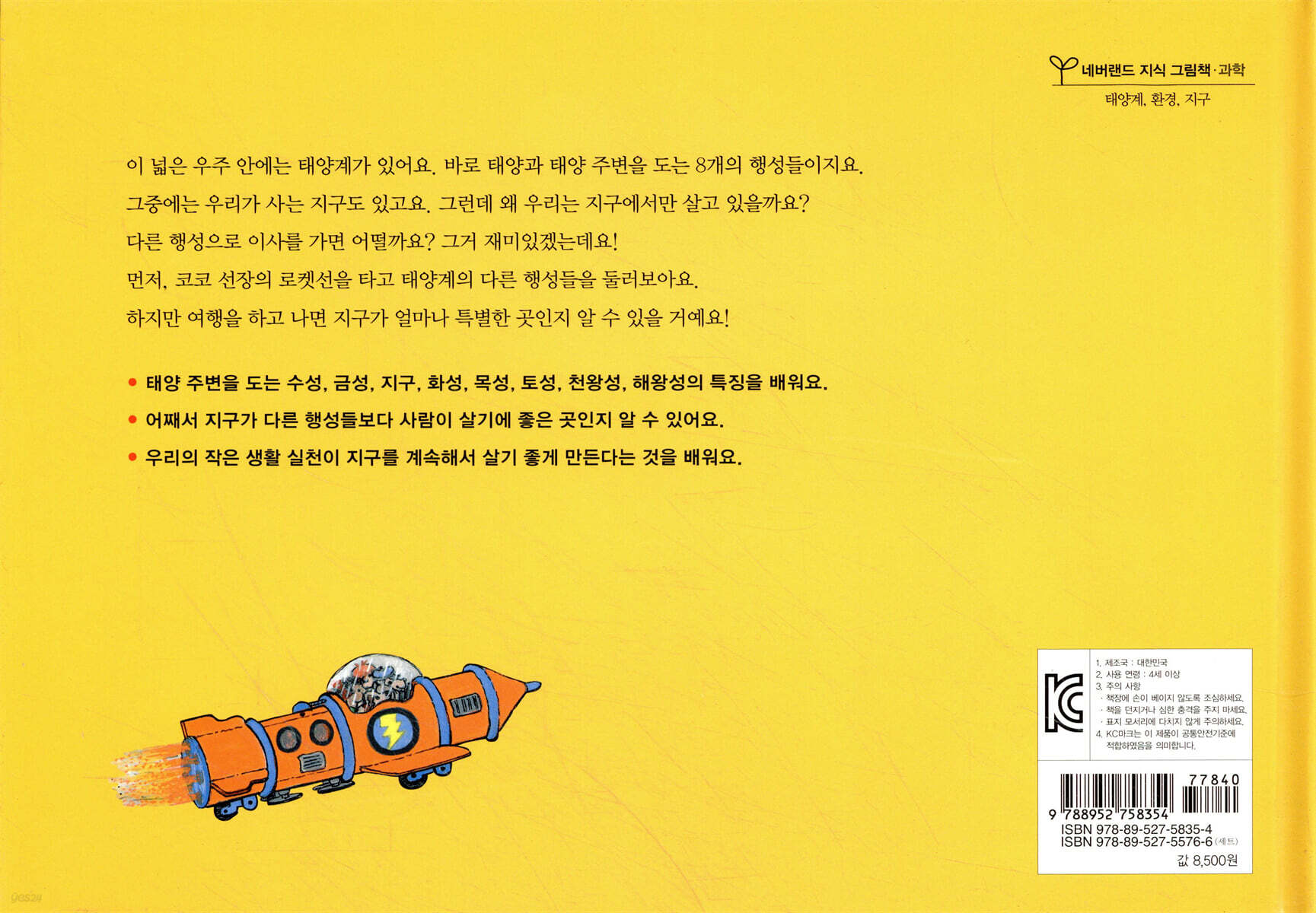 ① 수성 ② 금성 ③ 지구 ④ 화성 ⑤ 목성 ⑥ 토성 ⑦ 천왕성 ⑧ 해왕성 정답은 당연히 3번! 우리가 살고 있는 지구죠. 그런데 이상하네요. 태양계에는 지구 말고도 행성이 7개나 더 있는데, 왜 사람들은 지구에서만 살고 있을까요? 그 이유를 찾아 코코 선장과 함께 초고속 로켓선을 타고 태양계 여행을 시작해 보아요! 이 넓은 우주 안에는 태양계가 있어요. 바로 태양과 태양 주변을 도는 8개의 행성들이지요. 그중에는 우리가 살고 있는 지구도 있고요. 그런데 왜 우리는 지구에서만 살고 있을까요? 다른 행성으로 이사를 가면 어떨까요? 그거 재미있겠는데요! 먼저, 코코 선장의 로켓선을 타고 우리 태양계의 다른 행성들을 둘러보아요. 하지만 여행을 하고 나면, 지구가 얼마나 특별한 곳인지 알 수 있을 거예요! 이 책의 지식 포인트! 태양 주변을 도는 수성, 금성, 지구, 화성, 목성, 토성, 천왕성, 해왕성의 특징을 배워요. 어째서 지구가 다른 행성들보다 사람이 살기에 좋은 곳인지 알 수 있어요. 우리의 작은 생활 실천이 지구를 계속해서 살기 좋게 만든다는 것을 배워요. 우리가 살 수 있는 행성을 찾아라! 우리가 살고 있는 지구는 태양에서 3번째로 가까운 행성으로, 사람들이 살기에 꽤 적합한 곳이다. 하지만 칠레의 대지진이라던가, 아이슬란드의 화산 폭발 등 예상할 수 없는 천재지변으로 사람들을 괴롭히기도 한다. 이럴 땐 정말 ‘지구가 멸망하려나!’ 하는 어처구니없는 말들도 터져 나오고, 다른 곳에 가서 살고 싶어지기도 한다. 그렇다면, 지구 말고 다른 행성에서는 살 수 없을까? 성인이 된 지금까지 외우고 있는 ‘수금지화목토천해’(마지막 행성인 명왕성은 2006년 행성 지위를 박탈당하고 왜소행성이라고 새롭게 분류됨)라는 말이 있다. 이것은 태양과 행성 간의 거리 순서에 따라 나열한 행성들의 첫 글자로, 수성, 금성, 지구, 화성, 목성, 토성, 천왕성, 해왕성을 말한다. 순서와 더불어 간단한 특징들을 배웠던 것도 기억난다. 하지만 무조건 특징들을 외우는 것보다 ‘다른 행성으로 우리가 이사를 갈 수 있을까?’에 초점을 맞춰서 살펴본다면, 이 행성들의 특징이 더 머릿속에 쏙쏙 들어올 것 같다. 태양계의 행성들은 과연 어떤 곳일까? 왜 우리는 그곳에서 살 수 없는 것일까? 이 해답을 찾기 위해 코코 선장의 초고속 로켓선을 타고 태양계를 여행해 보자. 행성들의 특징을 알면 지구가 왜 소중한지 알 수 있다! 코코 선장의 로켓선은 태양에서 가장 가까운 수성부터 여행을 시작한다. 수성, 금성, 화성은 지구처럼 딱딱한 땅이 있어서 일단 착륙은 가능할 것 같다. 하지만 수성에는 태양 빛을 막아 줄 수 있는 대기가 없어서 위험하고, 금성의 대기는 독성이 있어서 숨을 쉴 수 없다. 화성은 우주복을 입고 착륙할 수 있지만, 산소가 거의 없다. 다른 행성들도 들러서 관광을 시도해 보지만, 목성은 딱딱한 곳이 없어서 착륙조차 어렵고, 토성은 너무 춥고 폭풍이 거센데다 기체로 이루어져 살 수가 없다. 천왕성은 42년이나 기다려야 태양 빛을 받을 수 있고, 해왕성은 태양과 멀어서 너무 춥고, 시속 2400킬로미터의 폭풍이 몰아치는 곳이란다. 지구와 똑같이 태양을 돌고 있는 행성들인데, 이렇게 지구와 다를 수가 있을까? 사람이 살 수 있는 곳은 정말 지구밖에 없는 것 같다. 그럼 지구는 어떤가. 지구는 딱딱한 땅이 있어서 마음대로 착륙할 수도 있고, 특수 우주복이 없이도 마음껏 숨을 쉴 수 있다. 또 중력이 적당해서 우리가 땅 위를 걸어다닐 수도 있다. 물의 순환이 이루어져 마실 물도 충분하고, 지구의 대기는 태양 빛 중에서 사람에게 해로운 것을 걸러 내어 우리를 보호해 준다. 또 지구와 태양과의 거리는 1억 4960킬로미터로 알맞기 때문에 지구의 온도가 우리에게 적당한 것이다. 우리의 현재이자 우리의 미래, 지구! 이 책은 태양계의 행성들을 여행하며, 지구가 다른 행성들과 다른 점을 배우고, 지구가 특별한 곳임을 깨닫게 해 준다. 코코 선장과 함께 여행을 마치고 돌아온 독자들은 우리가 지구에 살고 있다는 것을 다행으로 여기게 될 것이다. 특히 결말 부분에서는 우리가 지구를 아끼고 잘 보존하기 위해 할 수 있는 쉽고 간단한 생활 실천을 소개하여, 지식 습득의 과정이 자연스럽게 현실과 이어지도록 엮었다. 천문학자들은 계속 태양처럼 행성을 거느리고 있는 별과 그 주변을 돌고 있을 행성들을 찾고 있다. 어쩌면 가까운 미래에 아주 먼 우주에서, 지구처럼 우리가 살 만한 곳을 발견할 수도 있다는 불확실한 기대감을 가지고 연구는 계속되고 있다. 하지만 우리에게는 아주 확실한 한 가지 사실이 있다. ?리에게는 이미 우리에게 너무 잘 맞는 행성, 지구가 있다는 것이다! 그리고 우리는 현재 그곳에 살고 있다. 우리 모두가 지구를 잘 돌본다면, 아주 특별한 우리 지구는 앞으로도 오랫동안 우리에게 살기 좋은 행성이 되어 줄 것이다. 재밌고 쉽게 지식을 전달하는 ‘로버트 E. 웰스’의 신간 과학자이자 화가인 로버트 E. 웰스는 아이들에게 과학적 지식을 전달하는 책을 20년 동안 만들어 오고 있는 어린이책 작가이다. 그가 얘기하는 과학 이야기 속에는 어린 독자들을 우습게 보는 