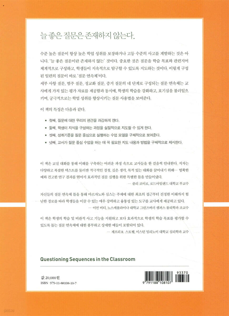 저자 서문 1장 연구와 이론 1. 효과적인 질문의 초기 개념 2. 블룸의 분류법: 잘못 적용된 체계 3. 상위 단계 질문에 대한 연구 4. 현재 우리의 견해 5. 질문 연속체 6. 연구와 이론을 실천으로 옮기기 2장 질문 연속체 1. 질문 연속체 모델 2. 첫 번째 단계: 세부 사항 질문 3. 두 번째 단계: 범주 질문 4. 세 번째 단계: 정교화 질문 5. 네 번째 단계: 증거 질문 6. 질문 연속체의 유연성 요약 2장의 이해도 점검 질문 3장 외부 출처의 정보 1. 언어적 텍스트 2. 비언어적 텍스트 3. 전자 텍스트 4. 다중 텍스트의 정보 요약 3장의 이해도 점검 질문 4장 반응 전략 1. 개별 학생 반응 2. 모둠 반응 3. 모둠 상호작용 요약 4장의 이해도 점검 질문 5장 질문 연속체를 위한 준비 1. 한 차시 수업 내에서의 질문 연속체 2. 여러 차시의 수업에 걸쳐 진행되는 질문 연속체 3. 한 단원의 틀로서의 질문 연속체 4. 질문 연속체로 단원을 계획할 때 고려할 사항 요약 5장의 이해도 점검 질문 저자 후기 부록 A: 이해도 점검 질문에 대한 답 부록 B: 질문 연속체의 예시 |