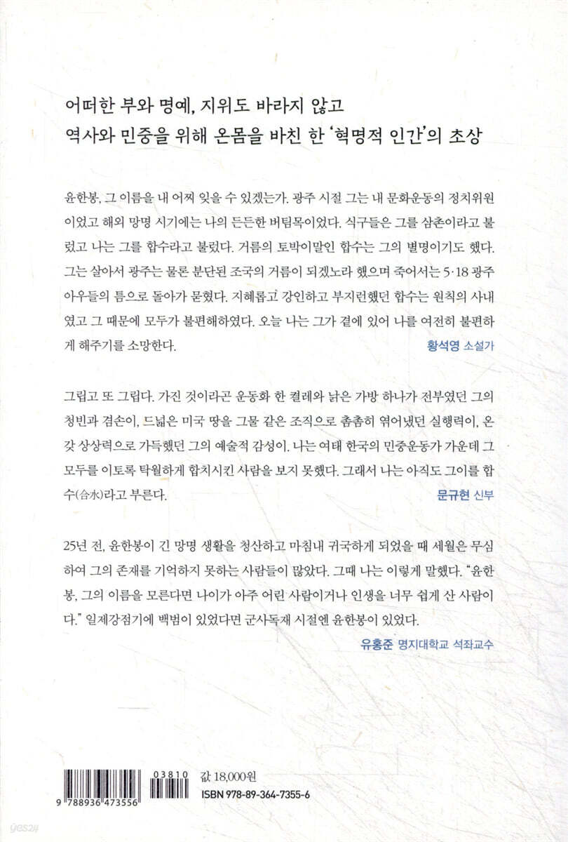 역사와 민중을 위해 온몸을 바친 한 ‘혁명적 인간’의 초상 최근 5·18민주화운동에 대한 수많은 논란과 역사 왜곡 논쟁을 불러일으킨 『전두환 회고록』에서 ‘북한에 이용된다’는 인식을 피하기 위해 거짓 구호를 외쳤던 인물로 지목된 윤한봉. 그 합수 윤한봉의 치열했던 삶을 담은 평전『윤한봉』이 출간되었다. 윤한봉 선생의 10주기를 맞아 기획된 이 책은 유신부터 5·18까지 1970년대 학생운동사에서 가장 핵심적인 위치를 차지하는 인물이자, 망명객 신분으로 미국 내 한인운동의 기반을 만들고 이를 국제연대로까지 발전시킨 세계적인 활동가로서의 진면목이 그대로 담긴 윤한봉의 첫 공식 평전이다. 윤한봉의 엄청난 활동경력에 비해 그를 기억하는 사람은 많지 않다. 오랫동안 해외에서 망명 생활을 한 탓에 잊히고 만 것이다. 이에 대해 미술사학자 유홍준은 “윤한봉, 그의 이름을 모른다면 나이가 아주 어린 사람이거나 인생을 너무 쉽게 산 사람이다”라고 말했다. 하지만 이 땅에 사는 사람이라면 누구나 4·19와 5·18, 6월 혁명을 기억해야 하는 것처럼, 그 역사를 만든 사람들의 이름 또한 잊혀서는 안 된다. 그것이 지금 우리가 『윤한봉』을 읽어야 할 이유이다. 집필은 『파업』, 『황금이삭』, 『경성 트로이카』 등 역사 기록을 엄밀하게 해석하기로 정평이 나 있는 소설가 안재성이 맡았다. 그 덕분에 남녀노소 누구나 쉽고 재미있게 읽을 수 있는 소설 같은 평전이 탄생했다. 현장감을 극대화시킨 생생한 묘사와 캐릭터를 잘 살린 대사 등이 자칫 지루해지기 쉬운 평전 읽기에 흥미를 더했다. 윤한봉의 인생에서 가장 드라마틱한 순간들을 엇갈리게 배치하여 궁금증이 꼬리를 물도록 한 부분은 특기할 만하다. 『윤한봉』은 인간 윤한봉에 대한 가장 완전한 기록이다. 이 책을 기획한 (사)합수윤한봉기념사업회는 매회 20~30명씩, 연인원 250여 명이 참석한 대규모 집담회를 개최하고 시애틀, 시카고, 로스앤젤레스 등 미국 각지에 흩어져있는 50여 명의 관련자를 인터뷰했다. 덕분에 1996년 출간된 윤한봉의 회고록에는 빠져 있던 이후의 행적들이나 당시에는 미처 정리되지 못한 자료들까지 충실히 반영됐다. 이 책에는 윤한봉을 망명길로 내몬 5·18민주화운동은 물론이고, 그를 광주·전남 학생운동의 구심점으로 발돋움시킨 민청학련사건, 그의 운동 경력에서 가장 빛나는 순간이었던 국제평화대행진까지, 윤한봉의 인생을 뒤흔든 굵직한 사건들도 빠짐없이 서술되었다. 덕분에 그의 인생 역정을 가만히 따라가기만 해도 한국 민주화운동의 과정과 실상이 선명하게 들어온다. 6월 항쟁 30주년과 함께 한국 민주주의의 재도약을 앞둔 지금, 역사와 민중을 위해 평생을 바친 한 ‘혁명적 인간’의 삶은 대한민국의 오늘을 만든 수많은 이들의 피와 땀을 떠올리게 하며, 진실로 가치 있는 삶이란 어떤 것인지에 대해 귀중한 시사를 안겨줄 것이다. 한편 (사)합수윤한봉기념사업회는 최근 윤한봉에 대한 『전두환 회고록』의 왜곡 서술을 문제 삼아 명예훼손의 법적 대응을 준비하고 있다. 순박한 시골 청년은 어떻게 ‘반란 수괴’가 되었나? 『윤한봉』은 5·18민주화운동의 마지막 수배자이자 국제연대를 조직한 세계적 활동가, 임수경의 방북과 귀환을 기획한 통일운동가였던 합수 윤한봉 선생의 삶을 충실히 기록한 평전이다. 총 19개의 장으로 구성된 이 책은 내용의 대부분을 운동가로서 그의 활동이 가장 두드러졌던 1971년부터 1993년까지의 이야기에 할애했다. 그 전반부에 해당하는 10년은 늦깎이 대학생으로 전남대에 입학한 윤한봉이 우여곡절 끝에 5·18민주화운동의 주모자로 수배되어 미국 망명을 결심하기까지의 이야기이다. 여기서는 ‘목장 풀밭에서 아내에게 피리 불어주며 조용히 행복하게 사는 게 꿈’이었던 청년 윤한봉이 ‘반란 수괴’로 거듭나는 과정이 흥미롭게 그려진다. 윤한봉이 민주화투쟁을 결심하게 된 계기는 박정희 정권의 유신 선포였다. 라디오를 통해 뉴스를 듣던 윤한봉은 “열불이 치밀어 올라 어쩔 줄 모르다가 방에 돌아와서 펼쳐놓은 책과 영어사전을 볼펜과 연필로 마구 찍어대고 황소처럼 벽을 머리로 들이받으며 고함을 질렀다”고 한다. 또래보다 늦게 운동을 시작한 그가 단숨에 광주와 전라도 지역 책임자로 떠오르게 되는 과정도 상세하게 그려진다. 최소 50만 원은 있어야 한다는 단과대 학생회장 선거에 단돈 700원만 가지고 후배 민상홍을 당선시킨 일부터, 축제장 아이스케키 장사, 목초지 풀베기 등 기발한 아이디어로 활동비를 마련한 이야기, 전국농민쌀생산자대회 참가자들에게 따뜻한 밥을 대접하기 위해 2박 3일 동안 800인분의 밥을 지은 이야기 등은 흥미로울 뿐 아니라 감동적이기까지 하다. 5·18민주화운동을 비롯하여 민청학련 사건, 남민전 사건 등 굵직한 역사의 현장을 생생하게 재현했다는 것도 이 책의 큰 매력이다. 특히 윤한봉이 광주에서 대규모 유혈사태가 벌어질 것을 예견한 1980년 5월 15일부터 계엄군이 도청을 장악한 5월 27일까지의 이야기는 한 편의 영화처럼 긴박하게 전개된다. 초라한 망명객에서 세계적인 활동가로! 윤한봉의 미국 