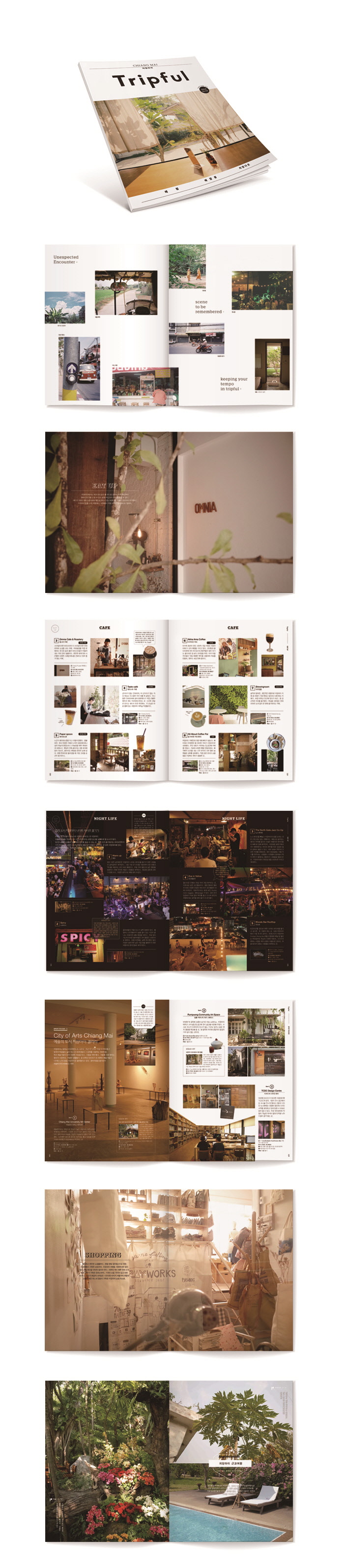 『트립풀』은 ‘여행’을 의미하는 트립(Trip) 에 ‘~이 가득한’이란 뜻의 접미사 풀(ful)을 붙여 만든 합성어다. 낯선 여행지를 새롭게 알아가고 더 가까이 다가갈 수 있도록 도와주는 여행 무크(Mook)지이다. 여행 출판 전문 EASY&BOOKS에서 무크지 『트립풀』을 창간했다. 무크지란 매거진과 북의 합성어로서 잡지와 단행복의 장점을 한데 모은 비정기 간행물이다. 제호 『트립풀』은 ‘BE FILLED WITH TRIP’, ‘당신의 가슴에 여행이 가득하다’라는 의미를 담았다. 여행의 방식은 저마다 다르지만, 한 곳의 여행지에서 자신의 취향대로 보고, 듣고, 즐기면서 여행 그 자체에 집중하길 바라는 마음으로 만들었다. 1. 전 세계 여행자를 이끄는 감각적이고 매력적인 치앙마이 치앙마이에 여행자가 몰려드는 이유는 무엇일까. 비행 시간이 비교적 짧고 물가가 저렴하고 사람들이 친절하다는 점 뿐만 아니라 몇 가지 매력이 더 있다. 보통의 여행보다 예술적 감수성에 영감을 불어넣는 곳. 빡빡한 일상의 답답함에서 벗어나 느릿느릿한 일상의 ‘여유’를 허락하는 곳. 트렌디함과 전통 문화가 조화롭게 융화돼 이국적인 분위기를 자아내는 곳. 바로 이곳이 치앙마이다. 이토록 아름다운 치앙마이로의 여행, 『트립풀 치앙마이』와 함께 떠나보자. 2. 기존 여행 가이드가 보여준 방식을 탈피하다 거의 모든 가이드북의 형식은 여행지에서의 보고, 먹고, 자는 일상을 좀 더 쉽고 편하게 하느냐에 집중돼 있다. 하지만 단 한 번의 여행이라도 각자의 취향대로 다양한 매력을 느끼려는 방향으로 여행의 트렌드는 변화하고 있다. 그 어떤 여행책보다 트렌디한 『트립풀 치앙마이』는 치앙마이의 가장 힙한 스팟부터 현지 로컬에게만 알려진 히든 스팟까지 선별해 세련되고 감각적으로 담아냈다. 빽빽한 텍스트보다 매력적인 치앙마이의 이미지가 먼저 눈에 들어오며, 카테고리별로 모아 둔 스팟 정보를 통해 해당 관심사를 더 깊고 풍부하게 즐길 수 있다. 3. 현지인처럼 가볍게, 트렌디한 여행 『트립풀 치앙마이』의 가장 큰 특징 세 가지는 가볍고, 얇고, 세련된 디자인을 꼽는다. 100페이지 내외의 컴팩트한 분량으로 가볍게 들고 여행할 수 있는 책이다. 여행지의 일상에서 포착할 수 있는 감각적인 장면의 표지 덕분에 소장하고 싶은 욕구를 더한다. 낯선 곳에서 이방인의 여행이 아닌, 현지인처럼 현지인의 삶의 일부를 체험하는 여행일 수 있도록 『트립풀 치앙마이』가 안내한다. 뿐만 아니라 치앙마이에서 ‘한 달 살기’ 컨텐츠를 구성해 살아보는 여행까지 소개한다. |