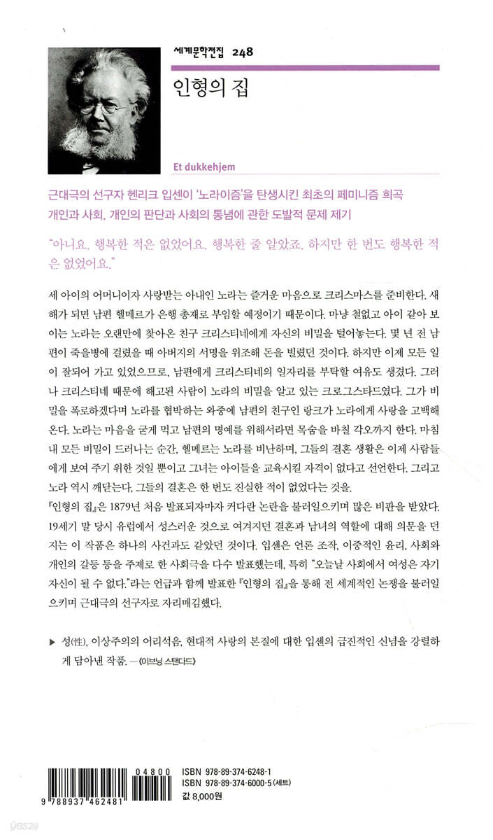 허위와 위선뿐인 ‘인형의 집’을 떠나려는 노라, 근대극의 선구자 헨리크 입센이 ‘노라이즘’을 탄생시킨 최초의 페미니즘 희곡 “오늘날의 사회에서 여성은 자기 자신이 될 수 없다.” 『인형의 집』은 전체 3막으로 구성된 희곡으로, 1879년 덴마크 코펜하겐에서 초연된 이후 전 세계에서 공연되고 있다. 한국에서도 1925년 조선배우학교에서 처음 공연되었다. 근대극의 선구자 헨리크 입센의 대표작 『인형의 집』이 민음사 세계문학전집(248번)으로 출간되었다. 『인형의 집』은 남성 중심 사회에서 자아를 발견하려는 ‘노라’를 등장시킨 최초의 페미니즘 희곡으로 잘 알려져 있다. 결혼과 남녀의 역할에 대해 의문을 던지는 이 작품은 19세기 말 당시 하나의 사건과도 같았으며, 발표되자마자 커다란 논란을 불러일으켰다. 이번에 세계문학전집으로 출간되는 『인형의 집』은 노르웨이어 『인형의 집』을 번역 원전으로 사용하였을 뿐 아니라, 수정되거나 삭제되었던 부분까지 모두 복원한 판본으로 번역하였다. 번역을 맡은 안미란은 소설가이자 번역가인 안정효의 장녀로, 노르웨이어를 비롯하여 13개국의 언어에 능통하며, 현재 이탈리아 라 사피엔차 로마 대학교 강사로 있다. 개인의 선택이 존중받지 못하는 사회에서 발견하는 『인형의 집』의 새로운 가치 노라가 아내나 어머니로서의 역할이 아닌 한 인간으로서의 자신을 찾기 위해 집을 떠나는 것으로 『인형의 집』은 막을 내린다. 그녀는 사회 통념이나 가치관, 법률뿐 아니라, “나는 종교가 뭔지도 제대로 모르겠어요.”라고 말하며 종교에 대해서도 의문을 제기한다. 이로 인해 1879년 처음 이 작품이 발표되었을 때 커다란 논란을 불러일으키며 많은 비판을 받았다. 19세기 말 당시 유럽에서 성스러운 것으로 여겨지던 결혼과 남녀의 역할, 종교 등에 대해 의문을 던지는 이 작품은 하나의 사건과도 같았던 것이다. 그 당시 입센은 언론 조작, 이중적인 윤리, 사회와 개인의 갈등 등을 주제로 한 사회극을 다수 발표했는데, 특히 “오늘날의 사회에서 여성은 자기 자신이 될 수 없다.”라는 언급과 함께 발표한 『인형의 집』을 통해 전 세계적인 논쟁을 불러일으켰다. 이후에도 『인형의 집』은 노라라는 인물과 그녀가 집을 나간 후에 어떤 운명을 맞이했을지를 두고 논의가 지속되어 왔다. 노벨 문학상 수상 작가인 엘프리데 옐리네크는 노라가 바깥세상에서 독립에 실패하는 것으로 그려 화제가 된 바 있다. 『인형의 집』은 입센이 밝힌 대로 여성의 권리와 독립을 주제로 하고 있지만, 그 외에도 개인과 사회, 사회의 통념과 개인의 판단 등에 대해 문제를 제기하는 작품이다. 발표된 지 이미 130년이 넘은 이 작품은 특정 집단이 만든 관습을 모든 개인에게 강요하고, 그것을 따르지 않을 경우 그 사회에서 살아갈 수 없는 현실을 반영한다는 점에서 여전히 새로운 가치를 발견할 수 있다. 노르웨이어 원전을 옮긴 젊고 감각적인 『인형의 집』 『인형의 집』을 번역한 안미란은 소설가이자 번역가로 잘 알려진 안정효의 장녀이기도 하다. 안정효는 『하얀 전쟁』, 『은마는 오지 않는다』, 『헐리우드 키드의 생애』 등 다수의 소설을 발표하고 『최후의 유혹』, 『전쟁과 신부』, 『영혼의 자서전』, 『뿌리』 등 150권가량의 작품을 번역하여 제1회 한국번역문화상을 수상한 바 있다. 독일 킬 대학교 언어학과에서 박사 학위를 받은 한 후 현재 이탈리아 라 사피엔차 로마 대학교에서 강사로 일하고 있는 안미란 역시 덴마크어와 노르웨이어 등 13개국 언어에 능통하다. 헨리크 입센은 노르웨이어로 쓰인 작품이지만 그동안 한국에서 출간된 『인형의 집』은 영어나 일본어 중역이 대부분이었다. 중역을 배제하는 원칙에 따라 민음사에서는 노르웨이어 원전을 직업 번역하여 작가의 의도를 그대로 살려 냈다. 또한 입센의 모든 작품을 수정 없이 원본 그대로 전자 출간한 오슬로 대학의 판본을 원전으로 사용함으로써 작가가 처음 발표했을 당시 그대로의 작품을 한국어로 만나 볼 수 있다. |