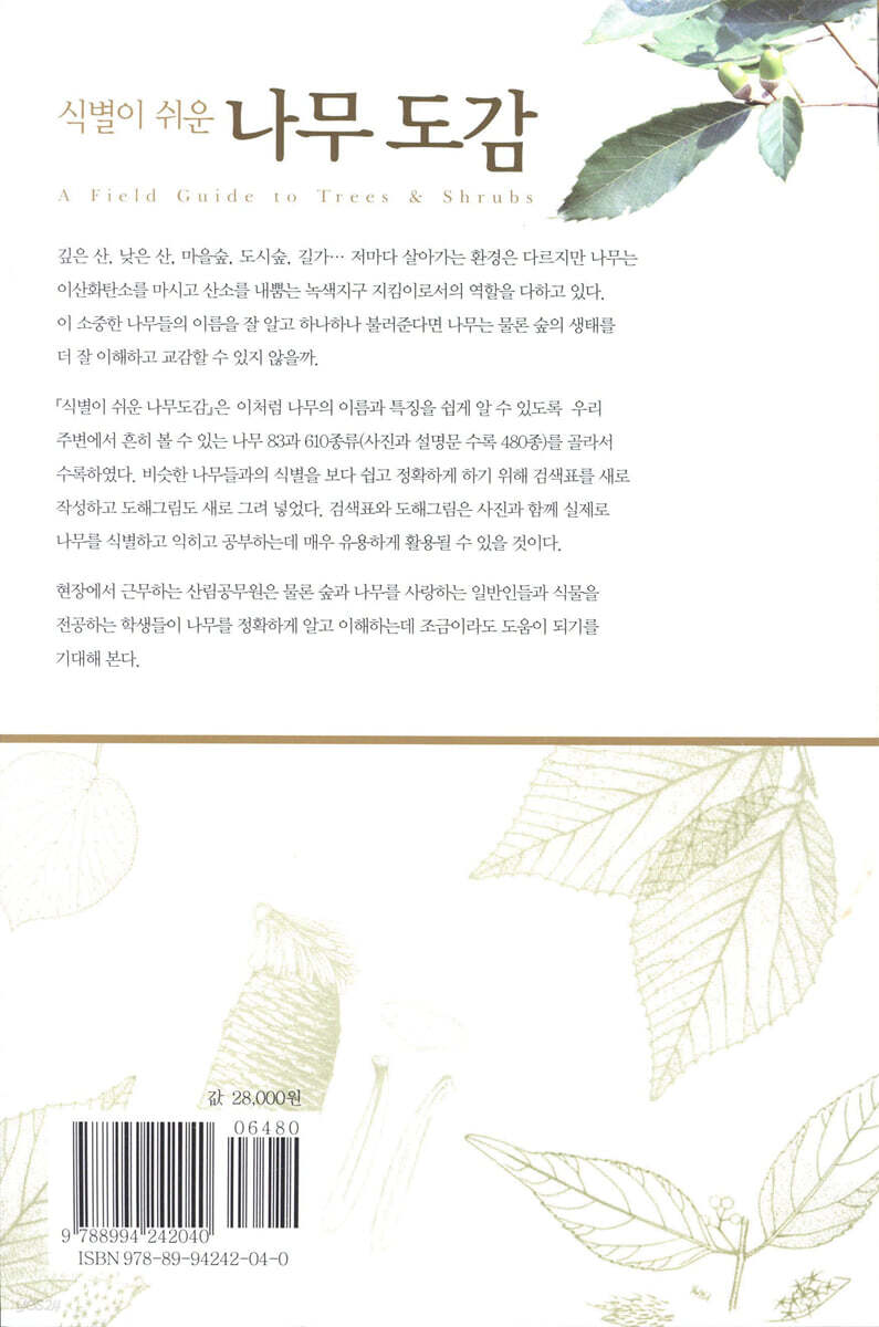 우리나라 산림에서 살아가는 다양한 생물들을 조사, 분류하고 이를 많은 사람들에게 널리 알릴 수 있도록 도감발간 사업을 추진해 오던 국립수목원이 우리나라에 분포하는 약 1,200여 종의 나무 가운데 우리 주변에 자주 볼 수 있는 나무 610여 종을 골라 제작한, 검색표로 쉽게 구별할 수 있는 나무도감이다. 대표수종 480종을 대상으로 사진(수형, 수피, 꽃 열매 등), 기재 및 분포와 용도를 싣고 비슷한 식물에 대한 식별을 쉽게 하기 위해 식별 특성을 도해그림으로 제작해 함께 담고 있다. 수록된 검색표와 도해그림은 사진과 함께 실제로 나무를 식별하고 익히는데 매우 유용하게 활용할 수 있다.