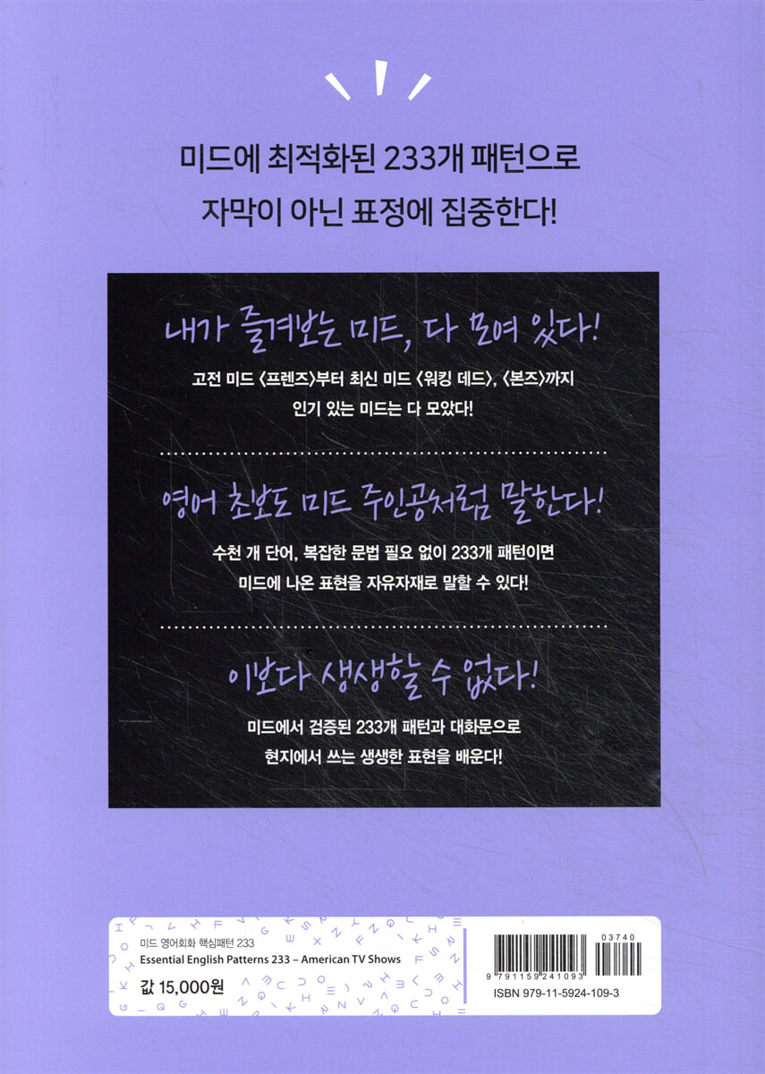 고전 미드 「프렌즈」부터 최신 미드 「워킹 데드」, 「본즈」까지 인기 있는 미드는 다 모았다 영어 초보도 미드 주인공처럼 말한다 수천 개 단어, 복잡한 문법 필요 없이 233개 패턴이면 미드에 나온 표현을 자유자재로 말할 수 있다 이보다 생생할 수 없다 미드에서 검증된 233개 패턴과 대화문으로 현지에서 쓰는 생생한 표현을 배운다 미드로 영어를 제대로 배우려면 어떻게 해야 할까? 모든 언어에는 문장 ‘패턴’이라는 것이 있습니다. 예를 들어 「프리즌 브레이크」에 나온 She didn’t seem like she would betray us.(그녀는 우리를 배신할 것 같지는 않았는데.)나 「섹스 앤 더 시티」에 나온 She didn’t seem like someone he would date.(그녀는 그 남자가 데이트할 상대로는 보이지 않았는데.)라는 대사를 살펴보면 She didn’t seem이라는 말이 공통으로 들어가 있는 걸 볼 수 있습니다. 이렇게 일정한 규칙을 가지고 문장의 기본적인 틀을 형성하는 것이 바로 ‘패턴’입니다. 미드에 자주 나오는 패턴을 익히면 미드 내용을 이해하기가 쉬워집니다. 미드에 자주 나오는 패턴 233개를 뽑고 의미와 쓰임새를 꼼꼼하게 정리했습니다. 핵심패턴 한 개만 익혀도 여러 드라마에서 그 패턴을 알아들을 수 있으니, 미드의 내용을 이해하기가 훨씬 수월할 것입니다. 학창 시절에 배운 기본 동사부터 시작하니 부담이 없다. 미드에 나오는 대사는 너무 빠르고 어렵다고요? 대화가 빠르게 진행되고 때로는 문장의 길이가 길어지기도 하여 어렵게 느껴지지만 사실 그 안에 들어 있는 패턴은 단순합니다. ‘원하다’라는 뜻의 want, ‘좋아하다’는 뜻의 like 등등 중학교 때 배웠던 기본 동사로 구성된 패턴이 많아 부담 없이 공부를 시작할 수 있죠. 고전부터 최신 미드까지, 살아 있는 영어를 익힌다 「프렌즈」, 「사인필드」 같은 고전 미드부터 「미해군범죄수사대」, 「크리미널 마인드」,「모던 패밀리」, 「슈츠」, 「워킹 데드」 등 매 시즌마다 변함없이 사랑받는 인기 미드와 「디스 이즈 어스」, 「리썰 웨폰」, 「비욘드」 등 최근에 방영된 신작 미드까지, 시대와 장르를 아우르는 미드의 대화문을 발췌하여 수록했습니다. 또한 드라마에 자주 나오는 문장으로 연습 문장을 구성했기 때문에 현재 미국인들이 사용하는 살아 있는 영어를 배울 수 있습니다. QR코드를 찍으면 음성강의를 들을 수 있습니다. 본격적인 학습을 시작하기 전에 들으면 학습 효과가 더 높아집니다. 오늘 배울 핵심패턴과 핵심패턴에 대한 소개입니다. 패턴이 어떤 상황에서 쓰이는지 주의해야할 문법과 함께 설명합니다. 미드에서 발췌한 대화문으로 패턴의 쓰임을 파악할 수 있습니다. 어떤 상황에서 패턴이 쓰이는지 확인해 보세요. 우리말 해석을 보고 앞서 배운 패턴을 활용해 영어로 빈칸을 채워 보세요. 빈칸을 채운 후에는 오디오를 들으며 따라해보세요. 잠깐만요 | 어려운 어휘나 표현을 하단에 정리했습니다. Review 복습하기 패턴 10개를 학습할 때 마다 복습할 수 있는 리뷰 코너입니다. 우리말 해석을 보고 앞서 배운 패턴을 활용해 빈칸을 채워 보세요. 오디오를 들으며 소리내 따라하는 것도 잊지 마세요. 정답 및 훈련용 소책자 본책의 정답을 확인할 수 있는 소책자입니다. 따로 들고 다니며 패턴을 연습할 때도 활용할 수 있습니다. |