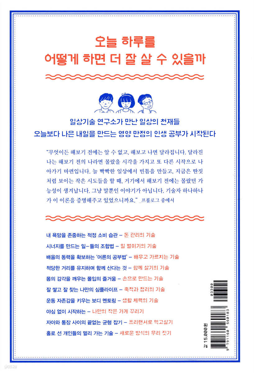 1부 일상생활의 기술 : 돈 관리의 기술부터 생활 체력의 기술까지 1장 내 욕망을 존중하는 적정 소비 습관 * 돈 관리의 기술 돈 사고의 역사 | 자꾸 죄 없는 돈 탓을 하는 이유 | 내 일의 가치 매기기 | 아니, 내 돈이 다 어디 갔지? | 어디에 써야 옳은지는 정해져 있지 않다 | 욕망의 균형점을 찾는 방법 | 돈 쓰는 감각 훈련하기 | 돈 관리의 기술 핵심 정리 2장 시너지를 만드는 일-들의 조합법 * 일 벌이기의 기술 독립출판의 세계 | 야심 없음으로 가능한 것들 | 흥하는 행사의 비밀 | ‘갈증이 날 때’ 일을 벌인다 | 뜻이 맞는 사람을 모으지 않는다 | 겁이 많아서 지속 가능하다 | 일단 ‘폴더’를 하나 만든다 | 조급함을 분산시키는 방식 | 최악을 상상하기 때문에 용감해진다 | 일 벌이기의 기술 핵심 정리 3장 배움의 동력을 확보하는 ‘어른의 공부법’ * 배우고 가르치는 기술 좋은 관객이 필요하다 | 가르침과 배움의 모호한 경계선 | 표현의 즐거움에 눈뜨기 | 맥락을 모르면 고통스럽다 | 슬럼프를 건너는 방법 | 말하기에 익숙해지는 것 | 공부는 어른의 일 | 열려 있는 배움의 생태계 | 콘텐츠 생산자들의 몫 | 배우고 가르치는 기술 핵심 정리 4장 적당한 거리를 유지하며 함께 산다는 것 * 함께 살기의 기술 인생전환학교 | 적당히 벌고 잘 살기 | 개인주의자들이 ‘함께’ 산다는 것 | 돈 문제부터 설거지, 청소, 빨래까지 | ‘나누기’ 시간을 둔다 | 공동주거의 모습도 나이가 들어간다 | 함께 살기의 기술 핵심 정리 5장 몸의 감각을 깨우는 몰입의 즐거움 * 손으로 만드는 기술 ‘만드는 사람’이 되다 | 자립의 감각 | ‘카드 긁기’가 채워주지 못하는 욕망 | 쓸데없는 일을 자신에게 허락하기 | 손으로 만드는 기술 핵심 정리 6장 잘 쌓고 잘 찾는 나만의 심플라이프 * 축적과 정리의 기술 사전은 축적과 정리의 집약체 | 정리는 ‘검색’할 수 있게 만드는 것 | 잉여력은 태양 에너지와도 같다 | 덕질의 커뮤니티 | 쌓고, 관찰하고, 그다음에 정리한다 | 기계의 정리와 인간의 정리 | 정리의 기술은 곧 ‘좋아함’의 기술 | 축적과 정리의 기술 핵심 정리 7장 운동 자존감을 키우는 보디 멘토링 * 생활 체력의 기술 체육 전공생들을 위한 실험실 | ‘헬스장’의 문턱을 없애다 | 운동 자존감 높이기 | 하루를 활기차게 보내는 데 필요한 체력 | 일상을 존중하는 운동 프로그램 | 내 몸을 알아가는 즐거움 | 왜 뻔한 걸 못할까 | 혼자서도 얼마든지 운동할 수 있다 | 아무거나 먹어도 괜찮아요 | 운동과 운동이 아닌 것의 경계를 지운다 | 생활 체력의 기술 핵심 정리 2부 독립생활의 기술 : 직장 밖에서 내 몫의 경제생활을 꾸리는 법 8장 야심 없이 시작하는 * 나만의 작은 가게 꾸리기 인생을 걸고 빵집을 차린다는 생각은 아니었다 | 매장의 위치에 얽매이지 않는 모델 | 인간적인 영업시간 - 지속 가능한 일상 만들기 | 시작의 무게를 줄이기 262 | 내일 장사는 괜찮을까? | 나만의 작은 가게 꾸리기 핵심 정리 9장 자아와 통장 사이의 끝없는 균형 잡기 *프리랜서로 먹고살기 조직생활 부적응자 | 생활의 리듬을 만드는 방법 | 자아를 채우는 일과 통장을 채우는 일 | 어떻게 일감을 딸까 | 리스크 관리는 필수 | 길게 보고 오래 가자 10장 홀로 선 개인들의 멀리 가는 기술 * 새로운 방식의 무리 짓기 노동의 개미지옥에서 벗어나는 길 | 내가 다니고 싶은 직장 만들기 | 사람이 덜어주는 리스크, 사람이 더하는 리스크 | 서로의 필요에 관심 갖기 | 새로운 방식의 무리 짓기 핵심 정리 에필로그 | “오늘 할 일을 마치면 내일 기분이 참 좋을 텐데” _금고문 * 금정연 |