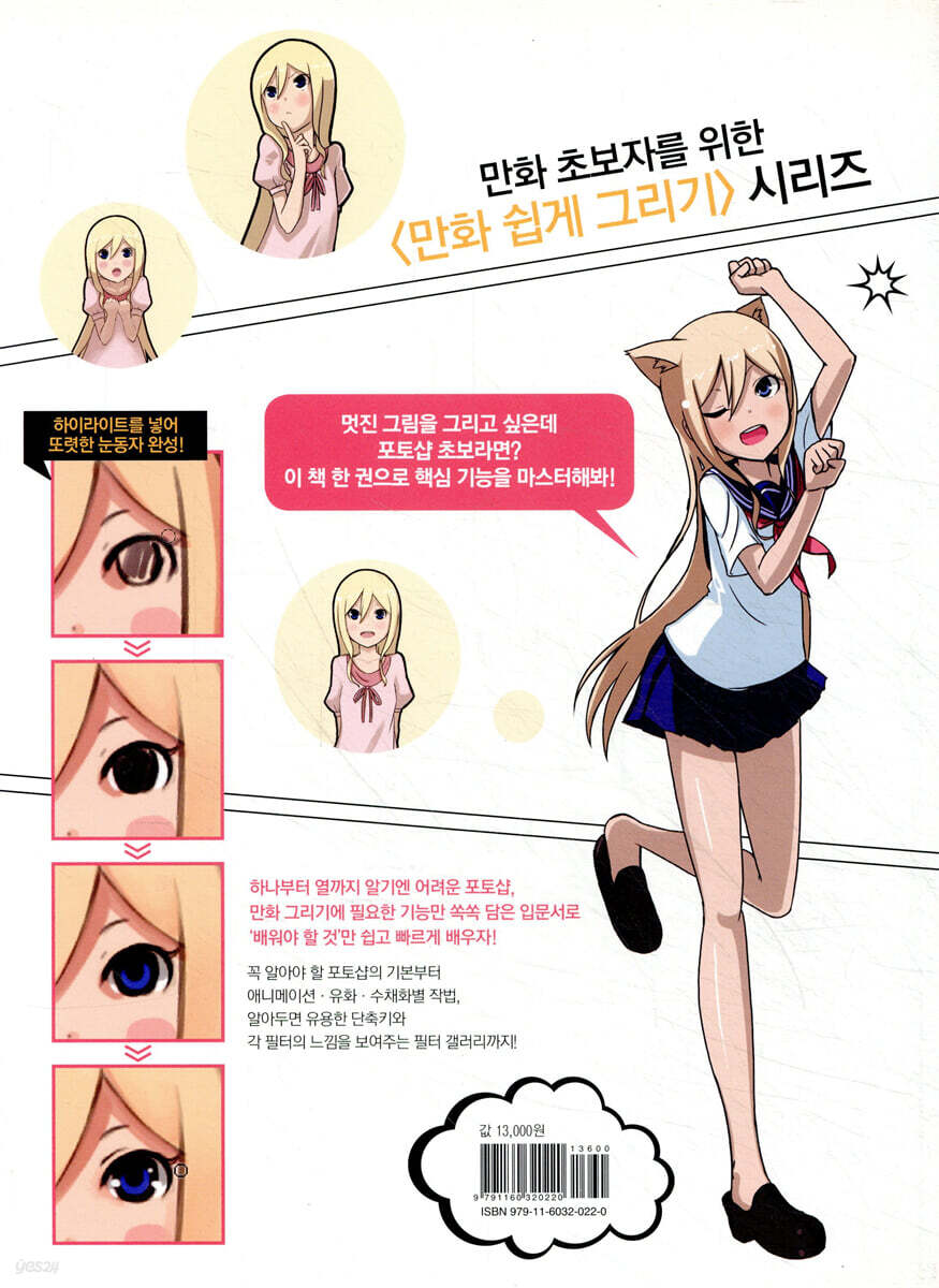 캐릭터 소개 ★ 포토샵의 기본 작업 영역 메뉴바와 옵션바 도구 창 창 그림 도구 사용법 색의 기본과 사용법 표시 설정과 확대/축소 Chapter 1 애니메이션 채색 애니메이션 채색의 특징 선화 작업용 브러시 준비하기 레이어의 기본 뼈대 그리기의 기본 투시도 적용 방법 Section 1 뼈대 그리기 Section 2 러프 스케치 Section 3 선화 작업 Section 4 채색 Section 5 마무리 COLUMN 광원 설정 Chapter 2 유화 채색 유화 채색의 특징 동세 작업용 브러시 준비하기 뼈대 그리기의 기본 안내선 설정의 기본 Section 1 뼈대 그리기 Section 2 동세 잡기 Section 3 러프 선화 작업 Section 4 채색 COLUMN 레이어 모드의 종류 COLUMN 그림자 색으로 인상 바꾸기 Section 5 마무리 COLUMN 알아두면 편리한 단축키 Chapter 3 수채화 채색 수채화 채색의 특징 필터를 사용한 질감 조절 수채화 채색의 기본 러프 스케치를 그릴 때 주의할 점 Section 1 러프 스케치 스캔 Section 2 선화 가공 Section 3 채색 Section 4 채색 레이어 가공 Section 5 질감 조절 필터 갤러리 단축키 일람 |