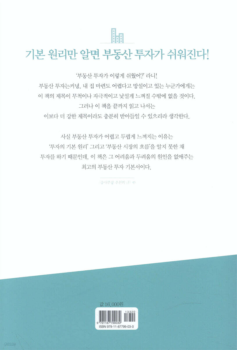 이 책의 제목이 무척이나 자극적이고 낯설게 느껴지는 이들이 대부분일 것이라 생각한다. 그러나 이 책을 끝까지 읽고 나서는 이보다 더 강한 제목도 충분히 받아드릴 수 있으리라. ‘평생 이기는 투자’를 하고 싶다면 기회를 놓치지 말길 바란다. 이 책은 한 번 읽고 덮을 책이 아니다! 최소 3번은 읽고 저자의 노하우를 모두 자신의 것으로 만들어야 할 책이다. 이론과 실전을 겸비한 부동산 투자의 바이블로서, ‘부동산 투자가 쉬워지는 그 날까지’ 실전 투자를 할 때마다 든든한 나침반이 될 것이다. 부동산 투자에도 기본 원리가 있다! 투자 기술 자체보다는 그 기술이 적용되는 원리와 부동산 시장의 사이클을 이해하게 되면 언제, 어디에, 어떤 투자를 해야 하는지 스스로 판단할 수 있을 뿐 아니라 남들보다 빨리 기회를 선점해 차별화된 수익을 낼 수 있다. 특히 부동산 시장을 움직이는 대중의 심리를 읽고 투자에 적용하는 저자의 모습은 매우 인상적이다. |