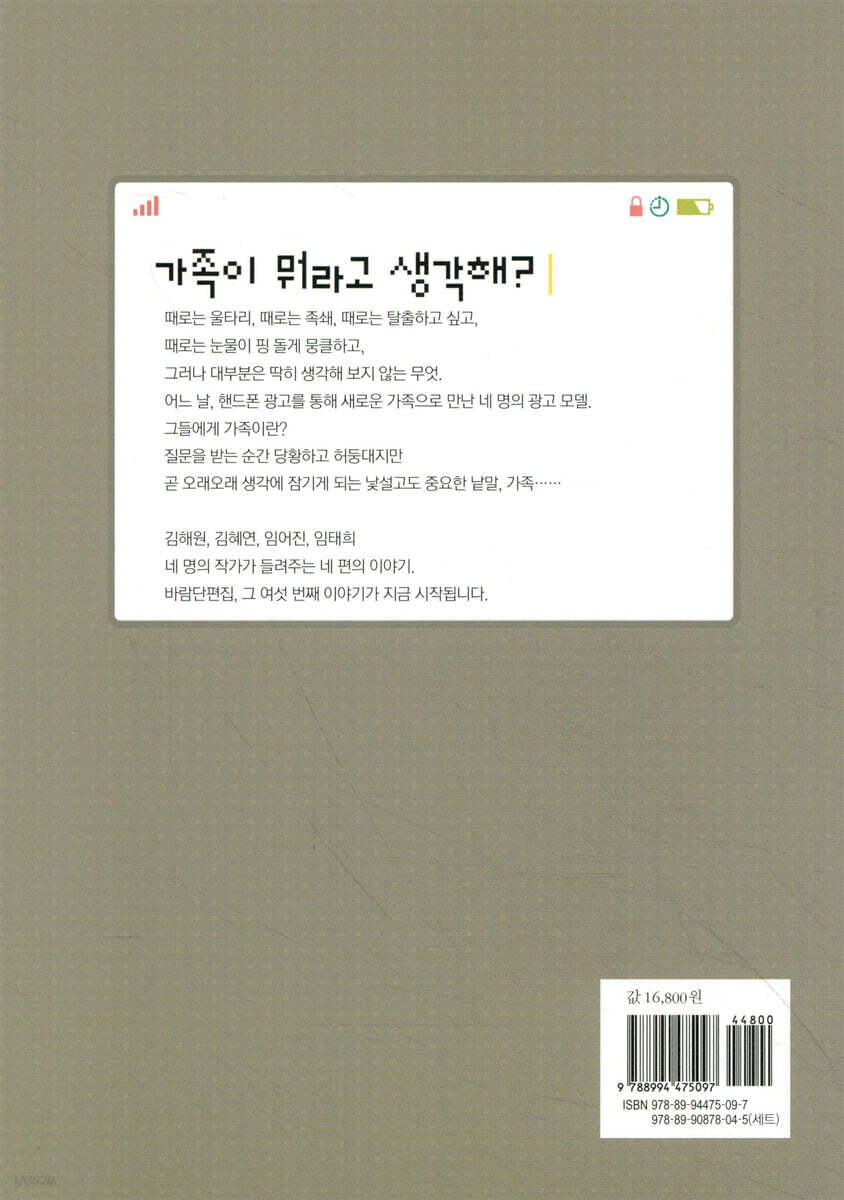 2003년 첫발을 내디딘 출판사 ‘바람의아이들’이 7년 만에 백 번째 책을 출간한다. 일러스트 없이 고학년 동화를 펴내고, 문학성 높은 그림책을 소개하고, 『어느 날 내가 죽었습니다』(이경혜, 2004)를 출간해 우리나라 청소년소설의 본격적인 시작을 알리는 등 지난 7년 동안 바람의아이들이 우리나라 아동문학 출판계에 몰고 온 새 바람은 뚜렷해 보인다. 그러나 역시 가장 두드러지는 것은 신인 작가 발굴이다. 특히 저학년, 고학년, 청소년을 대상으로 지속적으로 출간되고 있는 ‘바람단편집’은 적극적으로 신인들의 작품을 실어 여러 작가들의 등단 무대가 되기도 했다. 『가족입니까』는 바람의아이들이 펴내는 백 번째 책이자 여섯 번째 바람단편집이기도 하다. 바람의아이들에서 첫 책을 냈거나 신인 시절을 함께 한 작가 네 사람(김해원, 김혜연, 임어진, 임태희)이 공동 작업으로 완성한 『가족입니까』는 ‘가족’에 대한 진지한 질문을 던지는 한편, 문학이라는 가장 개인적인 작업도 다른 사람과 어울려 할 수 있다는 것을 보여준다는 점에서 가족에 대한 또 다른 통찰을 담고 있다. 가족이 뭐라고 생각해? 가족에 대해 대답한다는 것은 어려운 수학 방정식을 푸는 것보다도 까다로운 일이다. 어쨌거나 방정식에는 하나의 정답이 있지만 가족에 대해서는 답하는 사람에 따라 제각기 다른 대답이 나올 수 있으므로. 누군가에게는 따뜻하고 평화롭고 안전한 둥지인 가족이 누군가에게는 올가미나 족쇄, 심지어는 조폭처럼 여겨질 수도 있다. 그러니 가족에 대한 정의만큼 보편적인 설명이 불가능한 것이 또 있을까? 모든 사람은 자기 가족에 대해 이야기할 수 있을 뿐, 다른 이의 가족이나 불특정한 가족에 대해서는 말할 수 없다. 그럼에도 불구하고 우리가 가족에 대해서 물어야 하는 이유는 가장 유력한 정답을 고르기 위해서가 아니라 가족의 진짜 의미가 무엇인지 되새겨보기 위해서다. 더욱이 이제 막 가족이라는 울타리 근처 안과 밖 어딘가에서 서성이고 있을 청소년들에게 가족을 묻는 일은 더더욱 중요하다. 『가족입니까』는 네 명의 작가가 각기 다른 주인공을 내세워 쓴 작품집이지만, 이 주인공들은 서로 만나고 교류한다. 이들의 공통분모는 가족을 콘셉트로 한 핸드폰 광고의 모델들이라는 것. 광고 속에서 각각 엄마, 아빠, 아들, 딸을 연기하는 이들에게는 각자의 가족이 있고 각자의 문제가 있고 각자 걸어가야 할 길이 있다. 자신의 꿈인지 엄마의 꿈인지 모를 연예인이 되기 위해 이리저리 끌려 다니는 예린이, 딱히 큰 문제는 없지만 엄마와 자꾸만 어긋나는 재형이, 잘 나가는 독신여성으로 홀어머니와의 관계가 여의치 않은 안지나 팀장, 언제나 퇴근했을 때면 아내와 딸이 집에 있어주길 바라는 박동화 아저씨. 가족의 형태도 다르고 가족에 대해 기대하는 바도 다르지만 이들은 핸드폰 광고를 찍으며 새삼스럽게 묻게 된다. 가족이 뭐지? 가족에게 나는 뭐지? 가족에 관한 네 편의 이야기, 가족을 바라보는 수많은 시선 가족의 기대를 한 몸에 받고 있건 말썽만 안 피면 충분할 텐데 그걸 못해서 불화를 일으키건 십대 아이들에게 가족은 다소 거추장스러운 존재다. 예린이는 과욕에 불타는 엄마만큼이나 고분고분 희생을 감내하는 아빠와 남동생이 부담스럽고, 재형이 역시 자신의 진심을 몰라주는 엄마가 야속하고 사소한 오해 끝에 가출 아닌 가출을 감행하게 된다. 하지만 예린이가 홀로 의상 가방을 챙겨들고 거리로 나섰을 때, 재형이가 혼자 사는 생활을 꿈꾸며 이모네 집에서 살게 됐을 때, 아이들은 좀 더 거리를 두고 가족을 살피기 시작한다. 가족은 공기나 물처럼 결핍의 순간에만 존재감을 드러내는 것일까? 하지만 그보다는 이 아이들이 보다 넓은 시야를 갖게 되었다고 말하는 편이 옳을 것이다. 가족들과 함께 있을 때면 결코 볼 수 없었던 큰 그림을 볼 수 있으니까. 그리고 또 하나, 핸드폰 광고에 등장하는 이상적인 가짜 가족 또한 묘한 생기를 가져온 듯. 광고회사에 근무하는 39살 독신여성 안지나 팀장이나 1인 출판사를 운영하는 박동화 아저씨에게도 서로를 챙겨주는 광고 속 가족은 낯설고 어색하다. 하지만 광고를 찍는 동안 가족은 폭력이고 야만적이라고 생각하는 안지나 팀장도, 아내와 딸을 집에 딸린 부속물처럼 여기던 박동화 아저씨도, 자신을 돌아보고 차츰 잘못을 깨닫게 된다. 진짜를 이기는 가짜의 힘이랄까? 하지만 가족에 관한 한, 진짜와 가짜의 구분은 의미가 없다. 이들 아마추어 모델들이 광고를 찍다 울컥하는 것처럼 모범답안 같은 가족을 볼 때라도 우리가 떠올리는 건 결국 우리 자신의 가족이니까. 『가족입니까』에 실린 네 편의 소설은 핸드폰 광고를 중심으로 연결되어 있는 만귅 한 편의 소설로 읽어도 무방할 만큼 자연스럽게 서로를 넘나든다. 그런데 네 명의 작가가 쓴 작품들이 어떻게 충돌하지 않고 공존할 수 있었을까? 동일한 시공간 안에서 벌어지는 각기 다른 사건들을 다룬 옴니버스 작품들은 많지만, 이렇게 여러 작가가 공동 작업을 하는 경우는 흔치 않다. 각각의 작품 뒤에는 ‘작가의 말’이 붙어 있는데, 거기에는 이 공동 작업