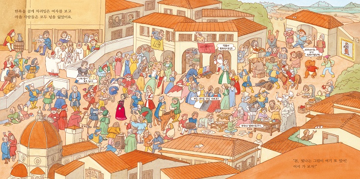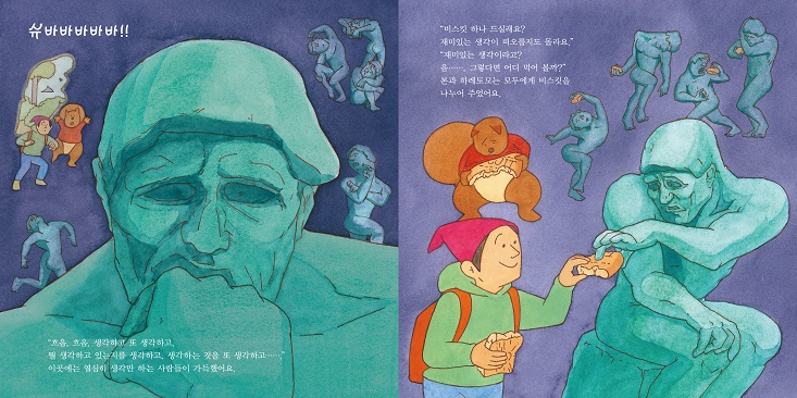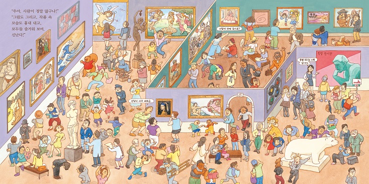“미술 작품을 즐기는 방법은 하나로 딱 정해져 있지 않아요. 잘 모르겠다고 느껴지면 그냥 그 수수께끼를 즐기면 되죠. 미술 작품에는 사람을 감동시키는 요소가 반드시 숨어 있어요. 그런 작품들을 만날 수 있는 장소가 미술관이고, 감동의 요소를 발견하는 것은 바로 여러분의 호기심이랍니다.” - 작가의 말 中 『슈바바바바바 미술관』은 분명한 미술 그림책이지만, 미술 작품에 대해 직접적으로 언급하지 않는다. 로댕의 동상은 ‘아주 깊은 생각에 빠져 있는 사람’으로, 모나리자는 ‘어여쁜 여인’으로 이야기하는 식이다. 하지만 그림책을 보는 독자는 어떤 작품을 말하는 것인지 단번에 알 수 있다. 그림으로 대신 설명해 주기 때문이다. 이 책에서는 글과 그림이 독립적으로 역할을 수행한다. 작가의 위트가 돋보이는 글은 전체적인 스토리를 끌고 가는 역할을 하고, 세밀하게 그려진 그림들은 이에 부가적인 설명을 더한다. 직접적으로 정보를 전달하는 대신, 환상의 요소를 덧입힌 글과 사실적인 정보를 가진 그림을 적절하게 섞어 은근하게 이야기를 건네는 것이다. 때문에 독자는 훨씬 자연스럽고 재미있게 미술에 대해 알아갈 수 있다. 작가가 로댕의 ‘생각하는 사람‘ 에 대해 이야기하는 방식을 살펴 보자. ‘슈바바바바바!’ 재미있는 효과음과 함께 그림 속으로 빨려 들어간 두 주인공은 ‘생각에 생각을 거듭하고, 무엇을 생각하고 있었는지 생각하고, 생각하는 것을 생각하는‘ 동상을 만난다. 이 때 본과 하레토모는 인사 대신 비스킷을 건넨다. 맛있는 비스킷을 먹으면 재미있는 생각이 떠오를지도 모른다는 것이다. 심각한 표정으로 생각에 잠겨 있던 동상은 어느새 행복하게 정원을 질주한다. 모험이 모두 끝난 후, 그림 밖으로 나온 두 주인공은 미술관 작품들에 특별한 변화가 생겼다는 것을 깨닫는다. 로댕의 동상도, 모나리자도, 피리 부는 소년도, 모든 작품이 어느새 즐겁게 웃고 있는 것이다. ‘어쨌든 미술은 즐거운 것’이라는, 작가의 뚜렷한 가치관이 엿보이는 지점이다. 2. 재미있는 스토리에 한 번, 숨은 그림 찾는 재미에 또 한 번! 보고 또 보는 그림책 『슈바바바바바 미술관』의 매력은 여러 번 펼쳐 보아도 질리지 않는다는 점에 있다. 유머러스한 매력이 넘치는 스토리에 한 번, 미술관 곳곳에 숨어 있는 주인공들을 찾는 재미에 두 번, 각종 미술작품의 패러디 요소를 발견하는 즐거움에 또 한 번 펼쳐보게 되는 것이다. 사실 한 권의 그림책을 여러 번 다시 본다는 것은 쉬운 일이 아니다. 지식 그림책인 경우에는 더욱 그렇다. 단순히 정보를 ‘학습‘하기 위해 책을 읽다 보면 쉽게 지루해질 수 있기 때문이다. 하지만 작가는 재기 발랄한 애니메이션의 감독답게, 재미의 요소를 그림책 구석구석 숨겨 놓았다. 북적북적한 사람들 속에 숨어 대화를 나누는 주인공들을 찾는 재미, 미술관 곳곳에 걸려 있는 유명 작품을 알아보는 재미, 이미 알고 있는 예술 작품을 가상의 스토리로 새롭게 만나는 재미 등이 그것이다. 환상과 현실을 넘나드는 스토리에 폭 빠져 단숨에 책을 읽을 수도 있지만, 때로는 책장 한 켠에서 오래 머무를 수도 있는 그림책이다. 3. 때로는 일러스트로, 때로는 애니메이션으로! 팔방미인 아트 유닛의 첫 그림책! 최근 그림책은 하나의 예술 장르로 인정받고 있다. 단순히 종이책으로서 기능하는 것이 아니라, 확장 가능성이 풍부한 예술 장르로서 여러 영역을 자유롭게 넘나들고 있는 것이다. 이제 원화 전시, 애니메이션, 연극, 유튜브 BJ 콘텐츠 등 다양한 방법으로 그림책을 만날 수 있는 시대가 되었다. 『슈바바바바바 미술관』의 원작은 애니메이션이다. 책의 저자는 Uwabami 라는 이름의 아트 유닛으로 일러스트, 애니메이션 제작 등 다방면으로 활동하고 있다. 그래서일까, 이 그림책에는 당장이라도 책 밖으로 튀어 나올 것만 같은 생생한 캐릭터들이 가득하다. 귀여운 먹보 다람쥐 본과 호기심 많은 행동 대장 하레토모는 물론, 가위바위보에 푹 빠진 투텡카멘과 맛있는 쿠키에 즐거워하는 로댕까지 모든 캐릭터마다 톡톡 튀는 상상력이 넘쳐 난다. 뿐만 아니라, 실제 명화를 감상하며 작품에 대한 이해를 높일 수 있도록 도와 주는 QR 영상과 게임 말을 움직이며 놀이 할 수 있는 게임 북도 책 읽는 재미를 더해 준다. 다양한 방법으로 폭 넓게 즐길 수 있는 그림책이다. |