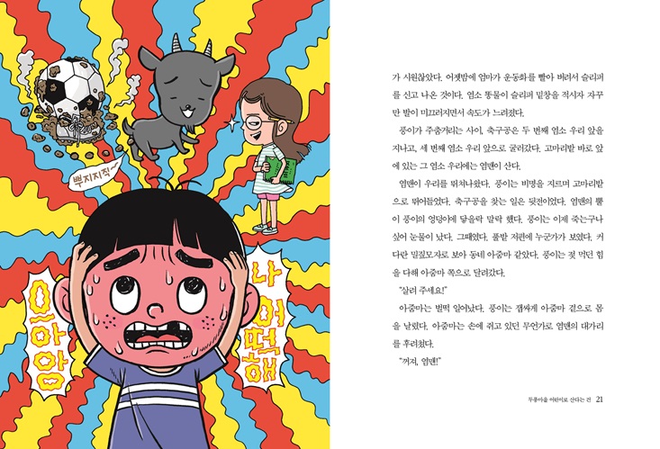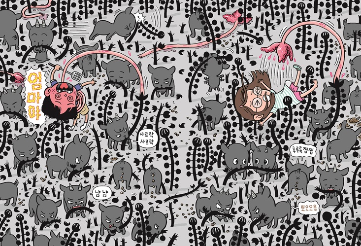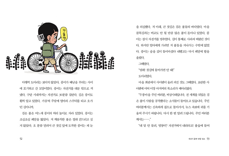 둥글고 희끄무레한 물체들은…… 아그리꼴라들이었다. 사실 놈들에게 ‘아그리꼴라’라는 이름을 지어 준 건 김 사장이었다. 아그리꼴라는 옛날 로마인들이 쓰던 말로 ‘농부’라는 뜻이다. 실제로 놈들은 농부였다. 빛과 물이 넉넉한 행성을 찾아 우주를 떠돌아다니다가, 적당한 행성을 발견하면 터를 잡고 농사를 지었으니까. 한때 김 사장은 아그리꼴라들의 지구 정착을 돕던 연구원이었다. 하지만 놈들의 끔찍한 계획을 알아차리고는 도망쳤다. 그 뒤로는 까치 문방구 김 사장으로 숨어 살았다. 놈들과 싸울 방법을 남몰래 연구하면서 말이다. 하지만 아그리꼴라들이기어이 김 사장을 찾아낸 것이다. --- pp.12-13 어느새 큰 찻길 앞에 도착한 도아리가 풍이를 끌어내렸다. 풍이와 아리는 길바닥에 나동그라지고 자전거는 비탈길을 따라 풀숲으로 굴러 떨어졌다. 그러자 검은 풀의 줄기 끝에서 기다란 촉수가 뻗어 나왔다. 여남은 개의 촉수들이 십 초 가까이자전거를 더듬다가 풀숲으로 다시 사라졌다. 풀의 움직임은 점점 민첩해지고 대담해지고 있었다. 처음엔 움찔거리기만 하던 풀이, 아까는 줄기를 기울이더니, 이제는 줄기 끄트머리에서 촉수를 뻗기 시작했으니까. --- pp.56-57 “안 되겠구먼! 염소들이여! 조상 대대로 내려오는 우리의 힘을 보여 주자. 인간의 옷을 뜯어먹고, 나무 문짝을 갉아먹고, 고무 대야를 뜯어먹으며 단련시킨 우리의 능력을 보여 주자.” 염맨이 소리치자 수백 마리 염소들이 인간만 골라골라 풀을 덮치기 시작했다. 사그락 사그락! 염소들이 풀을 뜯어먹는 소리가 풀숲에 울렸다. 풍이와 아리를 낚아챘던 촉수들도 차츰 힘이 빠지기 시작했다. 촉수들은 풍이와 아리를 바닥에 떨어뜨리고 말았다. 풍이와 아리는 넓적한 잎사귀와 부딪치며 추락하느라 크게 다치지 않았다. 풍이가 겨우 몸을 일으켰을 때였다. --- pp.116-117 |