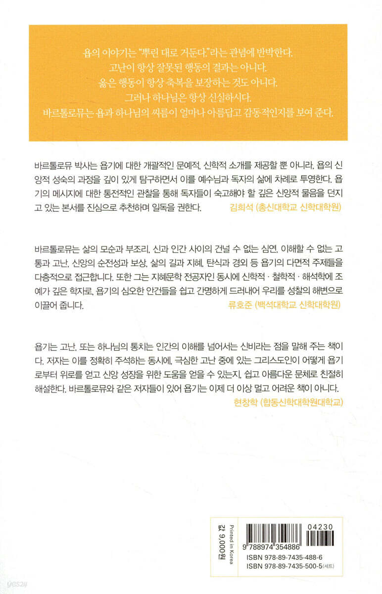 여기서 욥이 가장 두려워하던 일, 그가 무엇보다 애써 피하려 했던 일이 실제로 일어난 것은 그저 무의미한 고난 이상의 의미를 지닌 일이 그에게 벌어지고 있음을 암시한다. 내 친구인 심리학자 브렌다 스티븐슨(Brenda Stephenson)은 이런 고난을 ‘창조적인 고통’이라고 부른다. 이런 명칭이 욥이 겪는 고통의 참혹함을 조금이라도 축소시키는 것은 아니다. 다만 이 명칭이 의미하는 것은 그 지옥 같은 고통 속에서도 변화의 과정이 진행되고 있다는 점이다. 3-41장에서 보게 되듯이, 극심한 고통의 시기는 괴로울 정도로 질질 끌면서 더디게 이어진다. 3-41장을 읽을 때 그 진행 속도가 더디고 반복적이며 다소 지루하게 느껴진다면, 이 책은 바로 그 서술 방식을 통해 독자들로 하여금 그 고통을 느껴 보게 한다는 점을 기억해야 한다. 그 고통은 우리를 기진맥진하게 만들고 지치게 하며, 마치 끝없이 되풀이될 것처럼 느껴진다. 이는 곧 가혹한 고난이다. ---「2장 욥의 초상」 중에서 욥의 발언들은 어떤 성격을 지닌다고 보아야 할까? 그 주된 요소 중 하나는 항변이다. 7:11에서 욥은 이렇게 말한다. “내가 내 입을 금하지 아니하고 내 영혼의 아픔 때문에 말하며 내 마음의 괴로움 때문에 불평하리이다.” 철학자 앨빈 플랜팅가(Alvin Plantinga)에 따르면, 욥의 문제는 두 가지 방식으로 이해될 수 있다. 먼저 일반적인 해석은 지적인 관점으로, 욥은 하나님이 무고 한 사람에게 고통을 허용하시는 이유를 이해할 수 없어서 항변을 제기하고 있다는 것이다. 마르틴 부버(Martin Buber)는 “욥은 하나님도, 그 자신이 아는 진리도 저버리지 못한다.”라고 통찰력 있게 지적했다. 그리고 두 번째 해석은 욥이 하나님이 행하시는 일에 대해 분개하며 그분과 다투고 있다는 것이다. 곧 하나님이 하시는 일에는 합당한 이유가 있을지도 모르지만, 욥은 사실상 이렇게 항변한다는 뜻이다. “나는 그런 이유들에 조금도 신경 쓰지 않습니다. 그저 하나님이 행하시는 일들이 너무 싫을 뿐입니다!” 이 두 반응은 서로 대립하지 않으며, 하나님을 향한 욥의 고통스러운 항변 속에 결합되어 나타난다. ---「4장 하나님에 관한 욥의 견해」 중에서 욥기의 매우 흥미로운 특성 중 하나는 이 책의 대부분을 차지하는 3-41장이 시로 쓰여 있다는 것이다. 3-41장은 이야기체의 산문으로 된 1-2장과 42장의 구조 속에 담겨 있다.…이 점은 시편에서 잘 나타난다. 우리는 하나님에 관해 이렇게 표현할 수 있다. “하나님은 사랑이 많으시고, 그분의 백성을 돌보시는 분이다.” 하지만 시편 23편 말씀처럼 “여호와는 나의 목자시니 내게 부족함이 없으리로다…”라고 고백할 때, 우리는 그 사실을 훨씬 더 생생히 상기하게 된다. 욥기는 최상의 서사 예술 작품으로, 그 대부분이 시로 쓰여 있다는 점에는 중요한 의미가 있다. 시는 욥이 당한 고난의 깊이를 탐구하고 그 상황의 참담함을 상기시킬 뿐 아니라 그 친구들의 발언이 얼마나 무익한지를 드러내며, 위엄 있는 창조주이자 우주의 주권자이신 하나님의 모습을 제시하는 데 매우 적합한 형식이다. ---「5장 시의 힘」 중에서 융뿐 아니라 19세기 덴마크의 기독교 철학자 키르케고르의 관점에서도, 자아가 팽창된 상태에서 소외된 상태를 거쳐 자기와 건강한 관계를 이룬 상태로 나아가는 과정은 고통과 분투를 통해 진행된다. 이는 자아가 본능적으로 그 여정에 저항하기 때문이다. 그리하여 성숙 또는 내적 변화는 바로 자기와의 대면을 의미한다. 이 이론은 욥이 겪는 시련을 이해하는 데 어떤 도움이 될까? 그는 자신이 소중하게 여기던 모든 것을 잃고, 절망과 소외의 상태에 빠져 들어갔다. 만약 융의 관점대로 자기를 으뜸가는 가치로 간주한다면, 무엇이든 그보다 덜한 것들, 곧 팽창된 자아에 밀접히 연관된 가치에 관한 애착에서는 벗어나야만 한다. 이 말은 욥이 참된 신자가 아니었다는 뜻이 아니다. 다만 그는 신자로서 성장하고 발전해 가야 할 필요가 있었다는 것이다. 그는 성화로 불리는 일, 곧 하나님을 닮아 거룩하고 온전하게 되는 일에서 자라가야 했다. ---「6장 욥이 겪은 변화의 여정」 중에서 그러나 이제 욥은 전혀 다른 일을 경험하게 된다. 그의 삶에 최악의 위기가 닥쳐온 때, 곧 그에게 하나님이 가장 절실히 필요했던 그때, 그분이 그와 전혀 함께하시지 않는 것처럼 여겨졌던 것이다! 십자가의 성 요한이 표현한 바에 따르면, 이는 영혼의 어두운 밤이 무엇인지 보여 주는 고전적 사례이다. 그 시기가 임할 때, 우리는 숨 막히는 어둠 속에 있지만 하나님은 그 속에 함께하시지 않는 듯한 상태를 체험하게 된다. 이런 종류의 고통은 통제 불능이다. 우리 각자에게는 하나님 이 고통 가운데서도 함께하시며 그 어려움을 헤쳐 나갈 힘을 주셨던 경험이 있을 것이다. 하지만 욥이 겪는 것과 같은 고통 속에서는 그런 위안이 느껴지지 않는다. 세상은 미쳐 버린 듯하고, 하나님은 우리의 귀한 친구가 아니라 적대자가 되어 버리신 것처럼 여겨진다. ---「8장 독자가 겪는 변화의 여정」 중에서 |