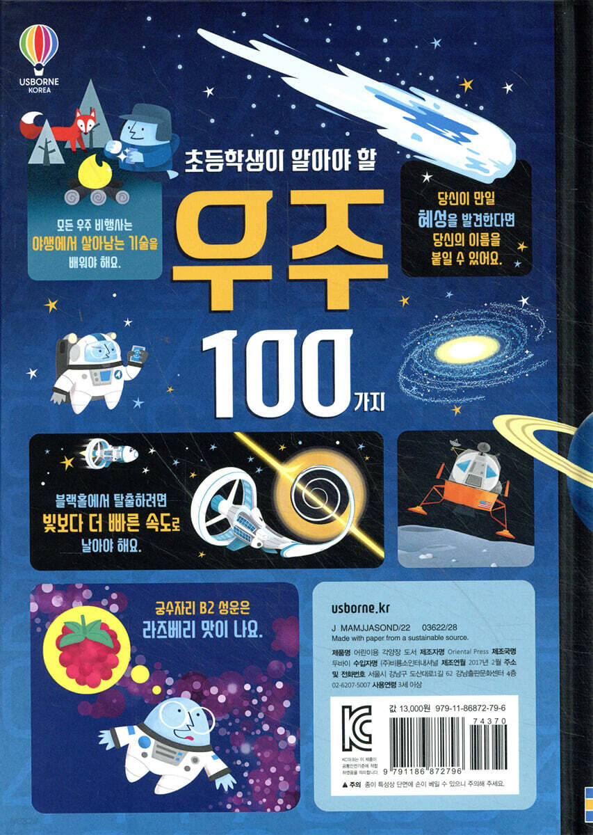 2. 우주는 엄청나게 커요… 너무 커서 얼마나 큰지도 몰라요. 3. 우주 비행사가 되려면… 러시아 어를 할 줄 알아야 해요. 4. 하루에 해가 15번이나 져요… 국제 우주 정거장에서는요. 5. 마야 인에게 금성은… 전쟁을 계획하는 기준이었어요. 6. 누군가가 별이 몇 개인지 세어 봤더니… 밤하늘에 보이는 별은 9,096개였어요. 7. 11개가 더 있었어요… 태양계를 이루는 행성 말이에요. 8. 달을 만든 재료는… 지구에서 왔어요. 9. 우주에서 가장 추운 곳은… 바로 이곳 지구에 있어요. 10. 낮에도 별을 볼 수 있어요… 전파 망원경이 있다면 말이에요. 11. 밤하늘도 빛으로 가득 차 있어요… 하지만 볼 수는 없어요. 12. 물리학 법칙이 맞지 않을 때가 있어요… 바로 우주가 태어나는 순간에 그랬어요. 13. 월식은… 역사의 방향을 바꾸기도 했어요. 14. 태양계의 끝은… 명왕성보다 1,000배나 더 멀어요. 15. 관측 가능한 우주의 끝은… 태양에서 460억 광년 떨어져 있어요. 16. 최초의 우주인은… 초파리들이었어요. 17. 우주 비행사가 코가 가려울 때는… 헬멧 안에 있는 벨크로ⓡ 천 조각에 코를 문질러요. 18. 공룡에게 망원경이 있었다면… 달에서 폭발하는 화산들을 볼 수 있었을 거예요. 19. 우주에 있는 구름 중에는… 라즈베리 맛이 나는 것이 있어요. 20. 달의 병균에 대한 공포 때문에… 아폴로 우주 비행사들은 몇 주 동안이나 갖혀 있었어요. 21. 화성에 있는 로봇은… 생명체의 재료들을 발견했어요. 22. 달에 간 우주 비행사들은… 탐험한 시간보다 쉬는 시간이 더 많았어요. 23. 천문학자들은 외계인들을 찾아요… 방정식을 통해서요. 24. 우주에서 소행성들을 피하는 것은… 사실 그렇게 어렵거나 위험하지 않아요. 25. 최초의 로켓을 만들기 위해서… 베르너 폰 브라운은 로켓에 폭탄을 실었어요. 26. 지구의 모든 생명은 어쩌면… 우주에서 왔는지도 몰라요. 27. 우주의 차원은… 3차원보다 높아요. 28. 나사의 발사체 조립 빌딩은 너무 커서… 이 건물만 날씨가 달라질 정도예요. 29. 우주 정거장과 인공위성들은… 소리보다 빠른 속도로 우주 공간을 움직여요. 30. 우주 비행사들은 떠 있는 것이 아니라… 떨어지고 있는 거예요. 31. 우주에서는 절대로… 후추를 갈면 안 돼요. 32. 태양 안에는 지구가… 100만 개가 넘게 들어가요. 33. 로켓 연료는… 가장 뜨거운 용암보다 두 배나 더 높은 온도에서 타요. 34. 지구의 핵은… 태양의 표면보다 뜨거워요. 35. 우주 탐사 경쟁은… 총탄 없는 전쟁이었어요. 36. 우주에는 스파이가… 쓰레기로 변장하고 있어요. 37. 큰 별 안에는… 작은 별 하나가 숨어 있는 경우가 있어요. 38. 거대한 소행성이 지구와 충돌하는 것은… 시간문제일 뿐이에요. 39. 소행성을 조종하려면… 흰색 페인트를 칠하면 돼요. 40. 달의 먼지는 너무 날카로워서… 우주복을 찢고 들어올 수도 있어요. 41. 사람이 화성에 가기 위해서는… 우주 공간에서 로켓을 만들어야 해요. 42. 화성행 여행에서 살아남으려면… 우주 비행사들은 동면을 해야 할 거예요. 43. 최초의 화성 거주자에는… 농부가 포함되어 있어야 해요. 44. 온난화는 좋을 수도 있어요… 우리가 화성에서 살기로 한다면 말이에요. 45. 열 살 난 소녀가… 죽어 가는 별을 발견했어요. 46. 거대한 행성인 목성은… 점점 작아지고 있어요. 47. 보이지 않는 물질이… 은하들을 서로 붙잡고 있어요. 48. 우주에서 가장 밝은 것과 가장 어두운 것은… 같은 사람이 발견했어요. 49. 우주로 간 최초의 샌드위치는… 호밀 빵 콘비프 샌드위치였어요. 50. 우주 화장실의 비용은… 약 200억 원이에요. 51. 완보동물은… 우주 공간에서 최고로 강인한 생존자예요. 52. 우주에서의 레이저 전쟁은… 어둡고 조용할 거예요. 53. 별자리의 모양은… 착시에 불과해요. 54. 닐 암스트롱의 신발은… 아직도 달에 있어요. 55. 해왕성은 천문학자들이 아니라… 수학자들이 발견했어요. 56. 인치, 온스, 파운드 같은 단위는… 우주선을 추락시킬 수 있어요. 57. 우리는 안드로메다은하와… 충돌하는 길에 있어요. 58. 우주 비행사는 똑같은 물을… 계속 반복해서 마셔요. 59. 우주에는 많은 위험들이 있지만… 어떤 위험이 가장 먼저 다가올지는 아무도 몰라요. 60. 한 학생은 자신의 발견을… 지도 교수에게 도둑맞았어요. 61. 빅뱅이 일으킨 잡음을… 처음에는 비둘기 똥인 줄 알았어요. 62. 천문학자들이 태양을 듣는 까닭은… 태양의 내부를 알고 싶기 때문이에요. 63. 블랙홀에 너무 가까이 다가가면… 스파게티처럼 늘어나요. 64. 달에는 사람이 있고… 토끼도 있고, 개구리도 있어요. 65. 외계인에게 보내는 신호가… 우주로 보내졌어요. 66. 토성은 혜성들을 모아서… 고리로 만들었어요. 67. 태양은 노란색이 아니라… 사실은 밝은 흰색이에요. 68. 오퍼튜니티는 화성에… 통통 취면서 착륙했어요. 69. 아직 아무도… 달보다 더 멀리 가지 못했어요. 70. 화성의 눈은… 육면체예요. 71. 우주 비행사는 무기를 몸에 지녔어요… 늑대나 곰과 싸워 이기기 위해서요. 72. 달에 가기 위해 개발된 기술은… 지금은 집에서도 쓰이고 있어요. 73. 웜홀을 이용하면… 시공간을 통과해 날아갈 수 있어요. 74. 만일 오늘부터 태양이 타지 않는다면… 