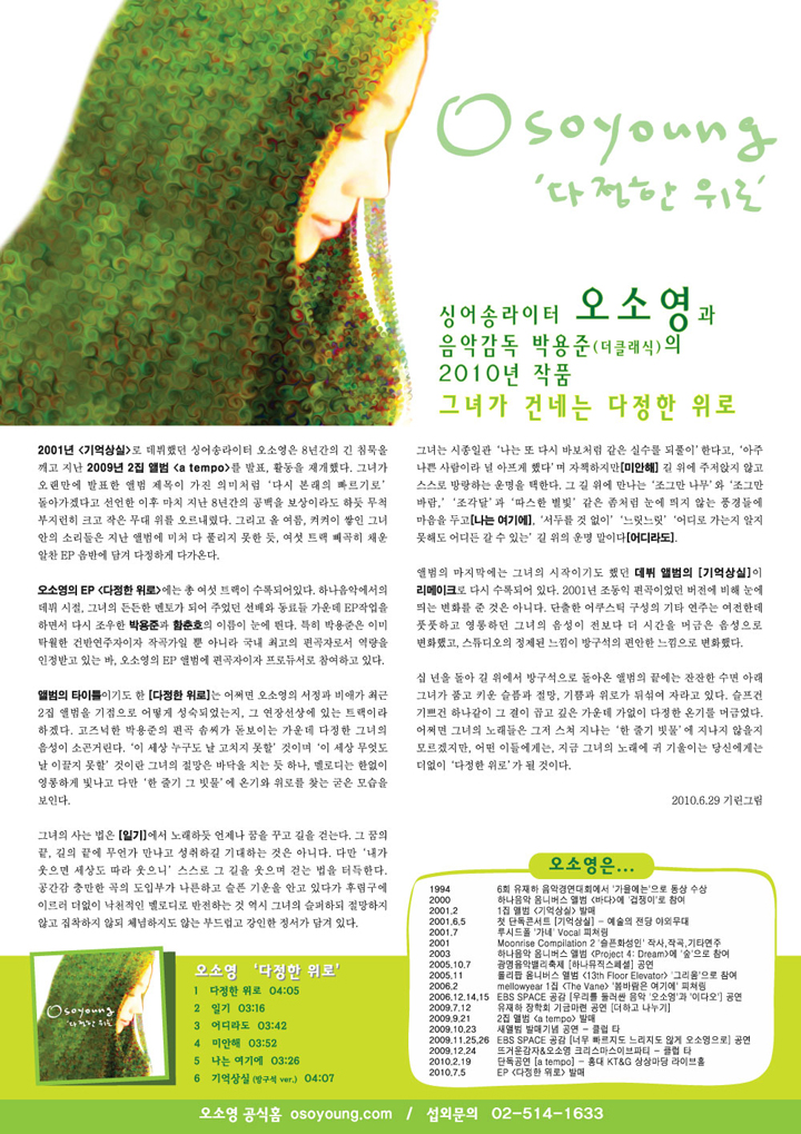 녹음기간 동안 조동진, 한동준, 장필순, 안치환, 시인과 촌장 등의 콘서트에 게스트로 참여하면서 그녀의 이름을 알리기 시작, 2001년 마침내 첫 앨범을 발표하였다. 첫앨범의 타이틀곡인 '기억상실'은 가사에 담긴 독특한 정서와 쉽게 기억되는 멜로디로 오래도록 팬들의 마음에 여운을 남겼다. 그 후로 하나음악 컴필레이션 음반, 문 라이즈 컴필레이션, 롤리팝 옴니버스 등에 참여하거나 루시드폴, Mellow year 와의 피쳐링작업으로 간간히 그녀가 여전히 노래하고 있다는 기척을 보였지만 2집 앨범까지는 꽤 긴 시간을 기다려야 했다. 그 긴 시간, 지난 8년동안 쓰고 지우고 부르고 또 부르던 곡들이 모여, 2009년09월 8년만에 발표된 2집앨범 "a Tempo" 는 그녀를 기억하고 기다렸던 모든 팬들과 평론가, 동료 뮤지션에게 만장일치의 긍정적인 평가와 함께, 많은 매체로부터 큰 호응을 얻었다. 그녀의 음악은 뭐라 말할 수 없는 안타까움이 전체에 걸쳐 느껴진다. 삶에 대한 두려움과 인간관계의 단절 등을 표현함으로써, 그녀는 세상사람들이 다같이 겪고 있을 어쩔 수 없는 부작용들에 대해 함께 살아간다는 동시성을 부여하고 있다. 어쿠스틱 기타 반주에 실려오는 그녀의 얘기는 독자적인 감수성을 부여받은 것처럼, 비유와 상징이 아닌 거침없는 솔직한 말투로, 담담하게 내재된 분노를 뒤로한 채 우리의 가슴깊이 파고든다. 그녀의 음악은 아마도 혼자만의 시간과 공간을 채우고자 하는 대중들에게 자신의 삶을 대변하는 배경음악이 되어줄 것이다. ‘치유의 음악’이라고 불릴 정도로 차분하고 서정적이며 강렬한 에너지를 품고 있는 오소영의 음악을 듣고 있는 이날 공연 관객들의 표정은 꿈속을 헤매는 것처럼 황홀해보였다. 2월 19일, 음험하고 어두운 음악이 기쁨을 창조했다.
