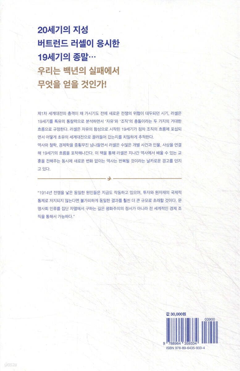 러셀은 이 책 서두에서 역사는 과학이 아니라고 단언한다. 왜곡과 누락을 통해서만 과학이 되고, 법칙이 된다는 것이다. 따라서 러셀은 역사를 필연적 사건의 인과관계로 이해하지 않고, 다양한 가능성과 우연의 연쇄로 흘러가는 거대한 흐름으로 이해한다. 러셀의 목표는 자신만의 역사적 법칙을 발견하는 것이 아니라 세계대전이라는 예견된 재앙의 뿌리를 이해하는 것이었다. 이 책을 통해 러셀은 역사를 이해한다는 것은 현재를 정당화하고 지금 시점에 맞추어 과거를 독해하는 것이 아님을 보여준다. 러셀은 역사를 현재의 원인이자 뿌리로서 이해하고, 현재 중심이 아닌 당시의 관점으로 역사적 사실에 접근한다. 80년 전에 쓰였음에도 러셀의 분석이 그 날카로움이 무뎌지지 않고 생생한 것 역시 이 때문이다. 결국 러셀에게 역사는 단순히 지나간 과거가 아니기에, 러셀은 미래를 위해 과거를 반복하지 않기 위한 실천적 방법으로 역사를 선택한 것이다. 헤겔은 “우리가 역사로부터 배울 수 있는 교훈은 역사로부터 아무것도 배우지 못한다는 것이다”라고 말했다. 헤겔의 말처럼 역사는 반복된다. 과거에서 교훈을 얻지 못하면 또다시 같은 일이 반복된다. 러셀의 경고에도 불구하고 서구는 1차 세계대전을 겪은 지 20여년 만에 2차 세계대전을 치름으로써 다시 한 번 헤겔의 경구를 증명하고 만다. 하지만 더 중요한 것은 한번 반복된 역사는 몇 번이고 반복될 수 있다는 사실이다. 버트런드 러셀은 1차 세계대전 직전의 상황을 다음과 같이 적고 있다. “음주 운전자가 사고를 바라지 않듯이 어느 정부도 전쟁을 바라지 않았다. 그러나 그들은 모두 평화보다 여러 가지의 국가적 이익을 더 크게 바랐다. 누구 탓이냐고 묻는 것은 교통 법규가 없는 시골의 교통사고에서 누구 잘못인지를 묻는 꼴이다. 국제 정부의 부재로 각 나라는 자신들의 명분의 궁극적 심판자였고, 그 때문에 지금도 세계대전의 발생은 이따금 거의 확실한 일이나 다름없다.” 러셀의 불길한 예언은 결국 현실로 이뤄졌고, 세계는 탐욕스런 국가들의 브레이크 없는 충돌로 더 큰 희생을 치렀다. 전후 세계는 또 다른 세계대전을 방지하기 위해 UN을 창설하는 등 노력을 하고 있지만, 다시금 스트롱맨의 시대에 접어들면서 위기를 맞이하고 있다. 그리고 그 중심에 한반도가 있다. 비스마르크가 홀슈타인 지방을 이용해 전쟁을 일으키고 독일을 통일한 것처럼, 이에 자극받은 열강이 발칸 반도를 둘러싼 합종연횡 끝에 마침내 세계대전의 방아쇠를 당긴 것처럼 북한 문제는 21세기 열강들의 최전선에 위치해 있다. 러셀에게 19세기의 역사를 살펴보는 것이 급박한 현실을 타개하기 위한 실천적 방법이었던 것처럼, 『자유와 조직』은 열강들의 최전선에 놓인 한국 독자들에게 시대를 뛰어넘는 통찰을 전해줄 것이다. 1814- 1914, 자유의 함성은 어떻게 전쟁의 비명이 되었는가? 러셀은 이 책에서 나폴레옹이 몰락하고 빈 회의가 열린 1814년부터 제1차 세계대전이 발발한 1914년까지 백 년의 역사를 서술한다. 19세기 유럽과 미국의 역사는 한국 독자에게 일종의 맹점과도 같았다. 근대가 완성된 매우 중요한 시기임에도 나폴레옹과 1차 세계대전이라는 커다란 사건에 가려 크게 주목받지 못했다. 하지만 러셀은 19세기를 현재의 세계를 만든 결정적 백 년으로 이해한다. 러셀은 19세기를 자유와 이성에 대한 무한한 신뢰로 출발했으나 세계대전이라는 초유의 실패로 귀결되고 만 아이러니의 시대로 설명한다. 이 미스터리를 풀기 위해 러셀은 ‘자유’와 ‘조직’을 19세기의 키워드로 선택해서 19세기에 대한 총체적 이해를 돕고자 한다. 현대의 유럽과 미국의 기반이 완성된 백 년간 도대체 무슨 일이 벌어진 것일까? 이 책은 4부로 이루어져 있다. 1부에서는 나폴레옹을 물리친 유럽 열강이 빈 회의에서 새로운 국제질서를 재편하기까지의 과정을 그린다. 러셀은 빈 체제에 대해서 수구반동적이었으며 지역별로 엄청난 폭압이 있었다고 지적한다. 그럼에도 30년 넘게 큰 전쟁 없이 평화를 지속할 수 있게 했다는 점에서 긍정적인 평가를 내린다. 후에 벌어질 세계대전을 생각했을 때 이때 열강이 국제적 협조를 통해 이룬 평화의 가치는 더욱 중요하다고 지적한다. 하지만 그런 빈 체제 역시 결국 1948년 혁명을 기점으로 서서히 무너지게 되는데, 러셀은 이 원동력으로 19세기의 가장 중요한 흐름인 ‘자유’를 꼽고, 그 태동을 설명한다. 2부에서는 영국의 산업혁명과 정치사상을 다룬다. 러셀은 그 자신이 명문 휘그 출신인 점을 십분 발휘해 산업혁명과 이에 대응하는 토리와 휘그의 정치적 변화를 세밀하게 그려낸다. 이를 통해 휘그로 대변되는 정치적 집단과 새로운 산업 자본가 세력이 ‘자유’를 매개로 어떻게 영국을 이끌어갔는지 설명한다. 한편으로는 낭만적이었던 ‘자유’의 개념이 공리주의자들의 ‘정치적 자유’와 자본가들의 ‘경제적 자유’로 분화하는 과정을 통해 이후 벌어질 갈등과 충돌을 예견한다. 또 이후 세계를 격동시킬 공산주의의 탄생을 그리면서 마르크스의 삶과 사상을 연결해 사상적 비평을 시도한다. 3부에서는 장소를 미국