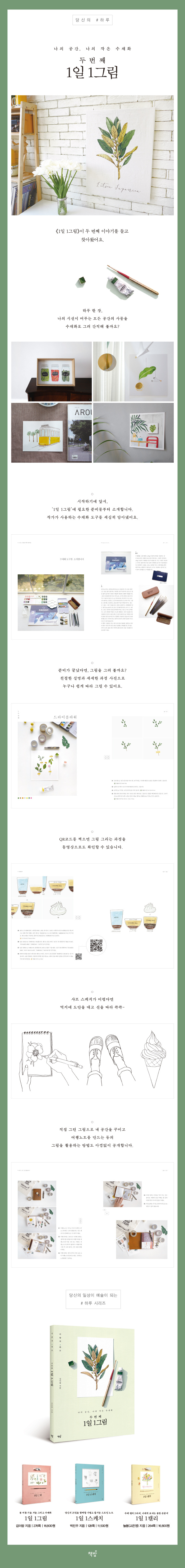1일 1그림을 위한 준비물 1일 1그림을 시작하기 전에 이 책을 보는 방법 내 방에서, 1일 1그림 / 1 모빌 2 드라이플라워 3 캔들워머 4 선인장 5 필기도구 6 쿠션을 얹은 나무의자와 화분 7 책 8 화장품 식탁 위의, 1일 1그림 / 1 조리도구 2 과일바구니 3 아보카도주스 4 접시 5 스테이크 6 양념통 7 커피머신 8 비빔밥 카페에서, 1일 1그림 / 1 비엔나커피 2 크루아상 3 타르트 4 테이크아웃 커피 5 라즈베리에이드 6 카페 7 카페 카운터 8 커피 레시피 공원에서, 1일 1그림 / 1 금계국 2 나뭇잎 3 하늘 4 잔디밭 위의 내 발 5 피크닉바구니 6 그림 그리는 내 손 7 풀숲과 벤치 8 경복궁 처마 여행지에서, 1일 1그림 / 1 여행그림 준비물 2 여행가방 3 여권 4 비행기 창문 5 과일가게 6 라벤더아이스크림 7 트램 8 여행지 자석 내가 그린 그림 활용하기 / 1 내 그림으로 벽 꾸미기 2 여행노트 만들기 3 액자 포장하기 4 홈카페 메뉴판 만들기 5 달력 만들기 도안 |