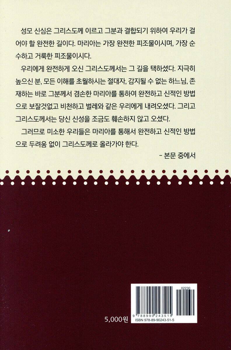 제 1 장 마리아를 통해 다스리시는 그리스도 제 2 장 하느님께 필요한 마리아 제 3 장 인간에게 필요한 마리아 제 4 장 우리의 궁극 목표이신 그리스도 제 5 장 우리의 중개자이신 마리아1 제 6 장 거짓 신심 제 7 장 참된 신심 제2부 제 8 장 예수 그리스도께 대한 완전한 봉헌 제 9 장 완전한 봉사 제10 장 완전한 길 제11 장 완전한 자유 제12 장 비유 제13 장 비유에 대한 해설 제14 장 놀라운 효과 제15 장 외적 실행 제16 장 완덕의 추구를 위한 내적 실행 제17 장 참된 신심의 응용 부록 Ⅰ. 마리아를 통해 강생하신 지혜인 그리스도께 봉헌 Ⅱ. 예수님께 드리는 기도 Ⅲ. 마리아께 드리는 기도 쪵번안자와 이 책에 대하여 |