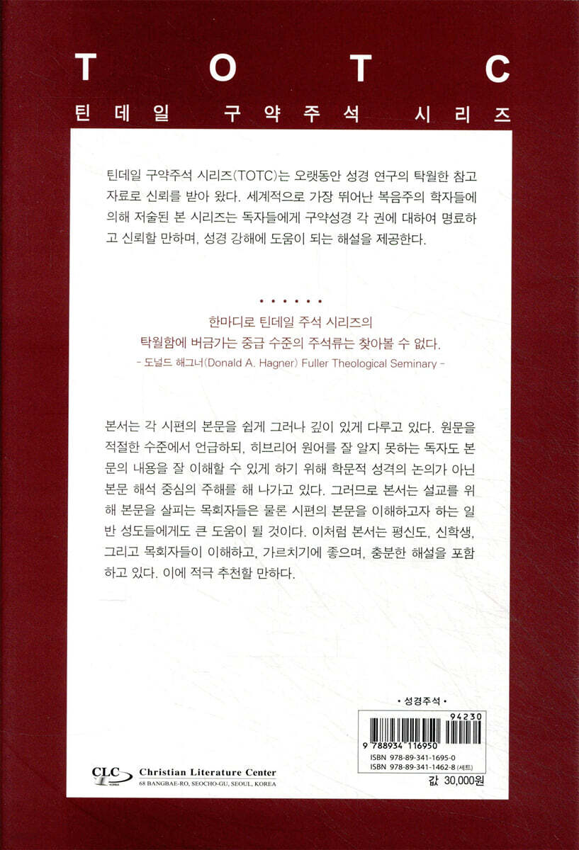 추천사 2(성기문 박사 / 인천총회신학원 구약학 교수)·7 시리즈 서문·9 저자 서문·11 역자 서문·14 약어표·16 참고문헌·18 서론 1. 책 제목 · 30 2. 개별 시편에 대한 표제들 · 31 3. 작성, 묶음, 배열, 사용 · 42 4. 시편의 장르와 유형 · 51 5. 시의 문체 · 56 6. 시편의 신학 · 64 7. 영혼의 거울로서의 시편 · 68 8. 예배 · 72 9. 본서를 어떻게 읽을 것인가? · 73 본문 주석 I. 제1권: 시편 1-41편 · 76 II. 제2권: 시편 42-72편 · 270 III. 제3권: 시편 73-89편 · 385 IV. 제4권: 시편 90-106편 · 460 V. 제5권: 시편 107-150편 · 528 |