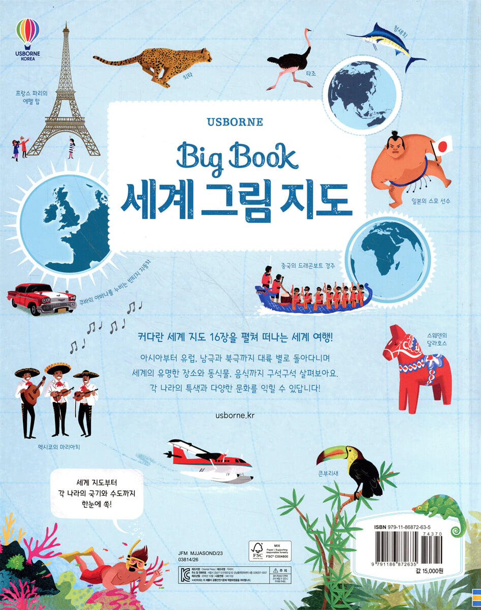 크고 널찍한 세계 그림 지도 속에 세계 곳곳의 다양한 모습을 담아낸 책입니다. 커다랗게 펼쳐지는 대륙 지도 속에 꼭 가봐야 할 명소와 유적지부터 동식물, 음식, 문화, 스포츠까지 각 지역의 특징이 간결한 글과 알록달록한 그림으로 담겨 있어 아이들의 눈길을 사로잡습니다.