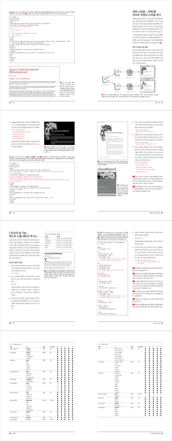 스타일이란? CSS란? - CSS의 동작 방식 CSS의 발전 과정 - CSS 레벨 1 (CSS1) - CSS 레벨 2 (CSS2) - CSS 레벨 3 (CSS3) CSS 규칙의 종류 CSS 규칙의 구성요소 - 브라우저의 CSS 확장 속성 CSS3의 새 기능 02장 HTML5 기초 HTML이란? - 기본 HTML 문서 구조 - HTML 속성 - HTML과 CSS HTML 엘리먼트의 종류 HTML5의 발전 과정 - 그런 다음 XHTML이 등장한다 - XHTML2의 문제점 - 그때 HTML5가 등장했다 - HTML5인가 XHTML5인가? HTML5의 새 기능 HTML5 구조의 동작 원리 HTML5 구조 사용하기 - 인터넷 익스플로러에서의 HTML5 보완 03장 CSS 기초 기본 CSS 선택자 인라인 스타일 - HTML 태그 내의 스타일 추가 - 개별 HTML 태그 내에서의 스타일 속성 설정 페이지 내 스타일 - 웹 페이지에서의 스타일 추가 - HTML 문서 내에서의 태그 스타일 설정 외부 스타일 - 전체 웹 사이트 차원의 스타일 추가 - 외부 스타일 시트 생성 - 외부 CSS 파일의 설정 - 외부 CSS 파일 링크 - 스타일 시트 불러오기 - 외부 CSS 파일 불러오기 HTML 태그 (재)정의 - HTML 선택자 정의 재사용 가능한 클래스 정의 - 클래스 선택자 정의 고유 ID 정의 - ID 선택자 정의 - 공통 선택자의 적용 그룹 지정 - 동일 스타일을 사용하는 엘리먼트 정의 - 선택자 그룹 지정 CSS에 주석 추가 - 스타일 시트에서의 주석 추가 04장 선택적 스타일 적용 엘리먼트 가계도 문맥에 따른 스타일 정의 - 자손 엘리먼트의 스타일 적용 - 자손의 전체 스타일 적용 - 자식 엘리먼트에만 스타일 적용 - 형제 엘리먼트의 스타일 적용 - 인접 형제 선택자의 정의 의사 클래스의 사용 - 링크의 스타일 적용 - 서로 구분된 링크 스타일 설정 - 사용자 상호작용에 대한 스타일 적용 - 동적 의사 클래스의 정의 - CSS3의 새 기능 - 의사 클래스를 지닌 특정 자식에 대한 스타일 적용 ★ - 엘리먼트의 자식 스타일 적용 - 특정 언어에 대한 스타일 적용 - 특정 언어에 대한 스타일 설정 - CSS3의 새 기능 - 엘리먼트에 대한 스타일 부정 ★ - 특정 엘리먼트에 대한 스타일 부정 의사 엘리먼트의 사용 - 첫 글자 및 첫 줄 의사 엘리먼트의 사용 - 아티클의 시작 부분 강조 - 엘리먼트 전, 후 콘텐츠 설정 - 엘리먼트 전, 후 콘텐츠 추가 태그 어트리뷰트 기반 스타일 정의 - 엘리먼트 어트리뷰트를 기반으로 한 스타일 설정 CSS3의 새 기능 - 미디어 쿼리 ★ - 미디어 쿼리 - 미디어 쿼리를 사용한 스타일 지정 - @media 규칙 사용법 - @media를 사용한 스타일 지정 부모로부터의 속성 상속 - 기존 속성값과 상속한 속성값의 관리 !important 선언 지정 - 강제로 선언 적용하기 캐스케이딩 순서의 판단 - 엘리먼트의 캐스케이딩 우선순위 판단 05장 폰트 속성 웹 타이포그래피의 이해 - 캐릭터셋 지정 - 일반 폰트 패밀리 - 딩뱃 - HTML 캐릭터 엔티티 폰트 스택 설정 - 엘리먼트에 대한 폰트 패밀리 정의 폰트 선택 - 웹 안전 폰트 - 다운로드 가능한 웹폰트 - 더 나은 폰트 스택 설정 - 엘리먼트에 대한 웹 안전 폰트 또는 웹폰트 정의 폰트 크기 설정 - 엘리먼트의 폰트 크기 정의 CSS3 새 기능 - 대체 폰트의 크기 조절 ★ - 엘리먼트에 대한 폰트 크기 조절 텍스트의 이탤릭체 설정 - 엘리먼트의 폰트 스타일 설정 볼드체 설정 - CSS 규칙에서의 볼드 텍스트 정의 소형 대문자 설정 - 엘리먼트에 대한 소형 대문자 설정 여러 폰트 값 일괄 설정 - 단일 규칙 내에서의 여러 폰트 어트리뷰트 동시 정의 06장 텍스트 속성 텍스트 간격 조절 - 글자 사이의 간격 조절(트래킹) - 자간 정의 - 단어 사이의 간격 조절 - 단어 사이의 간격 설정 - 텍스트 줄 간격 조절(행간) - 리딩 정의하기 텍스트 대소문자 설정 - 텍스트 대소문자 정의 CSS3 새 기능 - 텍스트 드롭 섀도우 추가 ★ - 텍스트 섀도우 정의 텍스트 가로 정렬 - 텍스트 정렬 정의 텍스트 세로 정렬 - 세로 정렬 정의 단락 들여쓰기 - 텍스트 들여쓰기 정의 공백 제어 - 공백 간격 정의 텍스트 장식 - 텍스트 장식(장식 제거) 곧 추가될 기능 07장 색상과 배경 속성 색상값 선택 - 색상 키워드 - RGB 16진수 값 - RGB 10진수 값 - 퍼센트 값 - CSS3의 새 기능 - HSL 값 ★ - CSS3의 새 기능 - 색상 알파 값 ★ CSS3의 새 기능 - 배경색 그라디언트 ★ - 인터넷 익스플로러 그라디언트 - 모질라 그라디언트 - 웹킷 그라디언트 색상 팔레트 선택 - 온라인 색상 스키마 툴 텍스트 색상 설정 - 텍스트 색상 정의하기 배경색 설정 - 엘리먼트의 배경색 정의 - 배경 이미지 정의 배경 단축 속성 활용 - 배경 정의 08장 리스트와 테이블 속성 불릿 스타일 설정 - 불릿 스타일 정의 커스텀 불릿 생성 - 커스텀 그래픽 불릿 정의 불릿 위치 설정 - 리스트 항목에서 줄바꿈 텍스트의 줄 위치 정의 여러 리스트 스타일 설정 - 여러 리스트 스타일 속성 정의 테이블 레이아웃 설정 - 테이블 레이아웃 설정 테이블 셀 사이 간격 설정 테이블 셀 사이의 보더 병합 - 테이블 보더 병합 테이블 설명 위치 설정 09장 사용자 인터페이스 및 동적 생성 콘텐츠 속성 마우스 포인터의 모양 수정 CSS를 사용한 콘텐츠 추가 카운터 적용 방식 지정 인용 스타일 지정 10장 박스 속성 엘리먼트 박스의 이해 - 박스의 구성요소 엘리먼트 보여주기 엘리먼트의 너비 및 높이 설정 - 엘리먼트의 너비 정의 - 엘리먼트의 높이 정의 - 최대 및 최소 너비 설정