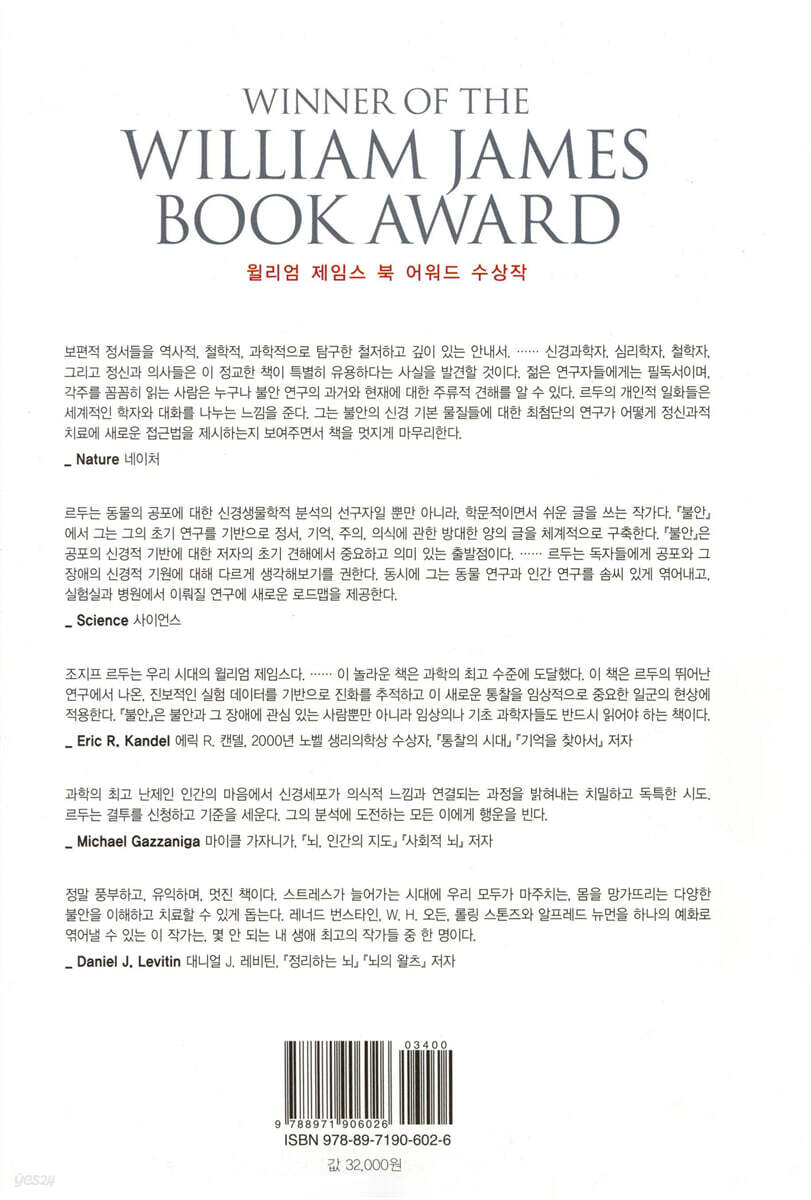 01장 불안과 공포의 아수라장 02장 정서의 뇌를 다시 생각하기 03장 이불 밖은 위험해 04장 방어하는 뇌 05장 우리의 정서는 동물 조상에게서 온 것일까? 06장 의식의 물리학 07장 개인의 문제: 기억은 의식에 어떻게 영향을 미칠까? 08장 느낌: 정서 의식 09장 4천만 명의 불안한 뇌 10장 불안한 뇌의 개조 11장 치료: 실험실의 교훈 주 참고 문헌 |