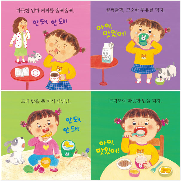 미운 일곱 살? 미운 다섯 살? 요즘은 ‘미운 세 살’이라는 말까지 생겼지요. 천사 같던 우리 아기가 미운 짓을 하며 말썽을 부리기 시작하면 어떻게 해야 할까요? [착한 아이 그림책] 속에 정답이 들어 있어요. 마치 우리 아이 같은 개구쟁이 아이들의 일상이 네 권의 책 속에 고스란히 담겨 있고, 책장을 펼치면 잘못된 행동과 바른 행동이 한눈에 쏙쏙 들어온답니다. 아이는 재미있게 책을 보며 주인공들의 대조적인행동을 통해 자연스럽게 바른 생활 습관을 익히게 될 거예요. 아직은 행동의 옳고 그름을 판단할 능력이 부족한 이 시기 아이들이 바르고 착한 아이로 쑥쑥 자라기를 바라는 마음에서 이 시리즈를 펴냈습니다. [착한 아이 그림책] 이런 점이 돋보여요 1. 우리 아이와 똑 닮은 주인공이 등장! [착한 아이 그림책]은 우리 아이와 밀접한 일상 속 소재인 '바른 생활하기', '감정 다루기' '깨끗이 씻기' '맛있게 먹기'를 주제로 구성하였어요. 아이와 똑 닮은 주인공들이 등장하여 일상생활 속 여러 가지 행동을 보여 주지요. 아이들은 나와 똑 닮은 주인공들의 옳고 그른 행동을 보며 공감하고, 자연스럽게 바른 생활 습관을 기를 수 있게 된답니다. 2. 옳고 그른 행동이 뚜렷이 대비된 구성 책을 펼치면 한쪽에는 유아들이 고쳐야 할 좋지 않은 행동이, 다른 한쪽에는 착한 아이의 행동이 대비되어 보여집니다. 책 속 주인공의 대조적인 행동을 한눈에 비교하며 옳고 그른 행동을 구분하고, 나쁜 습관을 스스로 고쳐 나가는 계기를 마련해 주지요. 3. 반복되는 말이 귀에 쏙쏙! 나쁜 행동, 미운 마음, 더러운 몸, 잘못된 식습관을 가진 아이의 행동에는 '안 돼, 안 돼!'라는 말을 반복하며 잘못된 행동에 대해 인지시키고, 예쁜 행동, 고운 마음, 깨끗한 몸, 올바른 식습관을 가진 아이의 행동에는 '아이, 착해!', '아이, 좋아!', '아이, 예뻐!', '아이, 맛있어!'라는 말로 격려를 해 줍니다. 귀에 쏙쏙 들어오는 반복되는 말은 아이가 옳고 그른 행동을 명확히 구분하고 바른 행동을 따라 해 볼 수 있도록 이끌어 줍니다. 4. 자꾸자꾸 읽고 싶은 입말체와 개성 넘치는 그림의 어울림! 글 속에 자연스럽게 의성어와 의태어가 녹아 있어 아이가 재미있게 듣고 쉽게 따라 해 볼 수 있으며, 풍부한 표현력과 어휘력을 키우도록 도와주지요. 또한 알록달록한 빛깔로 귀엽고 사랑스러운 주인공의 행동을 표현한 그림은 저마다 개성이 넘치는 아이의 모습을 담고 있답니다. |