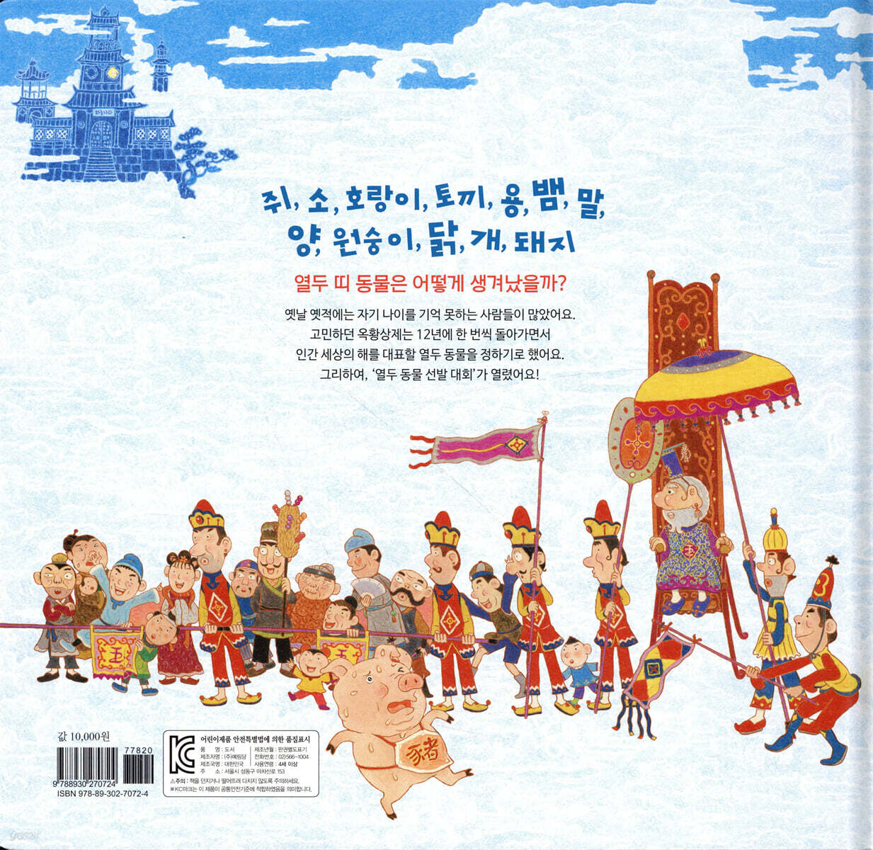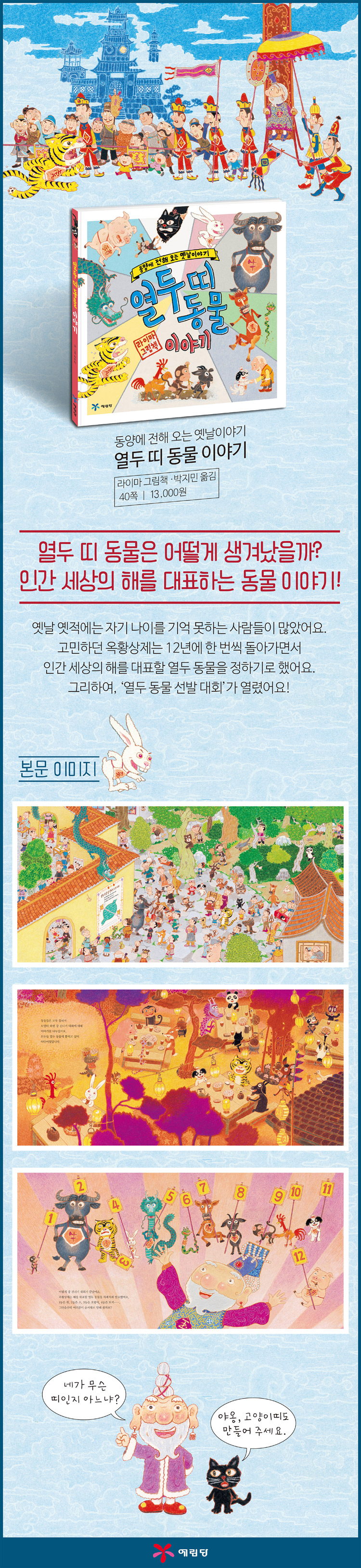 사람들은 자기가 태어난 해를 잘 기억하지 못해서 자기가 몇 살인지 모르는 사람들이 많았어요. 옥황상제는 끙끙 고민했어요. '태어난 해를 잘 모르는 인간들이 너무나 많도다!' --- p.2 동물들은 모두 들떠서 모였다 하면 강 건너기 대회에 대해 이야기를 나누었어요. 모두들 열두 동물에 뽑히고 싶어 야단이었답니다. --- p.10 |