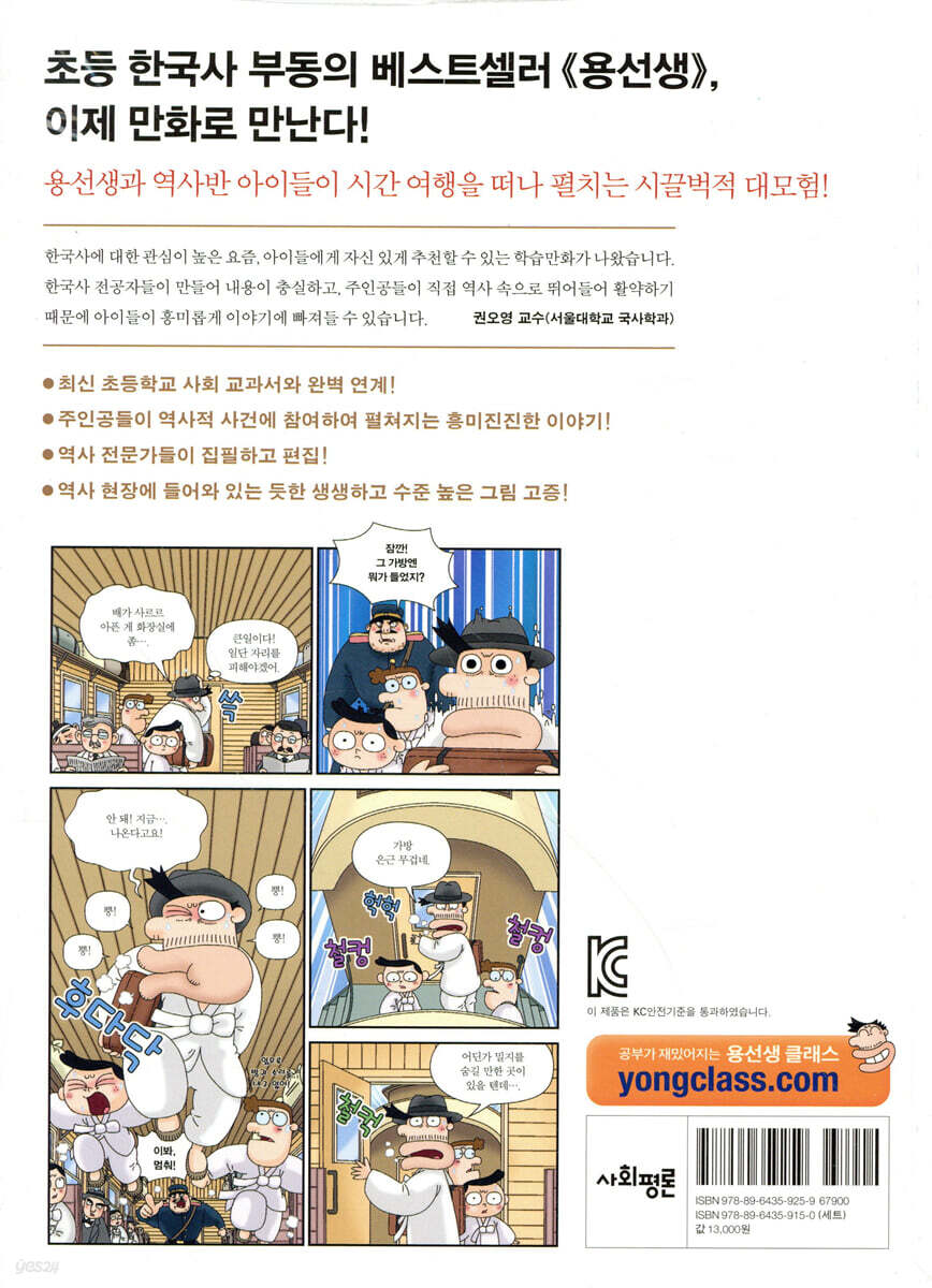 《용선생 만화 한국사》는 《용선생의 시끌벅적 한국사》의 캐릭터들이 과거로 시간 여행을 떠나 다양한 역사적 사건에 직접 참여하면서 벌어지는 흥미진진한 이야기이다. 아이들은 마법 연표를 타고 과거로 돌아가 광개토 대왕, 이순신 장군, 안중근 등 역사적 인물을 만난다. 그리고 다양한 사건에 휘말리며 이를 해결해 나가는데, 그 과정에서 자연스럽게 우리 역사를 익히게 된다. 아직 줄글에 익숙하지 않거나 만화를 좋아하는 아이들이 한국사를 흥미 있게 배우고 싶을 때 딱 알맞은 책이다. 2016-2017 최신 초등학교 사회 교과서와 완벽 연계! 《용선생 만화 한국사》는 개정 교과서의 내용과 자료들을 충실하게 반영하였다. 개정 교과서에 있는 강화도 조약의 내용을 삽화와 함께 충실하게 설명했다. 뿐만 아니라 개정 교과서에서는 다루고 있지 않지만, 역사적으로 중요한 개항기 열강의 이권 침탈 내용이나 헐버트, 베델 등 한국의 독립을 위해 노력한 외국인들에 대해 자세하게 다루었다. 그리고 이와 같은 풍부한 학습 정보들을 효율적으로 습득할 수 있도록, 다양한 학습 정보 코너를 마련하였다. 교과서의 주요 내용은 만화만 보아도 이해할 수 있도록 스토리 속에 녹여 놓았고, 내레이션을 달아놓았다. 보다 자세한 설명이 필요한 주제는 바로 옆에 정보박스를 만들어 보충하였다. 모든 에피소드의 말미에는 교과서 핵심 보기를 두어 교과서 내용을 다시 정리할 수 있게 하였고, 교과 연계를 위해 해당 교과서의 단원을 꼼꼼히 적어주었다. 그밖에 용선생의 역사 교실에서는 교과서 밖의 이야기도 쉽고 재밌게 전달하고 있다. 주인공들이 역사적 사건에 참여하여 펼쳐지는 흥미진진한 이야기! 《용선생 만화 한국사》에서는 용선생 캐릭터들이 마법 연표를 타고 과거로 떠나 구석기 시대부터 현대까지 우리 역사의 구석구석을 여행한다. 기존의 한국사 학습 만화들은 같은 시간 여행 컨셉이어도, 주인공들이 인물과 사건의 주변만 맴도는 경우가 많았다. 하지만 《용선생 만화 한국사》의 이야기 전개 방식은 전혀 다르다! 《용선생 만화 한국사》는 각 장마다 독립적인 에피소드를 새로 만들었다. 새로 창작된 흥미진진한 스토리 속에서 주인공 캐릭터들은 실제 역사 인물들의 친구가 되기도 하고, 역사적 사건에 직접 참여하기도 한다. 역사반 아이들은 흥선 대원군의 시종이 되어 강화도를 침입한 미군 함대를 조사하고, 고종의 특사를 따라 네덜란드 헤이그로 가기도 한다. 이처럼 주인공 캐릭터들이 경험하는 흥미로운 스토리와 학습내용이 절묘하게 결합되어 있어, 어린이 독자들은 마치 자신이 주인공이 된 것처럼 처음부터 끝까지 몰입하며 재미있게 책을 읽을 수 있다. 역사 전문가들이 집필하고 편집! 학습 만화, 더구나 아이들을 대상으로 우리 역사를 다룬 책이라면 필자의 중요성은 이루 말할 필요도 없다. 그런데 기존의 한국사 학습 만화들은 한국사를 전공하지 않은 만화 스토리 전문 작가들이 글을 쓰는 경우가 대부분이었다. 하지만 《용선생 만화 한국사》의 집필진은 다르다! 사회평론 역사연구소(이하 사평연구소)의 연구원들은 대학에서 최소 10년 이상 한국사를 연구하고 학교에서 한국사를 가르쳤던 전공자들이다. 아이들에게 정확한 역사적 사실 전달을 위해 교과서는 물론, ??삼국사기??, ??고려사??, ??조선왕조실록?? 등 1차 자료까지 섭렵하며 사실 확인을 위해 노력했다. 이렇게 작성된 원고는 권위 있는 대학 교수님들에 의해 다시 한 번 꼼꼼히 검토되었다. 이렇게 전문성과 대중적 글쓰기 역량을 갖춘 집필진들이 참여하여 쉽고 재미있는 스토리와 충실한 학습 내용이라는 두 마리 토끼를 성공적으로 잡을 수 있었다. 역사 현장에 들어와 있는 듯한 생생하고 수준 높은 그림 고증! 만화는 글줄과 다르게 아이들에게 시각적으로 큰 영향을 미친다. 사평연구소에서 이번 한국사 학습 만화를 제작하면서 가장 고심했던 부분 중의 하나가 바로 그림의 고증이었다. 사평연구소 연구원들은 만화 속에 그려지는 공간과 소품들을 시대에 맞도록 최대한 철저히 고증하였다. 갑옷을 그릴 때에도 삼국, 고려, 조선 시대의 차이는 물론, 삼국 시대 내에서도 고구려, 백제, 신라, 가야의 갑옷의 차이까지 세세하게 고증하여 그렸다. 또한 조선 전기에서 후기의 복식의 차이까지 꼼꼼히 조사하여 그림에 반영하였고, 기록에서 날짜를 확인할 수 있는 사건인 경우, 음력 날짜에 맞는 달의 모양까지 정확하게 그려 넣었다. 이로써 한 컷 한 컷 최대한 역사적 사실에 부합하는 그림이 되도록 노력했다. |