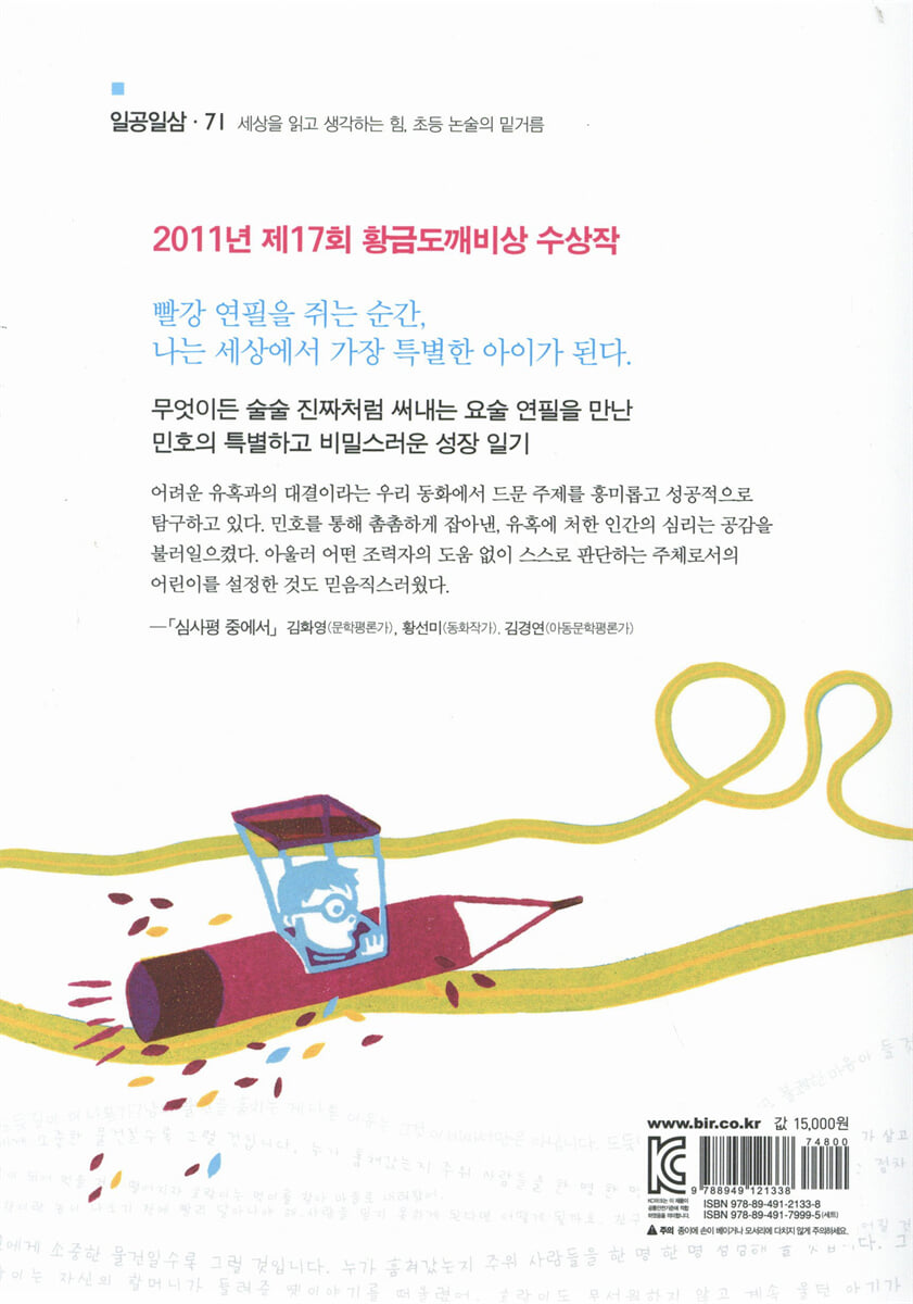 “일기는 하루를 돌아보며 의미 있는 일을 솔직하게 쓰는 거라지만, 실제로 그렇게 쓸 수는 없다. 다른 사람이 읽기 때문이다.” 민호는 부모님의 별거로 아빠가 집을 나가고 엄마와 단둘이 생활하고 있다. 아빠와 자주 만나지 못할뿐더러 함께 사는 엄마도 직장에 다니느라 민호와 많은 시간을 보내지 못한다. 부모님이 왜 헤어져 사는지 누구에게도 설명을 듣지 못한 민호는 속으로만 상처를 품고 있다. 삼 년 전, 부모님의 다툼이 있던 날, 민호는 일기장에 그 일을 솔직하게 썼다. 하지만 그 일기를 본 선생님이 엄마를 학교로 불렀고, 엄마는 일기에 그런 내용을 썼다며 민호를 타박한다. 그 후 민호는 학교에 내는 일기장, 속내를 솔직하게 털어놓는 비밀 일기장을 따로 만들게 된다. 빨간 연필로 인해 민호는 글짓기로 칭찬을 받는 동시에, 비밀 일기장에 털어놓을 내용도 많아진다. “비밀 일기장에도 쓸 수 없는 진짜 비밀”이 생겼지만, 민호는 빨간 연필에 의해 생긴 고민과 생각을 적어 내려가며 자신도 모르게 진심으로 글쓰는 재미를 느끼게 된다. “신기하게도 일기를 쓰면 쓸수록 쓸거리가 많아졌다. 그래서 더 자주 쓰게 되었고 점차 쓰는 양도 늘었다. 그건 새로운 즐거움이었다. 어떤 날은 일기를 쓰지 않으면 잠이 오지 않았다. 일기도 중독되나 보다.” 자의식이 조금씩 생겨나는 시기, 내가 쓴 일기를 타인에게 보여 주는 일은 아이들에게 민감한 부분일 수 있다. 작가는 그 점을 포착해 더 나아가서는 좋은 글을 쓰기 위한 태도를 넌지시 제시한다. 책 속에서 동화작가로 등장하는 송지아 선생님은 민호가 빨간 연필 없이 혼자만의 힘으로 글을 써냈을 때, 민호의 글 속에서 솔직함과 용기를 발견한다. 이는 아이들에게 글쓰기 기술을 가르치는 사이 어른들이 간과할지도 모를, ‘진심’을 진실하게 표현해야 한다는 글쓰기의 기본 태도를 말해 준다. 글로 다할 수 없을 땐, 먼저 마음을 열면 되는 거야 “양치기 소년은 혼자 너무 외로웠다. 양이 아니라 사람이 보고 싶었다. 거짓말한 사람에게 필요한 건 자기를 다시 믿어 주는 사람이다.” ‘우리 집’을 주제로 한 글짓기에서 빨간 연필은 민호의 집을 화목한 가정으로 꾸며 내고, 그 때문에 거짓말은 걷잡을 수 없이 커지고 만다. 같은 반인 동철이와 재규의 의심과 시기가 계속되는 가운데 민호는 빨간 연필을 버려야겠다고 마음먹으면서도 ‘딱 한 번만’을 외치게 된다. 하지만 빨간 연필로 인해 민호는 좋아하던 수아와도 가까운 사이가 되고, 엄마와도 조금씩 소통하게 된다. 자신을 믿어 주고 다독여 주는 사람들을 앞에 두고 진실을 밝힐 수 없어 외려 외로움과 두려움도 느끼지만, 그들 때문에 좀 더 당당하고 용기 있는 사람이 되어야겠다는 마음도 들게 되는 것이다. 또한 민호의 글에 나서서 멋진 그림을 그려 주는 정란이를 통해 민호는 솔직함의 매력을 알게 된다. 정란이는 공부도 못하고 늘 엉뚱한 말만 해 친구들에게 무시당하기 일쑤지만, 자신만의 상상력을 발휘해 매번 멋진 그림을 그려 낸다. 민호는 그런 정란이를 통해 남의 시선에 신경 쓰지 않고 스스로에게 솔직한 모습을 배운다. 민호는 아빠를 무척 그리워하는 한편, 늘 아빠를 이해할 수 없었다. 하지만 비밀과 거짓말이라는 울타리에 갇히게 된 민호는 이제 아빠를 그저 기다리기보다는 자신이 먼저 아빠의 울타리 안으로 들어가야겠다고 마음먹게 된다. 빨간 연필의 유혹을 스스로 이겨 나가며, 민호는 그렇게 마음을 열고 진심을 말하는 법을 배워 나간다. |