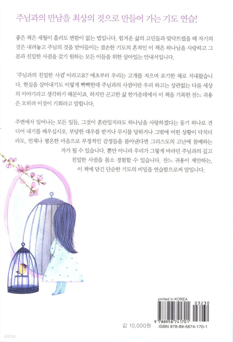처음 만나는 잔느 귀용 간략한 책 소개 part 1 봄, 주님을 만나러 갑니다 01. 깊은 만남으로의 초대 02. 한 걸음 내디뎌 보세요 03. 예수님을 읽으세요 04. 사랑해서 사랑합니다 part 2 여름, 목마른 날들을 지나며 05. 메마른 길을 지날 때 06. 나를 포기합니다 07. 십자가를 집니다 08. 예수의 흔적을 지닙니다 09. 하나님을 닮아갑니다 part 3 가을, 깊은 사귐 속으로 10. 내면에 거하세요 11. 내 안의 그리스도를 향하여 12. 내면에서 흘러나오는 기도 13. 임재 속에서 풍성함을 누리세요 14. 침묵하는 습관을 들이세요 15. 주님의 빛에 마음을 드러내세요 16. 성령의 인도를 따라 말씀을 읽으세요 part 4 겨울, 주님 앞에서 잠잠히 잠잠히 17. 나의 기도가 그치다 18. 내 본연의 모습과 마주치다 19. 유혹에 대처하기 20. 자아를 온전히 주님께 드리세요 21. 침묵 속에서 성령님을 따라가세요 part 5 그리고 영원한 새봄 22. 주님 안에 영원히 23. 그리스도의 일꾼들에게 당부합니다 24. 하나님과 하나 되는 날까지 25. 옥중에서 |