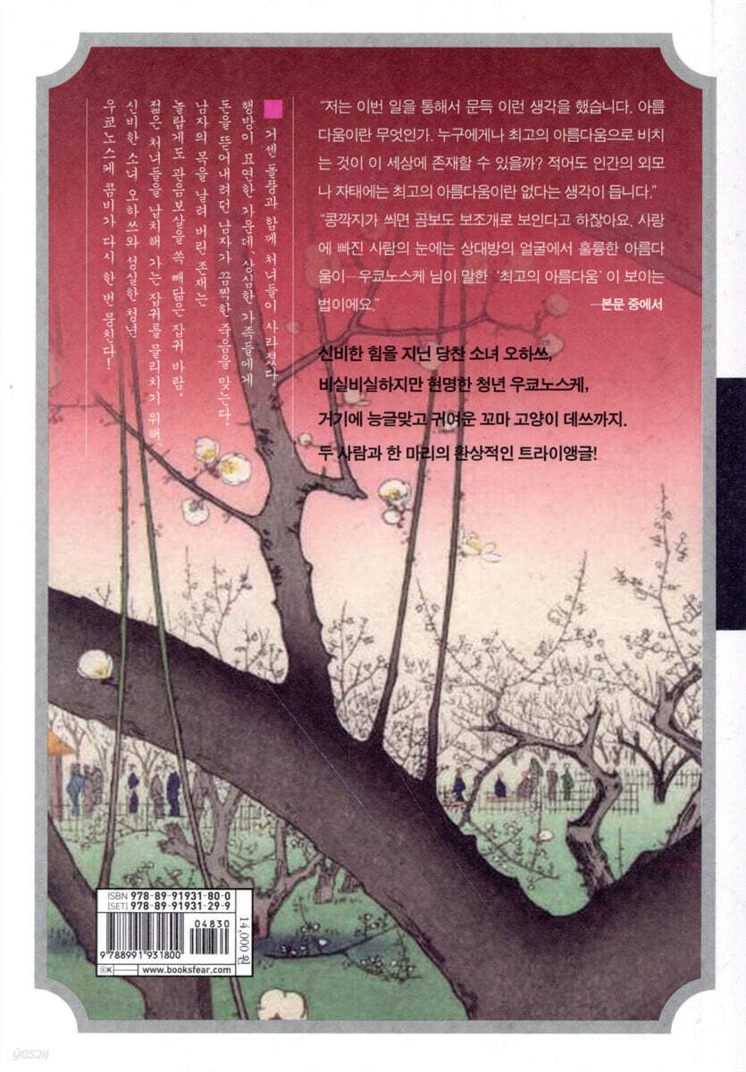 말라비틀어진 오이 같지만 현명하고 착실한 청년 우쿄노스케, 그리고 엉큼하지만 귀엽고 용감한 꼬마 고양이 데쓰. 두 사람과 한 마리의 환상적인 트라이앵글! 좋아하는 남자와의 혼인을 눈앞에 둔 처녀가 어느 날 갑자기 사라졌다. 처녀를 마지막으로 본 사람은 그녀의 아버지. 관리들은 아버지가 딸을 죽인 사건이라고 추측한다. 그러나 처녀의 아버지는 횡설수설하며, 피처럼 붉은 아침노을과 집을 뒤흔들 정도로 세찬 돌풍에게 딸이 ‘가미카쿠시(다른 차원, 사후 세계 등 이 세상이 아닌 곳으로 사람이 사라져 버리는 일)’를 당했다고 주장하다가 결국 자살해 버린다. 그 직후 다른 가게에서 똑같은 실종 사건이 일어난다. 첫 번째 사건과 마찬가지로, 시뻘건 아침노을과 집 안을 뒤흔든 거센 돌풍에 이어 소녀가 실종된 것이다. 심지어 이번에는 엄청난 몸값을 요구하는 협박장까지 날아온다. 신비한 힘을 지닌 소녀 오하쓰는 오라버니 로쿠조와 함께 돈궤를 들고 정해진 장소에 나가 협박장을 보낸 남자를 포박하지만, 놀랍게도 그곳에 관음보살을 쏙 빼닮은 아름다운 요물이 나타난다. 돌풍을 부려 남자의 목을 단숨에 날려 버리고는 사라진 잡귀 바람. 실마리가 사라져 어쩔 줄 몰라 하는 오하쓰의 앞에 신비한 조력자가 나타난다. 다름 아닌 귀엽고 엉큼한 꼬마 고양이 데쓰. 데쓰는 오하쓰에게 ‘천구’-그 잡귀 바람이 처녀들을 납치해 갔으며, 천구는 고양이들의 숙적이라는 사실을 알려준다. 그리고 마침내 오하쓰는 데쓰와 우쿄노스케의 도움을 받아 천구에게서 처녀들을 되찾기 위한 계획을 세우기 시작한다. “나는 아름다워……. 그리고 더, 더 많이 아름다워질 수 있어. 더욱더 아름다워지고 싶어. 누구보다, 이 세상 어느 누구보다도. 어떤 여자한테도 지고 싶지 않아.” 남자든 여자든 누구나 아름다운 외모를 갖고 싶어 한다. 그래서인지 사람들은 자신의 겉모습은 물론이거니와 타인의 외모에도 큰 관심을 둔다. 그중에서도 특히 여성의 외모는 때로는 놀라우리만큼 효과적인 무기가 되고, 때로는 잔인하리만큼 그악스러운 비난의 대상이 된다. 특히나 현대 사회에서 여성의 외모는 이미 평가의 대상이자 가치를 따지는 상품이 되어 버렸다. 여성의 얼굴이나 몸매에 대한 수많은 유행어를 만드는가 하면 아름다운 외모를 ‘착하다’라고 표현하는 등, 여성의 외모에 대한 우리 사회의 가치관은 놀라울 정도로 비틀려 있다. 도대체 사람들은 왜 이렇게 겉모습에 집착하고 외모를 따져가며 살기 시작했을까. ― ‘여자는 외모가 전부’라는 말을 들으며 자란 처녀. 이 대목을 읽으며 움찔했습니다. 요즘처럼 몸뚱이 무게와 부위별 치수에 그악스럽게 집착하는 시대가 또 있었을까요? 이웃 나라의 낯선 시대를 배경으로 한 시대 소설이지만 참으로 통절한 이야기다 싶습니다. - 역자 후기 중 『미인』에는 처녀들을 납치해 가는 괴이한 잡귀 바람이 등장한다. 자신을 사칭하려 드는 남자의 목을 단숨에 날려 버리고, 젊은 처녀들을 어디론가 데려가 버리며, 젊은 남자들을 홀리고 죽여 버리는 요물-‘천구’는 여인의 망집과 관계 깊은 잡귀다. 어여쁜 살가죽만을 추구하는 여자들의 어리석음과 겉모습만 따지려 드는 남자들의 욕심은 과연 어떤 요괴를 불러낸 것일까. 내용에 걸맞게, 『미인』은 미야베 미유키의 여러 작품 중에서도 유난히도 색채의 이미지가 강렬하고 선명하다. 새빨간 아침노을, 황금빛 관음상, 오색찬란한 천녀의 옷자락, 흐드러진 연분홍빛 벚꽃, 화려한 모란 무늬 기모노……. 일반적으로 생각하면 하나하나 모두 아름다운 것들이지만, 『미인』 안에서 이들은 하나같이 요물을 상징하는 불길한 빛깔이다. 아침노을은 핏빛처럼 섬뜩하고, 벚꽃의 연분홍빛은 요사스럽게 사람을 홀린다. 관음상의 황금색은 오히려 비천하고, 천녀의 옷자락은 꿈틀거리며 사람들을 위협한다. 이처럼 ‘아름다움’의 상징과도 같은 이미지들을 불길함을 나타내는 소재로 그려낸 것은, 작품이 말하고자 하는 주제와도 연결되어 있다. 진정한 아름다움은 겉으로 비치는 외견에 있는 것이 아니며, 아름다움과 추함은 대극이 아니라 서로 이웃일 수도 있다는 진실 말이다. 전체적으로 화려한 분위기와 더불어, 『미인』에서는 독특한 조력자가 등장한다. 바로 날쌔고 유연한 고양이들. 엉큼하지만 용감한 줄무늬 고양이 데쓰, 귀엽고 앙증맞은 얼룩 고양이 방울이, 지혜롭고 신비로운 회색 고양이 도사. 이 세 마리는 오하쓰와 우쿄노스케를 도와 천구의 정체를 파헤치고 납치된 처녀들을 구해내는 데 큰 역할을 맡는다. 그뿐만 아니라, 자칫하면 어두워질 수 있는 작품에 온종일 활기와 유쾌함을 불어넣는다. 그야말로 최고의 조연이다. 고양이를 좋아하는 사람이라면 이 매력적인 세 마리의 활약을 놓치지 마시라. |