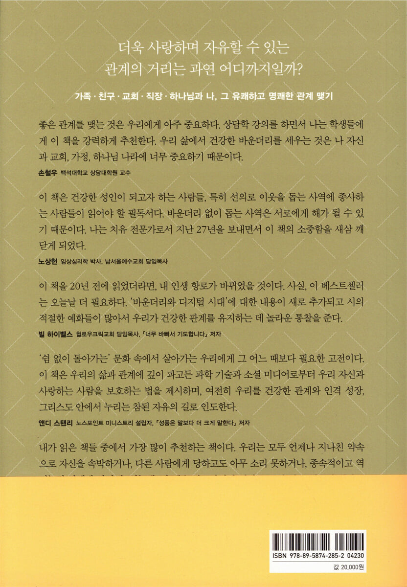 1장 바운더리 없는 일상 2장 바운더리란 무엇인가 3장 바운더리 문제 4장 바운더리는 어떻게 개발되는가 5장 바운더리의 10가지 법칙 6장 바운더리에 대한 일반적 통념 2부 바운더리의 충돌 7장 바운더리와 가족 8장 바운더리와 친구 9장 바운더리와 배우자 10장 바운더리와 자녀 양육 11장 바운더리와 직업 12장 바운더리와 디지털 시대 13장 바운더리와 자아 14장 바운더리와 하나님 3부 건강한 바운더리 개발하기 15장 바운더리에 대한 저항 16장 바운더리 성공의 측정 방법 17장 바운더리 있는 일상 |