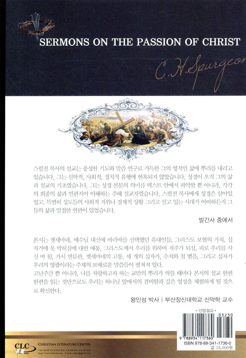 역자 서문 23 제1장 겟세마네 27 제2장 예수보다 선호된 바나바 46 제3장 그리스도의 보배로운 피 70 제4장 십자가에 못 박히신 광경을 슬퍼함 93 제5장 그리스도께서 우리를 위하여 저주를 받은 바 되셨다 117 제6장 “값으로 산 것이 되었으니” 139 제7장 사랑이 행하는 최고의 행동 162 제8장 가시 면류관 183 제9장 겟세마네의 고뇌 209 제10장 세 개의 십자가 233 제11장 수치와 침 뱉음을 당하심 255 제12장 우리의 영광인 십자가 280 |