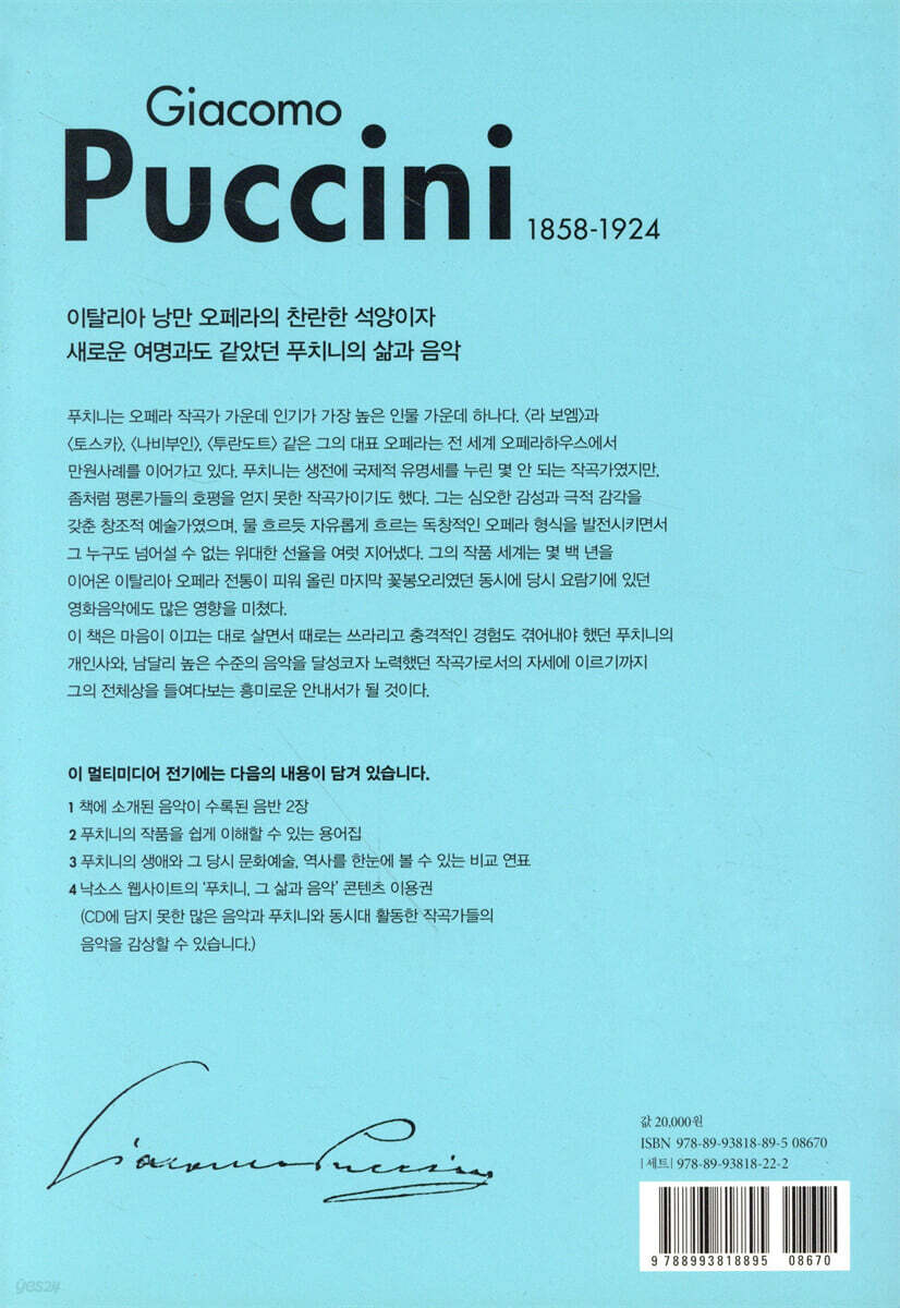 제1장 루카를 떠나 밀라노로 제2장 실패와 성공, 〈요정 빌리〉 제3장 엘비라와 〈에드가르〉 제4장 견인차가 된 〈마농 레스코〉 제5장 히스 마스터스 보이스, 〈라 보엠〉 제6장 베리스모 스릴러물, 〈토스카〉 제7장 동쪽으로, 〈나비부인〉 제8장 서쪽으로, 〈서부의 아가씨〉 제9장 적국을 위해 쓰다, 〈제비〉 제10장 셋을 묶어 하나 가격에, 〈삼부작〉 제11장 찬란한 황혼과 새로운 여명, 〈투란도트〉 부록 등장인물 용어집 음반 수록곡 해설 비교 연표 감사의 말 역자 후기 찾아보기 음반 수록곡 목록 _ CD 1 TT 74:41 글로리아 미사(사성부 미사) ⓦ Messa di gloria(Messa a quattro voci) 1 제7곡: 한 분이신 하느님을 믿습니다 2:31 Credo in unum Deum 2 제8곡: 성령에 의하여 동정녀 마리아께 잉태되어 나시고 2:35 Et incarnatus est 안토넬로 팔롬비, 테너 Antonello Palombi, tenor, 헝가리 방송 합창단 Hungarian Radio Choir, 헝가리 오페라 오케스트라 Hungarian Opera Orchestra, 피에르 조르조 모란디, 지휘 Pier Giorgio Morandi 3 교향적 전주곡 9:53 Preludio sinfonico 헝가리 오페라 오케스트라 Hungarian Opera Orchestra, 피에르 조르조 모란디, 지휘 Pier Giorgio Morandi 요정 빌리 Le villi 4 제1막: 전주곡* 2:30 Prelude 5 제1막: 어여쁜 꽃들아, 내가 너희와 같았다면** 5:33 Se come voi piccina io fossi, o vaghi fior 6 제2막: 마녀들의 춤* 3:49 La tregenda *슬로바키아 라디오 심포니 오케스트라 Slovak Radio Symphony Orchestra, 온드레이 레나르트, 지휘 Ondrej Lenard, **미리암 가우치, 안나 Miriam Gauci, Anna, BRT 필하모닉 오케스트라 BRT Philharmonic Orchestra, 알렉산더 라바리, 지휘 Alexander Rahbari 에드가르 Edgar 7 제3막: 전주곡 3:21 Prelude 슬로바키아 라디오 심포니 오케스트라 Slovak Radio Symphony Orchestra, 온드레이 레나르트, 지휘 Ondrej Lenard 8 국화(현악 오케스트라 버전) 6:22 Crisantemi 헝가리 오페라 오케스트라 Hungarian Opera Orchestra, 피에르 조르조 모란디, 지휘 Pier Giorgio Morandi 마농 레스코 ⓦ Manon Lescaut 9 제1막: 일찍이 보지 못한 여인 2:38 Donna non vidi mai simile a questa! 10 제2막: 부드러운 레이스 속에서 2:19 In quelle trine morbide 11 제3막: 간주곡 5:49 Intermezzo 12 제4막: 홀로 버려져 4:49 Sola, perduta, abbandonata 칼루디 칼루도프, 데그리외 Kaludi Kaludov, Des Grieux, 미리암 가우치, 마농 레스코 Miriam Gauci, Manon Lescaut, BRT 필하모닉 오케스트라 BRT Philharmonic Orchestra, 알렉산더 라바리, 지휘 Alexander Rahbari 라 보엠 ⓦ La Boheme 13 제1막: 그대의 찬 손 4:22 Che gelida manina 14 제1막: 내 이름은 미미 4:33 Mi chiamano Mimi 15 제2막: 거리를 홀로 걷다 보면 3:11 Quando me’n vo’ soletta per la via 16 제2막: 이번에는 또 뭔가? 1:40 Ahi! Che c’e? 17 제4막: 모두 가버렸나요? 3:27 Sono andati? 18 제4막: 내 보닛 모자 1:53 La mia cuffietta 조너선 웰치, 로돌포 Jonathan Welch, Rodolfo, 루바 오르고나쇼바, 미미 L’uba Orgona?ova, Mimi, 카르멘 곤잘레스, 무세타 Carmen Gonzales, Musetta, 파비오 프레비아티, 마르첼로 Fabio Previati, Marcello, 슬로바키아 라디오 심포니 오케스트라 Slovak Radio Symphony Orchestra, 빌 훔부르크, 지휘 Will Humburg _ CD 2 TT 74:15 토스카 ⓦ Tosca 1 제1막: 맙소사, 저것 보게! 1:07 Sante ampolle! 2 제1막: 오묘한 조화 4:28 Recondita armonia 3 제1막: 세 명의 경관과 마차 한 대 4:34 Tre sbirri, una carrozza 4 제2막: 노래에 살고 사랑에 살고 3:57 Vissi d‘arte, vissi d‘amore 5 제3막: 별은 빛나고 3:13 E lucevan le stelle 넬리 미리치오이우, 토스카 Nelly Miricioiu, Tosca, 조르조 람베르티, 카바라도시 Giorgio Lamberti, Cavaradossi, 요제프 슈파체크, 성당지기 Jozef ?pa?ek, Sacristan, 실바노 카롤리, 스카르피아 Silvano Carroli, Scarpia, 미로슬라프 드보르스키, 스폴레타 Miroslav Dvorsky, Spoletta, 슬로바키아 라디오 심포니 오케스트라 Slovak Radio Symphony Orchestra, 알렉산더 라바리, 지휘 Alexander Rahbari 나비부인 ⓦ Madama Butterfly 6 제1막: 마법과도 같은 눈빛을 가진 그대여 3:39 Bimba, dagli occhi 7 제1막: 나를 받아주세요 7:25 Vogliatemi bene 8 제2막: 어느 갠 날 4:36 Un bel di 9 제2막: 허밍 코러스 2:46 Humming Chorus 미리암 가우치, 나비부인 Miriam Gauci, Butterfly, 요르디 라미로, 핑커튼 Yordy Ramiro, Pinkerton, 슬로바키아 필하모닉 합창단 Slovak Philharmonic Chorus, 슬로바키아 라디오 심포니 오케스트라 Slovak Radio Symphony Orchestra, 알렉산더 라바리, 지휘 Alexander Rahbari 서부의 아가씨 La fanciulla del West 10 제3막: 내가 자유의 몸이 되었다고 그녀가 믿게 해주오 1:56 Ch’ella mi creda libero 토머스 하퍼, 딕 존슨 Thomas Harper, Dick Johnson, 슬로바키아 라디오 심포니 오케스트라 Slovak Radio Symphony Orchestra, 미카엘 할라스, 지휘 Michael Halasz 제비 La rondine 11 제1막: 도레타의 아름다운 꿈에 대해 2:51 Chi’il bel sogno di Doretta 루바 오르고나쇼바, 마그다 L’uba Orgona?ova, Magda, 슬로바키아 라디오 심포니 오케스트라 Slovak Radio Symphony Orchestra, 빌 훔부르크, 지휘 Will Humburg 수녀 안젤리카 Suor Angelica 12 어미도 없이 4:48 Senza mamma 미리암 가우치, 안젤리카 Miriam Gauci, Angelica, BRT 필하모닉 오케스트라 BRT Philharmonic Orchestra, 알렉산더 라바리, 지휘 Alexander Rahbari 잔니 스키키 ⓦ Gianni Schicchi 13 피렌체는 꽃피는 나무와 같아서 2:37 Firenze e come un albero fiorito 14 오 사랑하는 나의 아버지 2:09 O mio babbino caro 스테파노 세코, 리누치오 Stefano Secco, Rinuccio, 타