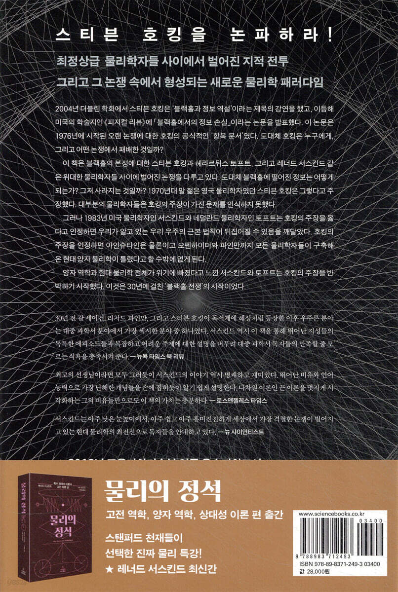 1부 몰려드는 전운 1장 첫 총성 2장 어둑별 3장 낡아빠진 기하학은 이제 그만! 4장 "아인슈타인이여, 신이 무엇을 하든 상관하지 말지어다." 5장 플랑크가 더 좋은 척도를 고안하다 6장 브로드웨이 웨스트 엔드 카페 7장 에너지와 엔트로피 8장 휠러의 제자드링여, 그대들은 얼마나 많은 정보를 블랙홀에 집어넣을 수 있을까? 9장 검은 빛 2부 기습 공격 10장 호킹이 잃어버린 정보 조각 11장 네덜란드 인의 저항 12장 무슨 상관이랴 13장 교착 상태 14장 아스펜 전초전 3부 반격 15장 샌타바버라 전투 16장 잠깐! 신경망을 되돌려라 17장 케임브리지의 에이해브 18장 세계는 홀로그램이다! 4부 전쟁의 끝 19장 대량 추론 무기, 끈 이론 20장 앨리스가 본 마지막 21장 블랙홀을 세다 22장 남아메리카의 승리 23장 돌아온 핵물리학 24장 물리학이란 '원래'그런 것이다 에필로그 감사의 말 용어 해설 옮긴이의 말 찾아보기 |