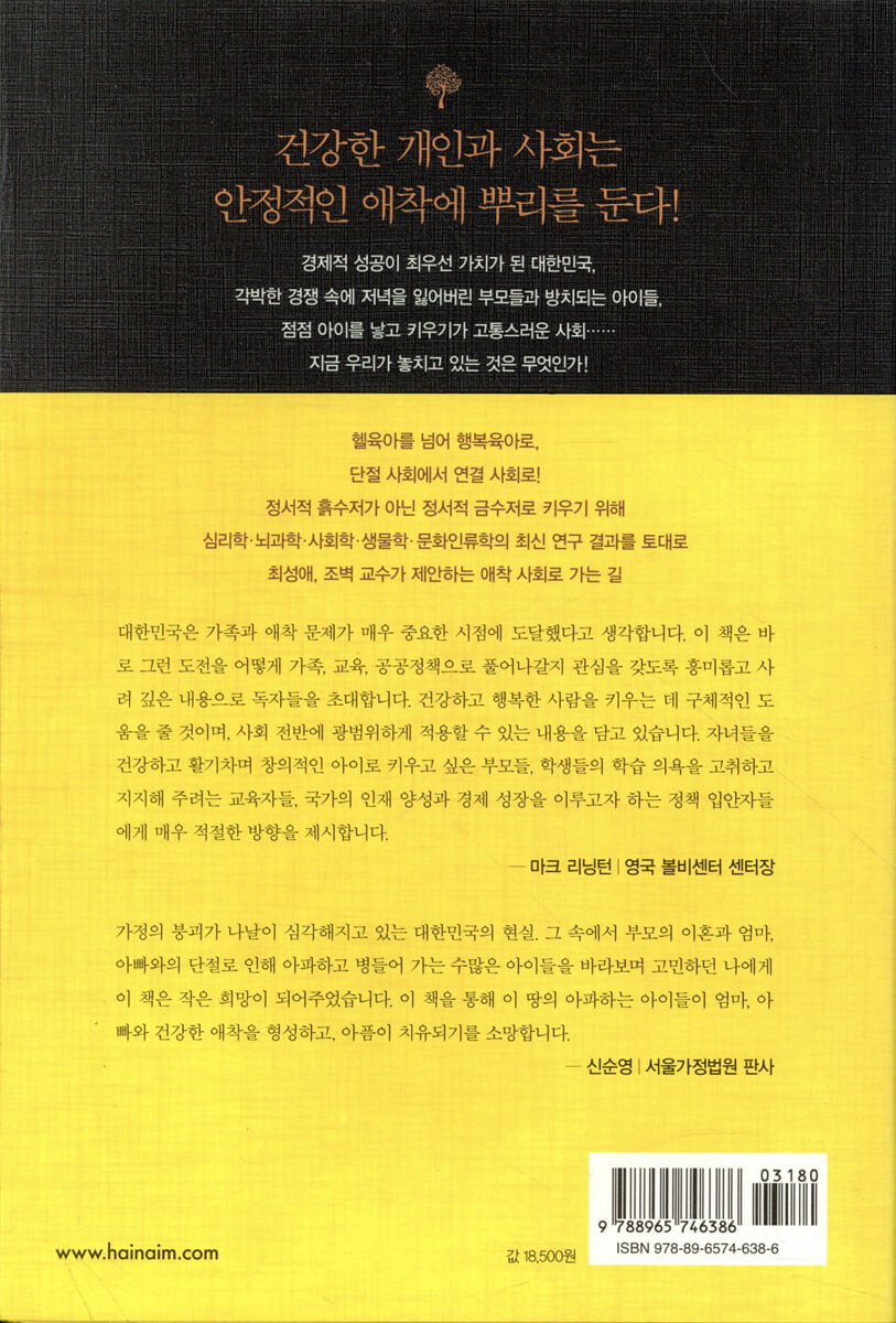 무엇보다 저자들은 위험 수위에 이른 우리 사회의 애착손상 문제는 개인 차원이 아니라 사회구조적인 차원에서 다루어야 함을 강조한다. 맞벌이 가정이 늘고, 이혼 등의 증가로 아이와 부모를 둘러싼 전통적인 양육 환경과 가족 구조는 급속히 바뀌는 중이다. 그 과정에서 아이들의 애착손상 가능성도 커질 수밖에 없다. 또한 헬육아와 독박육아라 할 만큼 힘든 육아 환경은 양육의 외주화를 부추기고, 경쟁적인 고용 문화 속에 부모들 역시 저녁을 잃어버린 채 일에 매달린다. 그 사이 아이들은 방치되기 쉽다. 정부는 무상보육 정책 등을 통해 이러한 난국을 돌파하려 했으나 문제의 본질을 보지 못한 채 애착손상만 부추기는 결과를 낳기도 했다. 그렇다면 애착이 개인을 넘어 사회에까지 중요한 이유는 무엇인가? 양육자와의 안정적인 애착은 아이에게 ‘기본 신뢰감’을 심어주며, 두뇌와 심신 발달의 기초가 된다. 이를 바탕으로 사람은 행복의 제1조건이자, 4차 산업혁명 시대의 필수 능력인 사회-정서적 역량의 핵심 ‘관계 맺음’을 원만히 해나가며 ‘정서적 금수저’로 성장할 수 있다. 하지만 애착손상을 입게 되면 원초적인 불안과 불신감으로 자아정체성 형성과 인간관계에 걸림돌이 발생하고 ‘정서적 흙수저’가 될 가능성이 높다. 이는 개인적으로도 불행일 뿐 아니라 사회 갈등을 초래하고, 이를 해결하기 위한 사회적 비용도 급증하고 있다. 애착 이론의 핵심부터 오늘날 우리의 상황까지 폭넓게 분석한 이 책은 모두 7장으로 구성되어 있다. 1장에서는 폭력, 중독, 이혼 등 우리 사회에 만연한 문제 행동들을 애착과 연결하여 설명하며, 금수저 흙수저 신드롬 현상의 이면을 들여다본다. 2장에서는 영국의 ‘아동 대피 프로젝트’와 ‘영유아 무상 보육 정책’을 통해 애착의 중요성을 간과한 무분별한 정책의 위험성을 보여주며, 우리나라 현실을 다루고 있다. 3장에서는 애착 형성 단계와 유형 등 보다 깊이 있게 애착이론을 설명하며, 4장에서는 애착손상이 지속적으로 일어날 때 생길 수 있는 발달 트라우마가 아동 발달에 미치는 영향을 소개한다. 5장에서는 성인기의 애착 관계를 보여주며, 부모의 애착손상이 자녀와의 관계에서 대물림될 수 있음을 경고한다. 6장에서는 부모가 아이를 정서적 금수저로 기르기 위한 구체적인 방법을 제시하며, 7장에서는 정서적으로 건강한 사회를 위해 학교, 기업, 정부가 만들어나가야 할 양육 환경을 제시한다. 지금이 애착손상을 예방할 골든타임 우리 사회 곳곳에 나타난 애착손상의 징후들은 매우 심각하다. 그러나 저자들은 애착손상은 회복될 수 있다고 말한다. 물론 결코 간단한 과정은 아니기에 무엇보다 예방이 최선의 치료책임을 강조한다. 이를 위해 저자들은 심리학, 뇌과학, 사회학, 생물학 등의 최신 연구 결과를 통해 과학적인 애착손상 예방법과 회복법을 알려준다. 또한 저자는 애착손상이 이미 3세대째 접어든 서유럽과 미국의 사례를 통해 우리가 반면교사 삼아야 할 중요한 지점들을 점검하고 있다. 저자들은 이 책을 통해 아이를 낳고 기르는 일 자체가 행복한 사회 환경을 구축하고 애착의 질을 높이는 것이 시급하다고 주장한다. 이러한 환경은 국가적 재앙이라는 저출산 문제를 해결하는 방법과도 맞닿아 있다. 이를 위해서는 무엇보다 가정의 중요성과 양육의 가치를 우선하고 이를 사회 전반의 시스템에 반영하려는 인식 개선과 의지가 절실하다. 부모는 일과 가정을 함께 세우는 큰 그림을 그리고, 우선순위를 정해야 한다. 기업은 친가정 제도로써 구성원들의 생태계와 행복을 돌봐야 하며, 정부는 친아동 정책으로 애착의 질을 높이는 환경을 만들어야 한다. 이 책은 자녀를 건강하고 활기차게 키우고 싶은 부모들에게, 구성원들을 인재로 키우고 싶은 기업에, 대한민국의 밝은 미래를 만들고 싶은 정책 관련자들에게 지금 우리가 선택해야 할 것이 무엇인지를 알려줄 것이다. |