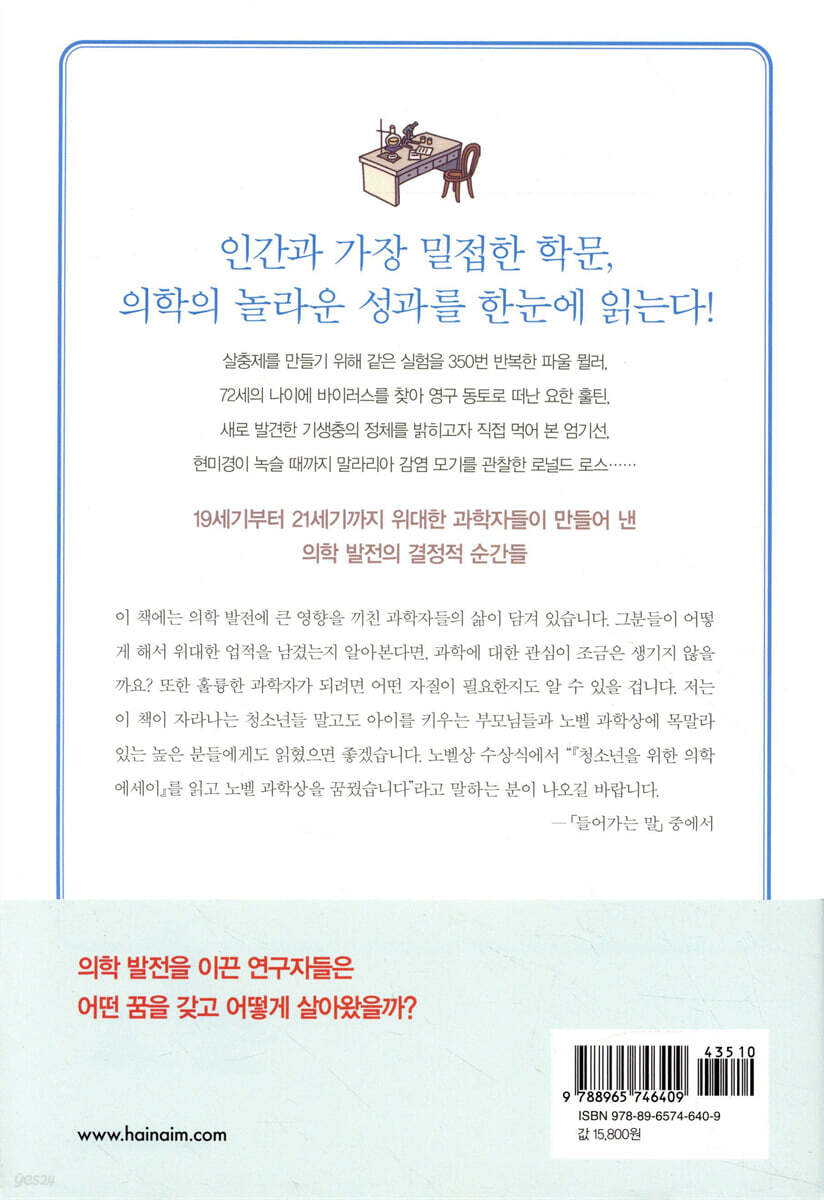 1장 질병의 정체를 밝히다 말라리아 병원체가 혈액 속에 있다고? 바나나 모양 기생충을 발견한 샤를 라브랑│괴소문의 중남미 풍토병, 원인부터 해법까지 카를로스 샤가스와 크루스파동편모충│영구 동토로 떠난 과학자 스페인독감을 향한 요한 훌틴의 열정│완전히 새로운 유형의 감염, 광우병 쿠루병에 주목한 대니얼 가이듀섹│암을 백신으로 예방한다니! 자궁경부암의 원인을 밝힌 하랄트 추어 하우젠 〈노벨상 이야기〉 모험심이 가져온 승리 대니얼 가이듀섹 2장 치료법을 찾아내다 세계 최초의 신장투석기 신부전 치료의 활로를 뚫은 빌렘 콜프│흙 속에서 발견한 결핵 치료의 열쇠 셀먼 왁스먼과 스트렙토마이신│죽은 바이러스로 만들어진 소아마비 백신 조너스 소크와 소크 백신│시력을 잃은 아프리카인들의 희망이 되다 오무라 사토시와 아이버멕틴│똑똑한 정보 전달자, 새로운 면역 세포 수지상세포를 발견한 랠프 스타인먼 〈노벨상 이야기〉 땅속에 길이 있다 셀먼 왁스먼 3장 병의 전파 경로를 파악하다 콜레라균 전파의 주범, 물을 주목하라! 미아즈마설을 반박한 존 스노│현미경이 녹을 때까지 모기를 관찰하다 말라리아 오오시스트를 발견한 로널드 로스│350번의 시도 끝에 세상에 나온 살충제 파울 뮐러와 DDT│돼지 간이 범인이다 엄기선과 아시아조충 〈노벨상 이야기〉 인내심이 가져다준 행운 로널드 로스 4장 의료?연구 기술을 발견하다 질병을 미리 진단하다 MRI를 의학에 활용한 레이먼드 다마디안│회사원, 질량 분석의 편견을 깨다 노벨상을 수상한 샐러리맨, 다나카 고이치│특정 유전자만 증폭시키는 것이 가능할까? 과학계 이단아, 캐리 멀리스│단백질이 파괴되는 방식에 주목하다 요시노리 오스미와 자가포식 연구│불임 부부의 희망이 되다 로버트 에드워즈와 시험관 아기 〈노벨상 이야기〉 아무도 하지 않는 것에 답이 있다 요시노리 오스미 5장 새로운 의학 영역을 개척하다 덩어리진 피를 보고 혈액형을 떠올리다 수혈의 아버지, 카를 란트슈타이너│화학 결합의 원리를 밝혀낸 어린 학자 노벨상 2관왕의 주인공, 라이너스 폴링│신생아학을 창시하다 아프가 점수를 고안한 버지니아 아프가│미라의 DNA를 해독하다 네안데르탈인의 미라를 탐구한 스반테 페보│고혈압 약이 불러온 나비 효과 예상치 못한 행운의 발견, 로버트 퍼치고트 〈노벨상 이야기〉 과학의 매력은 의외성이다 로버트 퍼치고트 |