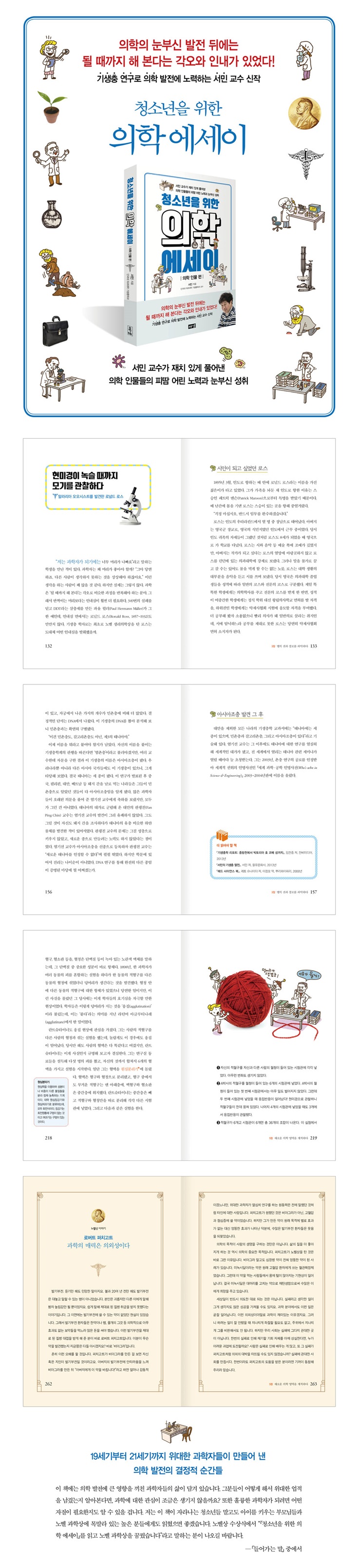 될 때까지 해 본다는 각오와 인내가 있었다! 기생충 연구로 의학 발전에 노력하는 서민 교수 신작 기생충학자 서민 교수가 손꼽은 위대한 의학 인물들을 만난다! 19세기부터 21세기까지 의학 발전에 한 획을 그은 결정적 순간 결핵, 소아마비, 콜레라 등 질병의 원인이 밝혀지고 예방법이 개발된 것은 숱한 실패에도 굴하지 않고 의학 연구에 매진한 과학자들 덕분이지만, 우리나라 초등학생 중에서는 단 2.5퍼센트만이 과학자를 꿈꾼다고 한다! 4차 산업혁명 시대를 준비하는 시점에서 아이들이 과학에 흥미를 잃어가는 현실을 어떻게 극복해야 할까? 기생충학의 대중화에 공헌한 서민 단국대 의과대학 교수가 19세기부터 21세기까지 의학 발전에 결정적인 역할을 한 과학자 24인의 삶과 업적을 담은 『청소년을 위한 의학 에세이』를 출간한다. 《고교독서평설》에 2년간 연재한 원고를 모아 다듬고 노벨상 수상 과학자 5인의 이야기 등을 추가 집필해 정리한 책으로, 청소년들이 의학적 발견에 대한 배경지식을 쌓고 끈기와 도전 의식을 배울 수 있도록 구성했다. 저자는 350번이나 같은 실험을 반복한 끝에 효과적인 살충제를 만드는 데 성공한 파울 뮐러, 새로 발견한 기생충의 증상을 알기 위해 기생충을 직접 먹어 본 엄기선 등 과학자들의 피땀 어린 노력이 위대한 발견 뒤에 숨어 있었음을 소개한다. 총 5장으로 구성된 이 책 중 ‘1장 질병의 정체를 밝히다’에서는 말라리아, 스페인독감, 광우병 등 미지의 영역으로 남아 있던 질병의 원인을 밝혀낸 과학자들의 성취를, ‘2장 치료법을 찾아내다’에서는 결핵, 소아마비, 신부전 등에 대한 효과적인 치료법으로 수많은 생명을 살린 발견을, ‘3장 병의 전파 경로를 파악하다’에서는 질병의 전염 과정을 추적해 감염 차단에 공을 세운 과학자들의 이야기를 다뤘다. ‘4장 의료?연구 기술을 발견하다’에서는 시험관 아기, MRI 등의 의료 기술과 고분자 질량 분석, 자가포식 등의 연구 기술의 개발을, 마지막으로 ‘5장 새로운 의학 영역을 개척하다’에서는 혈액형, 신생아학 등 틀을 깬 생각으로 의학의 영역을 넓힌 성취를 소개한다. 결핵 치료의 열쇠를 찾아낸 셀먼 왁스먼, 말라리아 벡터를 밝혀낸 로널드 로스, 자가포식 연구에 몰두한 요시노리 오스미 등 노벨상을 수상한 과학자들의 이야기를 각 장 끝에 실어 위대한 과학자가 되기 위해서는 연구를 향한 열정과 번뜩이는 아이디어 외에도 고통을 견디는 힘, 실수를 너그럽게 인정하는 태도, 아무도 하지 않는 것에 주의를 기울이는 시선 등의 자질이 필요함을 역설한다. 평생을 바친 연구가 실패로 끝날지도 모를 상황 속에서도 자신이 옳다고 믿는 바를 끝까지 추구했던 과학자들의 삶을 담은 이 책은, 청소년들이 의학 분야에서 주목해야 할 지식과 함께 꿈을 이뤄가는 과정에서 가져야 할 삶의 태도를 배울 수 있는 계기가 될 것이다. |
