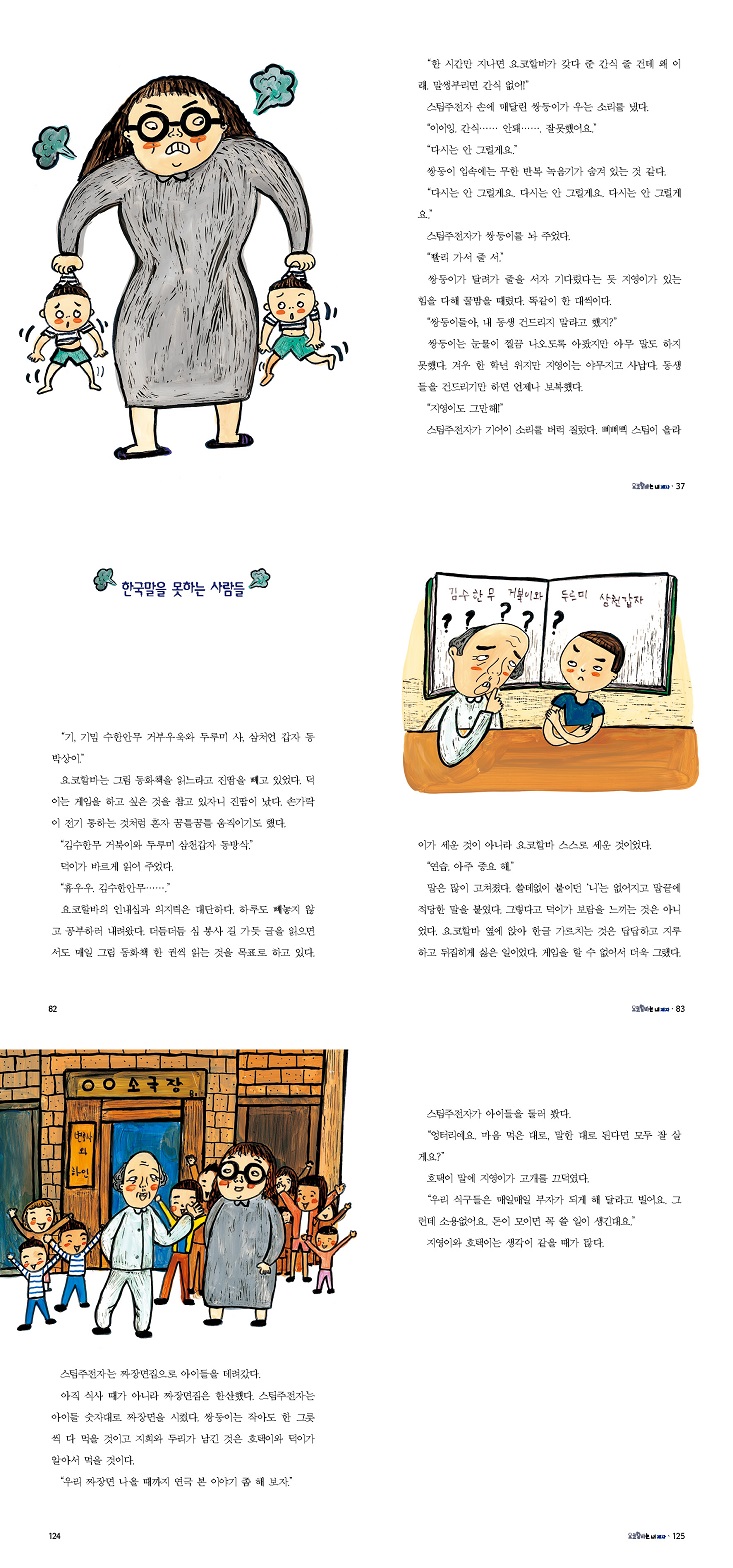 내가 초등학교에서 1학년 아이들을 가르칠 때였어요. 우리 반에 게임 도사가 있었어요. 공부는 못하지만, 게임만 하면 두 눈이 반짝이고 두 손이 자판 위를 날아다니는 아이였어요. 어느 날 컴퓨터 시간이었어요. 게임도사는 과제를 일찍 끝냈으나 게임은 할 수 없으니깐 컴퓨터로 그림을 그리고 있었어요. 빨강, 파랑, 노랑 맑고 밝은색으로 그림을 그리는데 얼마나 아름답고 신기했는지 몰라요. “어머. 어머. 어떻게 그린 거야?” 그때 그림판이라는 것을 첨 알았어요. 나는 그 아이에게 그림판으로 그림 그리는 방법을 배우기 시작했어요. 그런데 구박이 여간 심한 것이 아니었어요. “아이참. 이런 것도 못 해요?” “여기가 끊겨서 물감이 다 퍼졌잖아요. 지워요. 지워.” 참 치사하고 아니 꼬았지요. 그래도 꾹 참고 배웠어요. 혼자서 연습도 열심히 했어요. 반성도 많이 했어요. 아이들을 가르칠 때 천천히, 몰아붙이지 말고 야단치지 말고 가르쳐야겠구나, 내가 야단치면 그 아이들도 지금 나 같은 기분이었겠구나 하고 말이에요. 게임도사에게도 교훈이 되었나 봐요. 공부시간에 딴짓하고 질문을 해도 대답을 못 하던 애였는데 나를 가르치면서 어지간히 답답했던 모양에요. 공부를 열심히 하기 시작했어요. 게임도사 덕분에 나는 그림판 그림으로 동화책을 두 권이나 출판했어요. 덕이는 공부와 담을 쌓은 아이예요. 오직 스마트폰으로 게임을 하는 것만이 유일한 취미였지요. 그런 덕이가 요코할바에게 한글을 가르치기 시작했어요. 어렸을 때 일본 요코하마에서 자란 할아버지는 한글을 몰라요. 손주들에게 동화책을 읽어주는 것이 소원인 요코할바는 열심히 한글 공부를 했어요. 찌그락재그락 가르치고 공부하는 장면들은 내가 그림판으로 그림 배울 때 장면을 생각하면서 썼어요. 요코할바를 가르치면서 덕이는 일본인 아빠에 대한 생각이 점점 달라졌어요. 미워하고 싫어하던 아빠를 이해하기 시작한 것이지요. 이 책에는 덕이 말고도 많은 아이들이 나와요. 아이들 뒤에는 스팀 주전자라는 별명의 선생님이 있어요. 스팀주전자는 사납고 흥분 잘하는 선생님이지만 아이들을 끔찍이도 사랑하지요. 가정 형편이 어렵거나 다문화 가정 아이들로 모인 돌단풍 지역아동센터지만 스팀주전자 덕분에 아이들은 착하고 당당하지요. 돌단풍 아이들이 만드는 사건·사고가 주는 웃음과 감동, 기대해도 좋아요! - 아직도 그림판을 사용하는 소중애 --- 본문 중에서 |