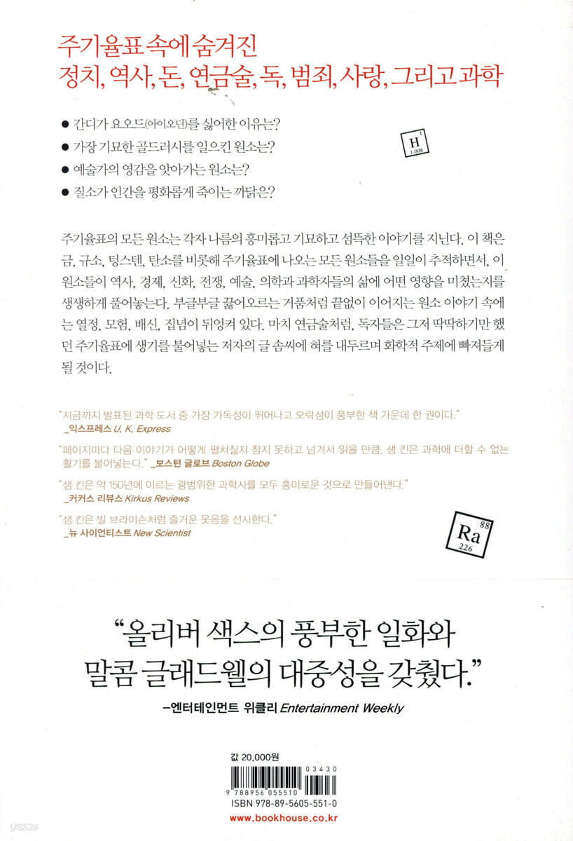 머리말1장 주기율표의 구조와 탄생지리적 위치가 곧 운명쌍둥이처럼 비슷한 원소들과 검은 양 : 원소들의 계보주기율표의 갈라파고스 제도2장 원자 창조와 원자 분해원자는 어디서 왔을까 : “우리는 모두 별의 물질로 만들어졌다”전쟁에 쓰인 원소들폭발과 함께 완성된 주기율표주기율표의 확대와 냉전의 확산3장 주기율표를 둘러싼 혼란 : 복잡성의 출현물리학에서 생물학으로독성 원소들의 복도 : “아야, 아야”기적의 의약품을 낳은 원소들원소들의 속임수4장 인간의 성격을 지닌 원소들정치적 원소들돈으로 쓰이는 원소들예술적인 원소들광기의 원소5장 현재와 미래의 원소 과학극저온에서 원소들이 나타내는 기묘한 행동영광의 구 : 거품의 과학터무니없을 정도로 정밀한 도구주기율표를 넘어서노트│참고 문헌│감사의 말│옮긴이의 말│찾아보기│원소 주기율표