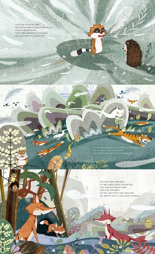 속담은 교훈적인 내용을 담고 예부터 전해 내려오는 짧은 글입니다. 교훈이 담긴 이야기를 비유적으로 하기 때문에 아무런 정보 없이 글만 봐서는 속뜻을 알기 어렵습니다. 우리 아이들에게 속담의 속뜻을 설명하는 가장 좋은 방법은 무엇일까요? “발 없는 말이 천 리 간다는 게 무슨 말이에요?”라는 질문에, “발 없는 말이 천 리 간다는 말은 쉽게 퍼지니 말 조심하라는 뜻이야.”라고 하기보다는 속담이 녹아든 흥미있는 이야기를 들려주는 것이 속담을 이해하기에 가장 좋은 방법입니다. ‘이야기 속담 그림책’ 시리즈는 유쾌하고 따뜻한 속담 속 이야기를 담고 있기도 하고, 속담을 넘어선 기발한 상상력을 보여주기도 합니다. 어른들이 생각하기에 뻔해 보이는 속담 이야기가 무궁무진 상상의 날개를 타고 새롭게 탄생합니다. ■ 풍부한 의성어, 의태어와 다채로운 색감의 그림 오랫동안 동화를 써온 작가는 이야기 속에 풍부하게 의성어와 의태어를 녹아냈습니다. 여우들이 소곤소곤 속삭인다던지, 뱀이 스륵스륵 집으로 돌아간다던지, 너구리가 몸을 부들부들 떤다던지 등의 의성어, 의태어가 담뿍 담긴 이야기는 마치 눈으로 직접 숲속 동물들을 보고 있는 듯한 착각을 불러일으킵니다. 또한 다채로운 색감으로 표현된 숲속 동물들과 판화 기법으로 채색된 그림은 책을 읽는 재미를 더해 줍니다. |