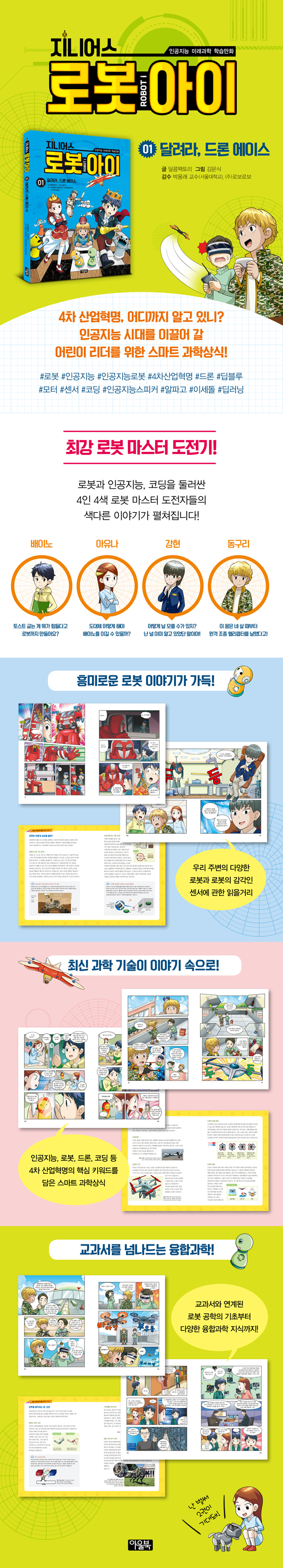 인공지능, 로봇, 드론, 코딩 등 초등학생들의 필수 학습 내용을 담은 스마트 과학상식! 2018년부터 중학교를 시작으로 2019년에는 초등학교에서 소프트웨어 의무 교육이 시작됩니다. 흔히 코딩 교육이라고 부르는 소프트웨어 교육이 왜 이렇게 중요해졌을까요? 그 이유는 오늘날 우리 주변을 둘러싸고 있는 각종 로봇과 과학 기술에서 코딩이 사용되고 있기 때문입니다. 컴퓨터와 스마트폰을 포함하여 소프트웨어에 의해 작동하는 로봇 청소기부터 인공지능 스피커, 개인용 비서 로봇까지 다양한 로봇과 인공지능 기술을 어렵지 않게 접하게 되었습니다. 또한 자동차 스스로 운전하는 기술이 거의 완성되었고, 위험한 재난 현장에 로봇이 대신 구조 작업을 하는 기술도 여러 단계에 걸쳐 개발 중이지요. 이처럼 이미 우리 생활 가까이에 로봇과 인공지능 기술이 적용되기 시작했습니다. 인공지능 미래과학 학습만화 〈지니어스 로봇아이〉에는 현대 사회를 살아가기 위해 꼭 알아야 할 과학과 로봇 공학의 기초부터 스스로 생각하는 힘을 키워주는 코딩, 인공지능, 가까운 미래에 만나게 될 첨단 과학에 대해 제대로 이해할 수 있게 돕는 똑똑한 과학상식이 가득합니다. |