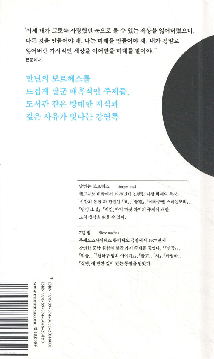 보르헤스는 1980년대 말 국내에 포스트모더니즘 문학이 소개되면서 본격적으로 주목을 받기 시작했다. 단편소설집 『픽션들』이 꼭 읽어야 할 필독서로 꼽히지만, ‘어려운 작가’라는 수식어가 항상 따라붙었다. 2000년대 시작된 ‘인문학 다이제스트’ 열풍에서도 한 발짝 빗겨 서 있던 신비의 거장, 보르헤스. 그를 쉽게 읽고자 하는 독자들의 기대에도 불구하고, 진리와 중심을 부정하는 보르헤스의 사유는 한 문장으로 수렴될 수 없었고 그의 언어에 주석을 달면 달수록 옥상옥(屋上屋)이 되는 현상을 피하기 어려웠기 때문이다. ‘나는 일생을 표류하면서 살았고, 조언할 말은 한마디도 없다.’ 만년의 보르헤스에게 젊은이들을 위해 조언을 한마디 해 달라고 요청했을 때 그는 이렇게 말했다. 스스로 시대의 멘토가 되기를 거부했던 자유경의 목소리는 어떻게 그의 작품을 읽어야 하는지 오늘날의 우리에게도 중요한 힌트를 준다. ‘보르헤스 논픽션 전집’은 그런 의미에서 보르헤스를 만나고자 하는 이들에게 가장 유용한 지도가 될 것이다. 한 번쯤 『픽션들』, 『알레프』를 펼쳐 들었으나 복잡한 표식과 난해한 상징에 완독을 포기했던 독자들이라면, 먼저 논픽션을 만나 보자. 청년 보르헤스의 사유가 태동하는 시기부터 지적 자만심을 숨기지 못하는 패기만만한 장년기를 지나 자신만의 소우주를 탄생시키는 완숙기까지, 그의 모든 여정을 담았다. 이 사유의 지도를 통해, 픽션 속 모든 장애물은 보르헤스의 미학적 토대 위에 세워진 눈부신 랜드마크였음이 드러난다. “가령 「틀뢴, 우크바르, 오르비스 테르티우스」에서 보르헤스는 “거울과 부권(父權)은 가증스러운 것이다. 그것들은 눈에 보이는 세계를 증식시키고, 분명하게 그런 사실을 보여 주기 때문이다.”라고 말한다. 우리는 이에 대한 보르헤스의 개인적인 설명을 ‘7일 밤’의 「악몽」에서 찾을 수 있고, 왜 그가 그토록 악몽이나 꿈 혹은 거울에 집착하게 되었는지 알게 된다.” ―보르헤스 논픽션 전집 3 『말하는 보르헤스』 작품 해설 중에서 그동안 소수 독자들의 전유물로 여겨졌던 보르헤스. 그러나 이제는 당신도, 이제껏 누구도 발견하지 못한 풍부한 상징과 형형한 의미의 편린을 홀로 목격하는 ‘보르헤스적 경험’의 주인이 될 수 있다. 만년의 보르헤스를 뜨겁게 달군 매혹적인 주제들, 도서관 같은 방대한 지식과 깊은 사유가 빛나는 강연록 ■ 그의 육성이 생생하게 살아 있는 1977년, 1978년 두 강연의 기록 1부 「말하는 보르헤스」는 벨그라노 대학에서 1978년에 특강한 ‘책’, ‘불멸’, ‘스베덴보리’, ‘탐정소설’, ‘시간’이라는 다섯 가지 주제를, 2부 「7일 밤」은 1977년에 부에노스아이레스 콜리세오 극장에서 강연한 ‘『신곡』’, ‘악몽’, ‘『천하루 밤의 이야기』’, ‘불교’, ‘시’, ‘카발라’, ‘실명’이라는 일곱 가지의 주제를 묶었다. 이 열두 가지는 전 생애에 걸쳐 보르헤스를 매료시킨, 또 그의 작품 전체를 지배했던 커다란 주제들이다. 그는 「불멸」에서 “누군가가 적을 사랑하고자 할 때마다 불멸의 그리스도가 나타납니다. 그 순간 그는 그리스도입니다. 단테나 셰익스피어의 시구를 되뇔 때마다 우리는 어느 정도 그 시구를 창조했던 순간의 셰익스피어나 단테가 됩니다.”라며 오랜 종교적 사유와 고전을 빗대어 불멸의 가능성을 정리하고, 「탐정소설」에서 “너무나도 혼란스러운 이 시대에 변변찮으나마 고전적 가치를 유지하는 것이 있습니다. 바로 탐정 소설입니다.”라며 장르의 개척자 애드거 앨런 포와 탐정 소설 장르가 왜 훌륭한지를 조목조목 펼친다. 「시간」에서는 성 바울의 “나는 날마다 죽음과 마주하고 있습니다.”라는 말을 인용하며 시간의 형이상학적 문제를 탐구하고, 「시」에서는 “아름다움은 도처에 있습니다. 그리고 아마도 우리 삶의 순간마다 존재할 것입니다.”라며 형이상학이 아닌 물리적인 아름다움으로서 그가 느끼는 문학의 면면을 함께 읽는다. 그는 강연을 통해 자신의 작품 저변에 깔려 있는 핵심적인 주제들이 어떤 의미를 지니고 있는지를 보다 명징하게 설명한다. 역자 송병선은 “보르헤스의 강연집은 헤아릴 수 없는 문학적·역사적 가치가 있는 증언일 뿐만 아니라 보르헤스의 세계로 들어가는 입문서”라고 이 책을 소개한다. ■ 우리 시대 영원한 사서, 책은 그의 행복 그 자체였다 부에노스아이레스의 시립 도서관 사서부터 아르헨티나 국립도서관 관장까지, 도서관과 떼려야 뗄 수 없는 보르헤스의 인생은 책과 깊은 관계를 맺는다. 천국을 도서관으로 상상하기도 했던 그답게 첫 번째 강연 주제 역시 ‘책’이다. 그는 책을 읽는 것은 행복의 한 형태라며 “오래된 책을 읽는 것은 그 책이 쓰인 날부터 우리가 읽는 날까지 흘러간 모든 시간을 읽는 것과 같습니다.”라고 말한다. 실제로 방대한 분량의 독서를 통해 얻은 경험은 그의 진짜 삶과 다름없었다. 그는 자신의 악몽이 항상 미로나 거울로 나타나는 것을 고백하며 문학사에 길이 남을, 꿈에 관한 미학적 표현들을 들려준다. 『신곡』의 장면들을 소개하며 문학의 절정과 감동을 표현한