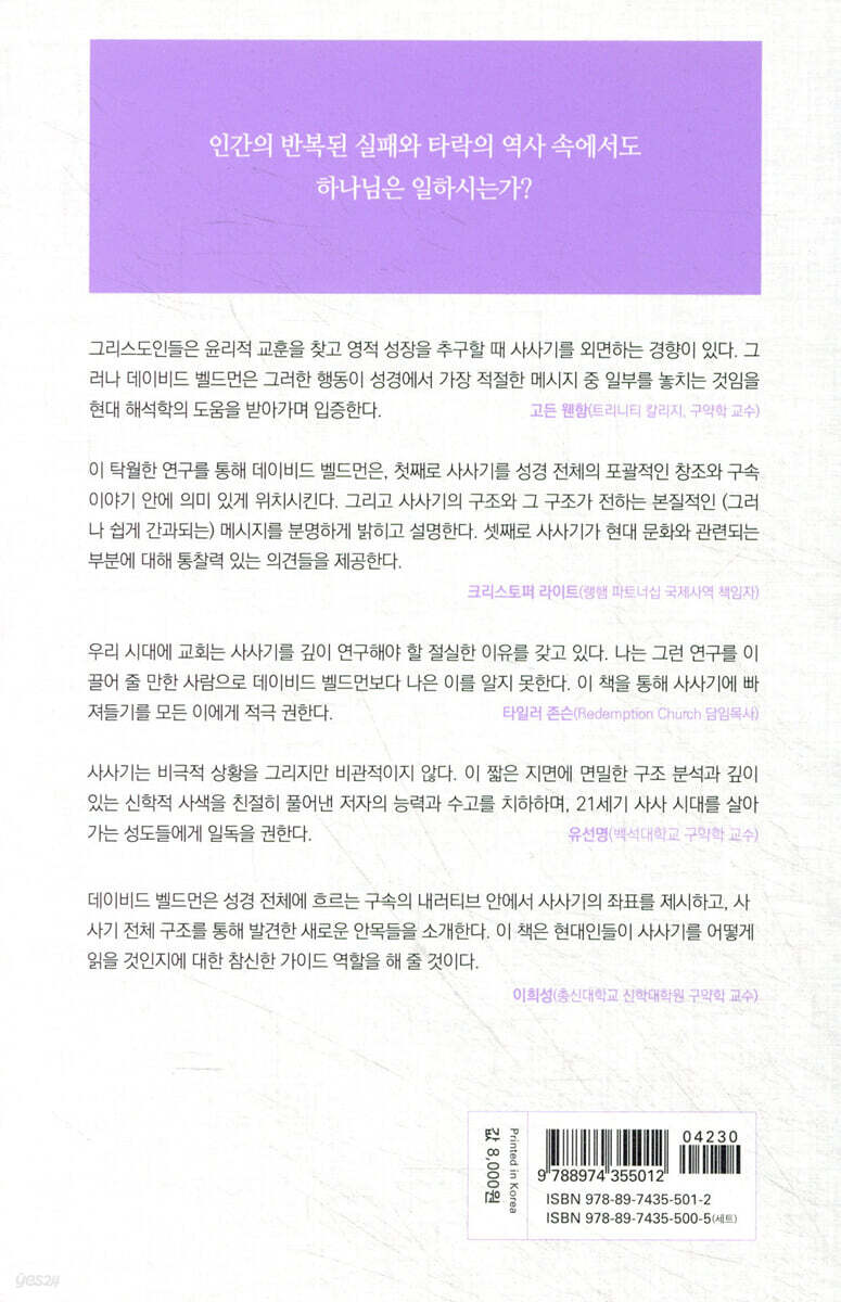 사사 시대의 (그리고 우리 시대의!) 문제는 왕의 부재가 아니라 왕의 유기다. 그러나 왕이신 하나님께서 자신을 버린 백성을 끝까지 붙드시기에, 사사기는 비극적 상황을 그리지만 비관적이지 않다. 이 짧은 지면에 사사기의 면밀한 구조 분석과 깊이 있는 신학적 사색을 친절히 풀어낸 저자의 능력과 수고를 치하하며, 21세기 사사 시대를 살아가는 성도들에게 일독을 권한다. - 유선명 (백석대학교 구약학 교수)