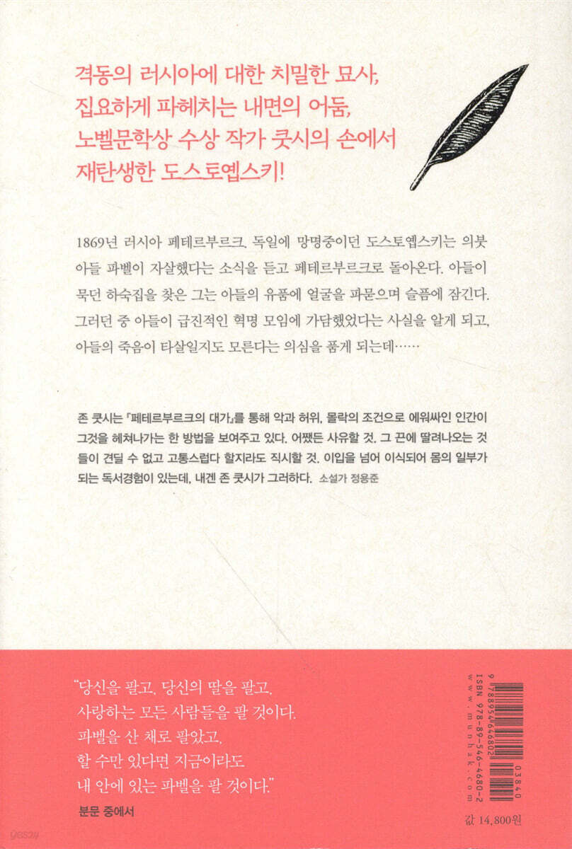 도스토옙스키를 통해 19세기 러시아의 정치적 소용돌이를 그려냈다. 쿳시의 높은 위상을 더욱 격상시키기에 충분한, 충격적이고도 황홀한 작품. - [퍼블리셔스 위클리]