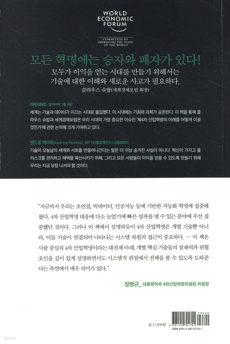 세계는 기술과 데이터가 이끄는 시대로 돌입했다. 이 시대에는 기회와 과제가 공존한다. 이 책을 통해 클라우스 슈밥과 세계경제포럼은 우리 시대의 가장 중요한 이슈인 ‘4차 산업혁명의 미래를 어떻게 이끌 것인가’에 관한 논의에 크게 기여하고 있다. - 마윈 (알리바바 그룹 회장)