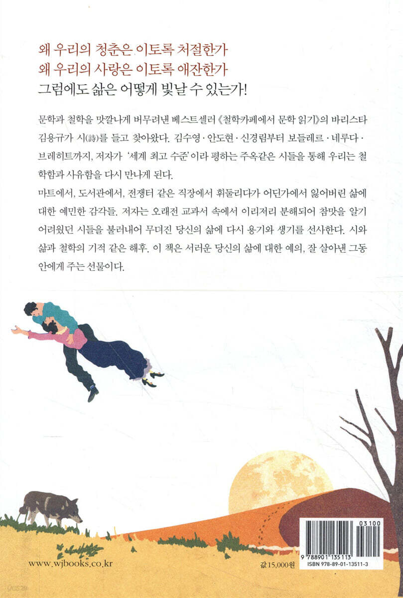- 시(詩)를 통해 청춘의 고단함을 위로하다 한때 시집이 베스트셀러를 차지하는 때가 있었다. 전 세계에서 우리나라만큼 시집이 잘 팔리는 나라도 없을 거라고 했다. 그러나 지금 그 자리는 힘들고 팍팍한 삶을 살아내는 기술을 가르쳐주는 자기 계발서, 독하게 공부하고 치열하게 살아남은 성공 스토리가 자리를 채우고 있다. 또 어느 때부터인가 요즈음 젊은이들에게는 더 이상 비유와 은유가 통하지 않는 시대가 되었다고 말하는 사람들이 늘어났다. 보다 직설적으로 의사를 전달하고, 확실하게 자신을 표현해야만 하는 것은 시대의 정의가 되었다. 시와 소설을 통해 공감하고 위로받고 스스로 치유하는 것 대신, 인문학을 통해 인간의 삶과 존재의 가치에 대한 깊은 고민에 빠져드는 대신 ‘이렇게 해야 살아남을 수 있어’, ‘이렇게 해야 성공할 수 있어’라는 직접적인 말들만이 필요할 뿐이다. 이 모든 것의 시작이 우리 곁에서 시(詩)가 사라진 즈음이 아닐까? 여기! 인문학과 문학의 텍스트를 내가 살고 있는 ‘세계의 기획’이자 ‘실존의 기획’으로 이해하려는 철학자가 있다. 문학 작품을 통해 철학하는 방법, 세계를 이해하는 방법을 알려주는 참신한 시도로 각광받은 베스트셀러 《철학카페에서 문학 읽기》의 바리스타 김용규가 시(詩)를 들고 찾아왔다. 김수영․안도현․신경림부터 보들레르․네루다․브레히트까지, 저자가 ‘세계 최고 수준’이라 평하는 주옥같은 시들을 통해 우리는 철학함과 사유함을 다시 만나게 된다. 저자는 아직 우리에게 시가 남아 있다는 것을 축복으로 여긴다. 《철학카페에서 시 읽기》는 우리의 삶을 노래하고, 사랑을 사랑했던 시인들의 90여 편의 시를 통해 독자들에게 시와 삶과 철학에 대해 말을 건다. 시를 이리저리 분해하는 것에 익숙한 우리들에게 저자는 시를 즐기는 방법을 바꿔보라고 권한다. 대신에 시가 인간 존재에게 던지는 질문에 주목하라고 말한다. 인생의 나침반을 찾기 위한 시 읽기 - ‘텍스트 앞에서의 자기 이해’ 《철학카페에서 시 읽기》에서 저자는 평론가들처럼 ‘시에 담긴 시인의 은밀한 의도’를 알아내거나 ‘시를 학문적으로 분석해 평가’하려는 게 아니라는 것을 분명하게 밝힌다. 대신에 철학의 눈으로 시를 새롭게 읽어보라고 권한다. 철학이론을 도구 삼아 작품을 해석함으로써 드러나는 삶의 지표와 방향성을 찾는 것이 목적이라는 것이다. 궁극적으로 ‘텍스트 앞에서의 자기-이해’, ‘텍스트를 통한 자기발전 가능성’을 이루는 작업이라고 말한다. 그의 이러한 생각은 리쾨르의 《철학적 신학적 해석학》에 나오는 다음의 말로 압축할 수 있다. “텍스트를 해석한다는 것은 내가 살 수 있는 ‘세계의 기획’이다. ‘세계의 기획’은 텍스트 뒤에 숨어 있는 의도를 드러내는 것이 아니라 텍스트 앞에서 작품을 전개하고, 발견하고 드러내는 것이다. 그러므로 이해란 ‘텍스트 앞에서의 자기-이해’이다. 이것은 텍스트를 향해 고유하게 한정된 이해능력을 주입시키는 것이 아니라 텍스트 앞에 나서는 것, 텍스트로부터 더 넓어진 자기를 얻는 것, 곧 세계기획에 진정 합당한 적응으로서의 실존기획을 말한다. 주관이 이해를 구성하지 않는다. 더 정확히 말하자면 자기는 텍스트의 사실에 의해 구성된다.” 우리가 알아왔던 시를 이러한 관점으로 다시 들여다볼 때 시는 지금까지와는 또 다른 이야기를 들려준다. 예를 들어 저자는 정호승 시인의 <수선화에게>에서 그 어떤 철학자보다 뛰어난 외로움에 대한 해석을 읽어낸다. 수선화가 상징하는 ‘나르시시즘’과 관련한 신화적인 의미 대신 외로워서 너무나 외로워서 물에 비친 자기 모습이라도 보고 싶어 물가를 떠나지 못하는 수선화를 표현한 시인의 감성에 찬사를 아끼지 않는다. 그리고 이것을 이 세상에 혼자 내던져졌다는 ‘실존론적 상황’에서 우러나온 것이라는 것을 간파한다. 자연스레 젊은 시절 실존주의 철학에 몰두했던 최승자 시인도 등장한다. 최승자의 <겨울에 바다에 갔었다>, <외로움의 폭력>, <외롭지 않기 위하여> 등의 시를 통해 실존의 문제와 치열하게 전투를 벌였던 시인에 대한 깊은 이해를 드러낸다. 실존적인 문제를 해결하기 위한 해답은 최승자의 시에서 나오는 ‘손들엇 탕탕!’에서 찾는다. 하이데거는 최승자 시인이 말하는 이 같은 처형 작업을 “양심을-가지려고-원함(Gewissen-haben-wollen)”이라고 규정했습니다. 그리고 이에 대해 다음과 같이 설명했지요. 인간은 일상이라는 퇴락한 삶이 제공하는 친숙하고도 편안한 생활에 젖어 있다가 ‘자신이 퇴락한 삶을 살고 있다’는 ‘양심의 부름(Ruf des Gewissens)’을 듣습니다. 그리고 자신에게 ‘탓(Schuld)’이 있다는 죄의식 속에서 스스로 뉘우치고 ‘양심을-가지려고-원함’으로써 비로소 자기 자신의 ‘본래적 삶’으로 돌아가게 됩니다. - (본문 157~171쪽 참조) ‘자기’를 사랑하는 방법으로서의 시 읽기 - 삶을 사랑하는 노래들, 사랑을 사랑하는 노래들 놀라울 만큼 예민한 감각으로 우리가 발 딛고 있는 삶의 대지, 우리가 숨 쉬고 있는 역사적 토양에서 들려오는 고요하지만 진실한 소리를 듣고, 그