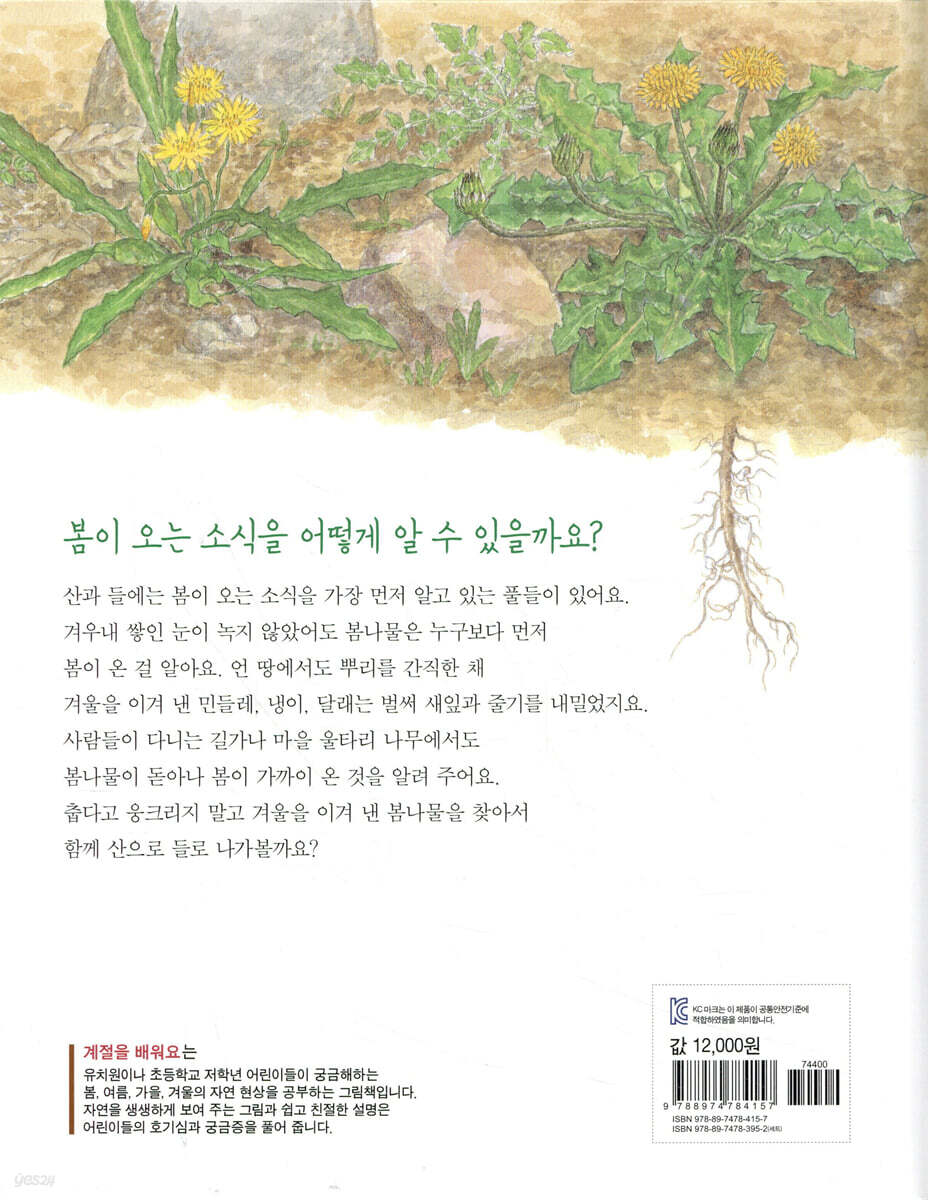 민들레는 산과 들에서 가장 흔히 볼 수 있는 봄나물이에요. 뿌리잎을 넓게 펼쳐 햇빛을 모으고, 뿌리는 차가운 땅 속에서도 단단하게 여물어요. 민들레는 어린잎을 뜯어 나물로 먹고, 뿌리는 약으로도 쓰지요. 냉이는 뿌리에 영양분이 많아 꽃줄기가 올라오기 전에 뿌리째 캐서 먹어요. 향긋한 냉잇국 한 그릇이면 긴 겨울에 지친 몸도 상쾌하게 깨어나지요. 봄나물은 산과 들뿐만 아니라 우리 주변에서도 쉽게 찾아볼 수 있어요. 사람들이 다니는 길가나 아파트 화단, 마을 울타리에 피어 있는 작은 풀들 가운데에도 우리가 먹을 수 있는 봄나물들이 많이 자라고 있지요. 자, 이제 어린이 여러분도 기지개를 펴고 밖으로 나가 우리 주변에는 어떤 봄나물이 자라고 있는지 함께 찾아볼까요? |